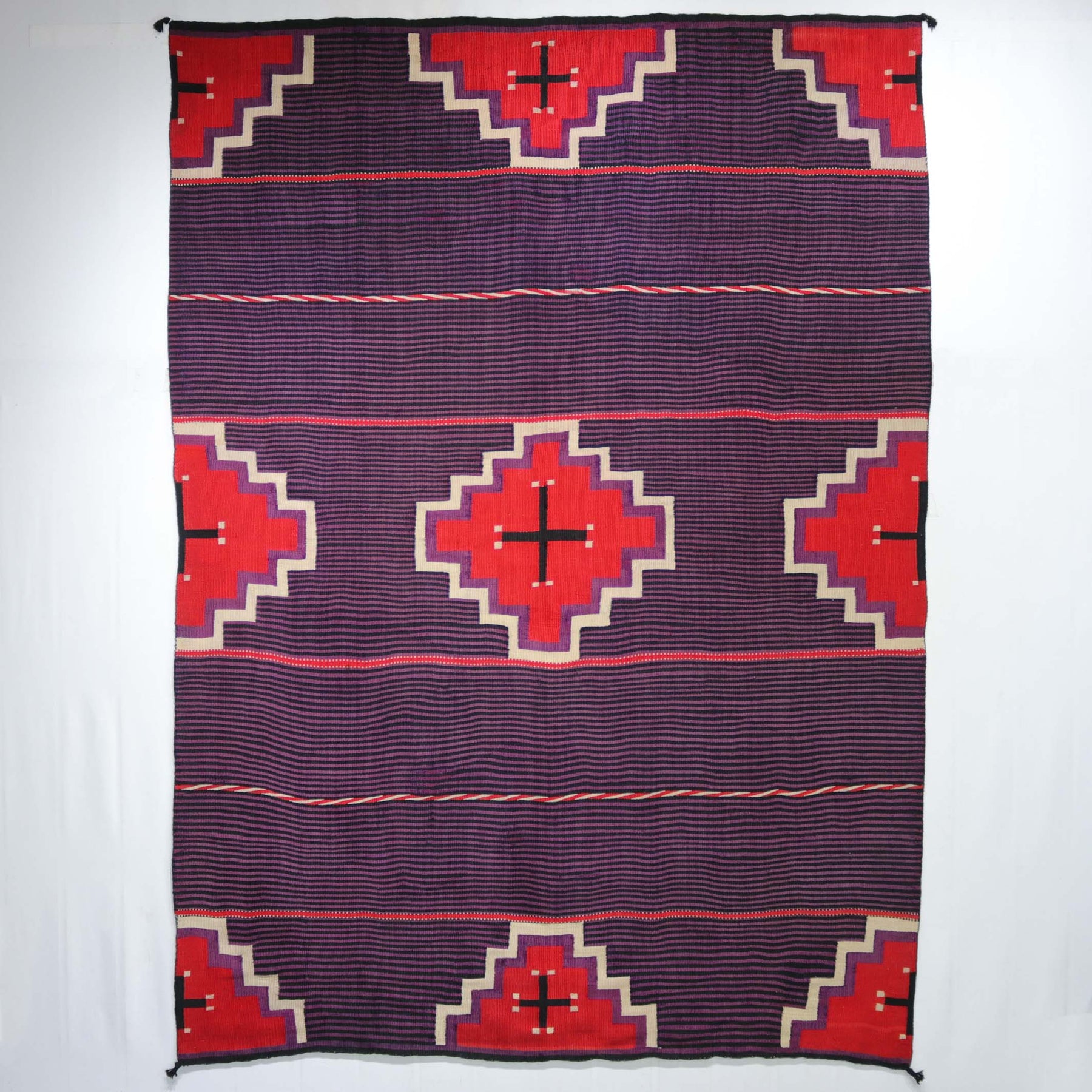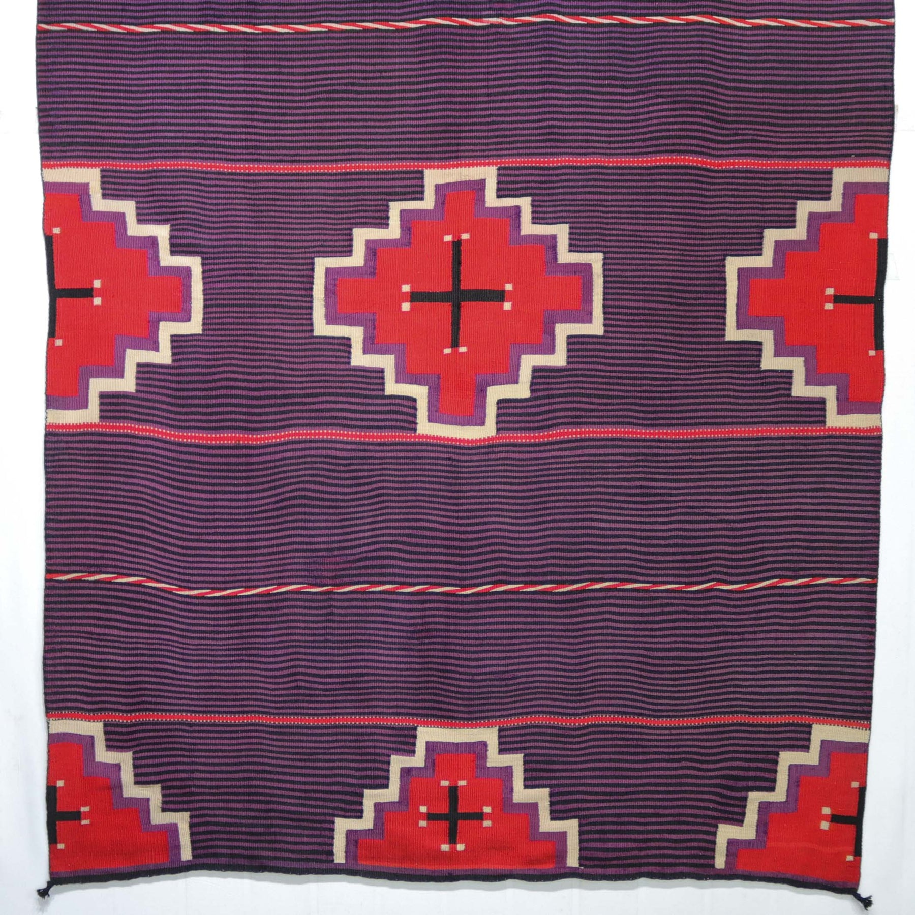 A striking example of late 19th-century Navajo weaving, this Moki serape blanket dates to the 1890s and is woven entirely from Germantown wool. The deep purple and black striped field—a hallmark of classic Moki design—is accented by bold stepped red and white motifs arranged in a balanced horizontal layout. These vivid elements frame black crosses with white spirit dots.