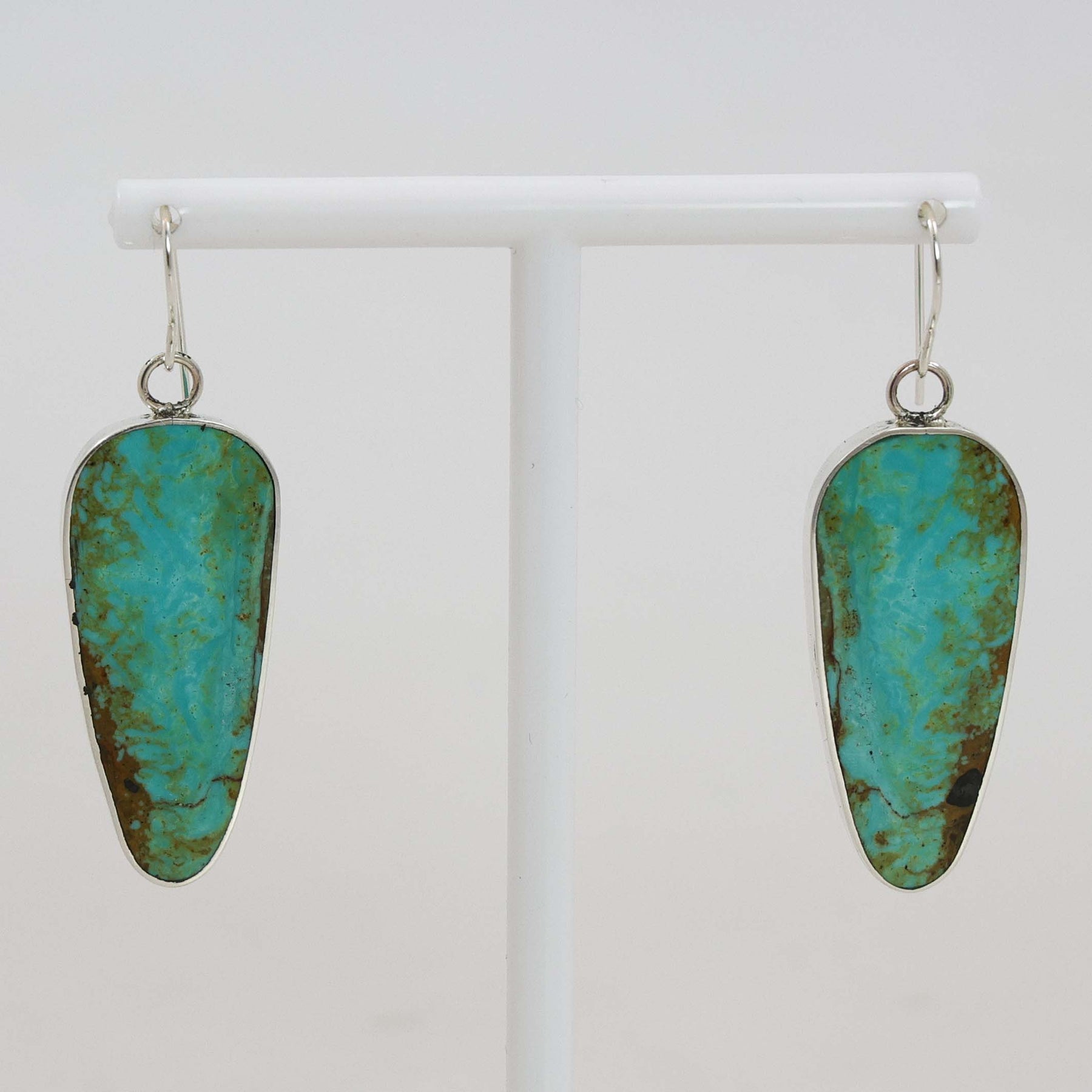 Sterling Silver French Hook Earrings with Hand-Cut Stabilized Turquoise Slabs and a Sterling Silver Border.