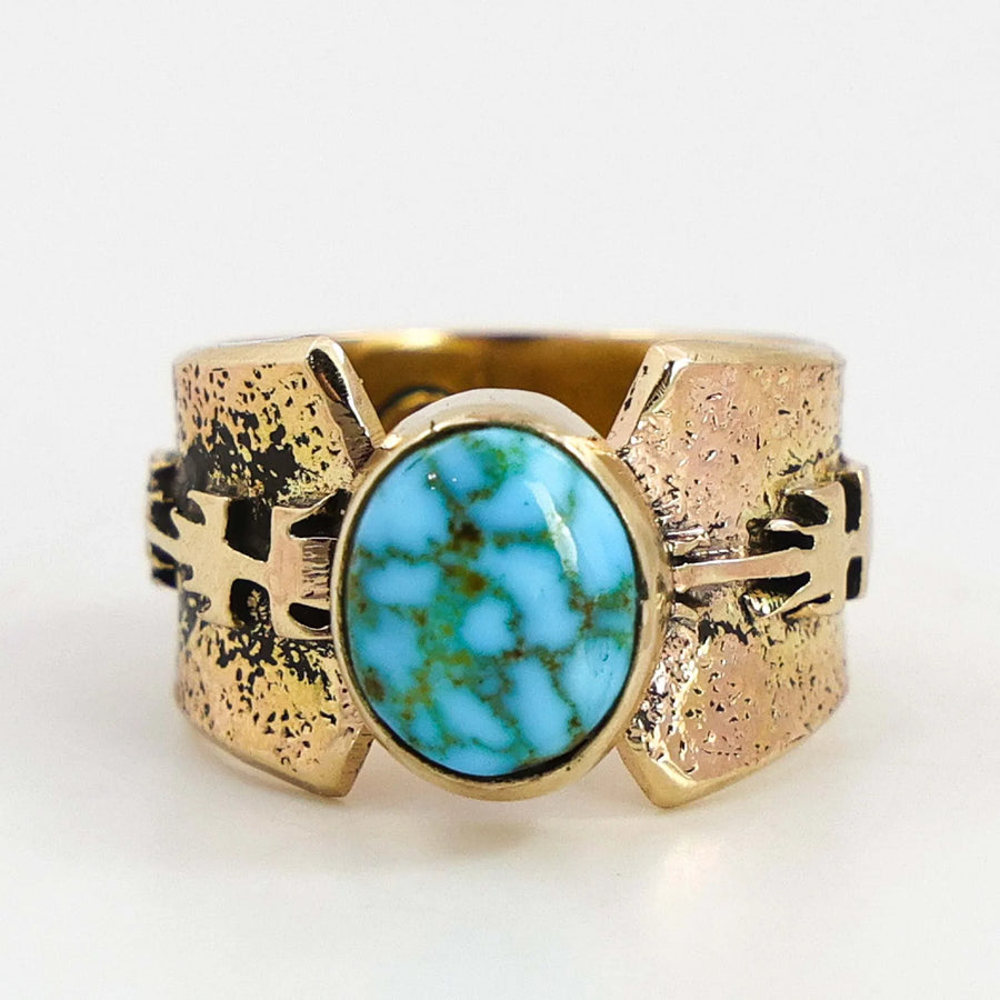 Tufa Cast 14k Gold Ring with Raised Applique Designs on Band and set with Natural Kingman Turquoise from Arizona.