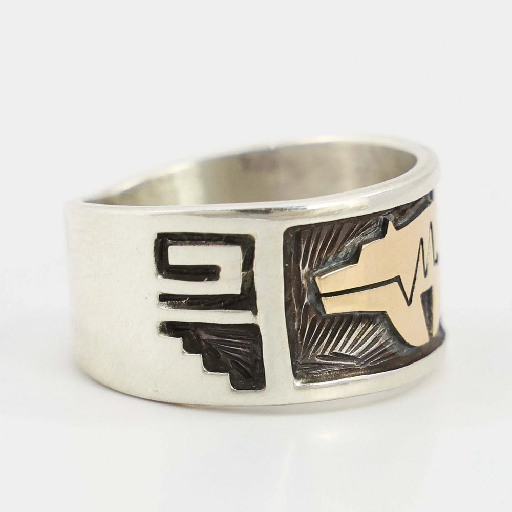 Sterling Silver Ring with Overlaid Designs and Featuring a 14k Gold Bear with a Heartline.