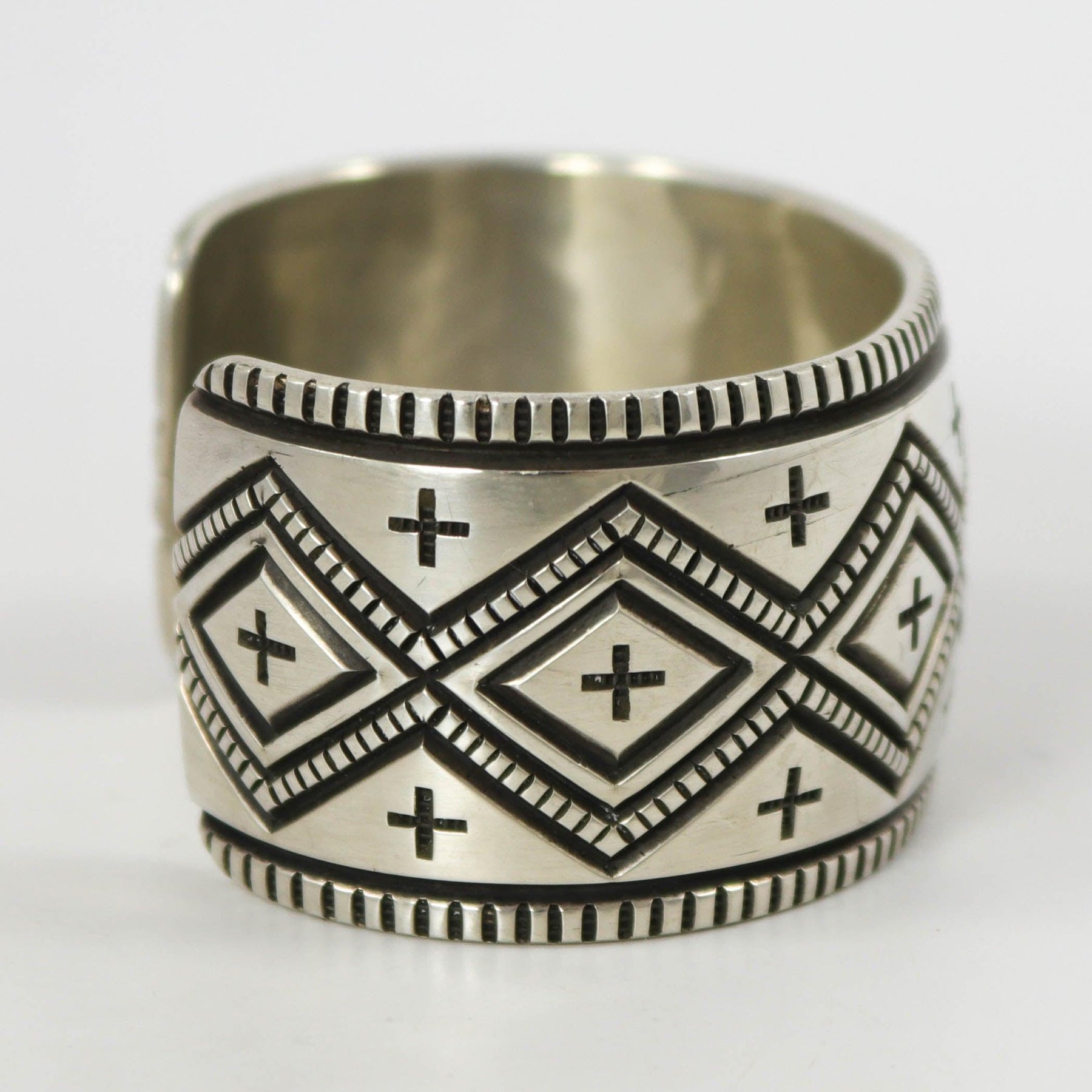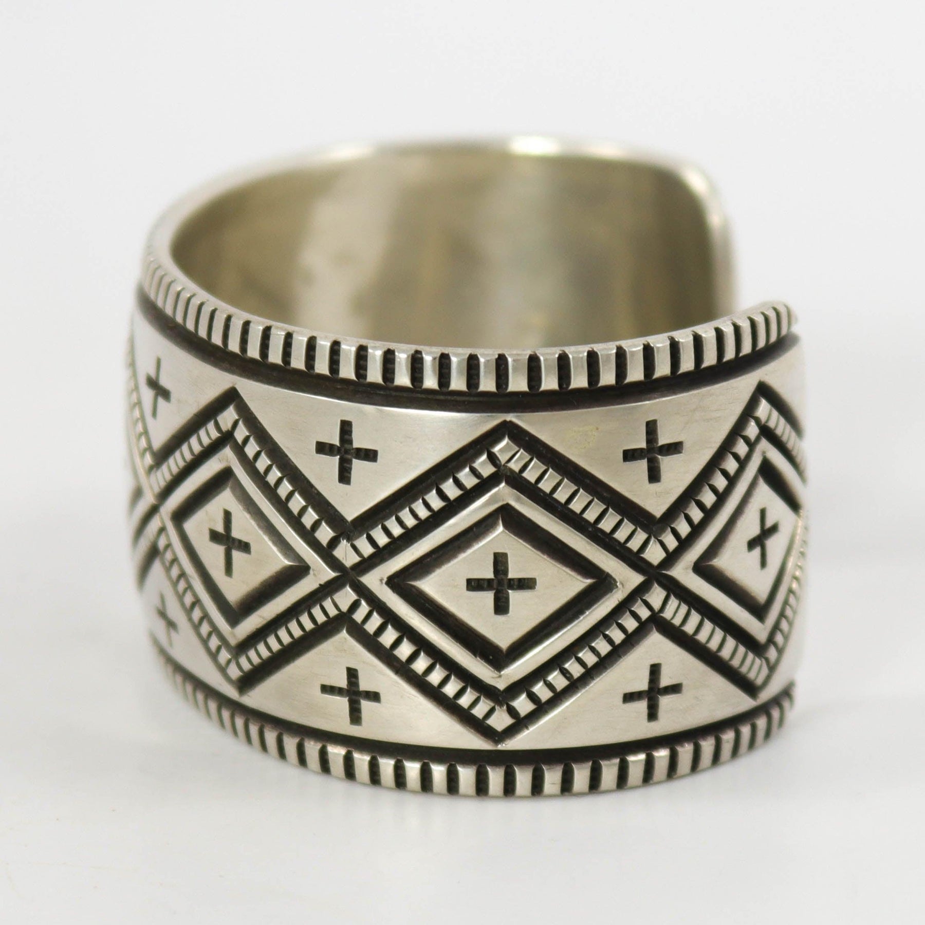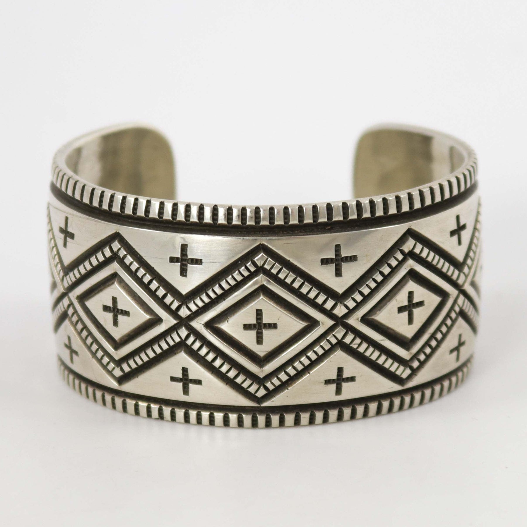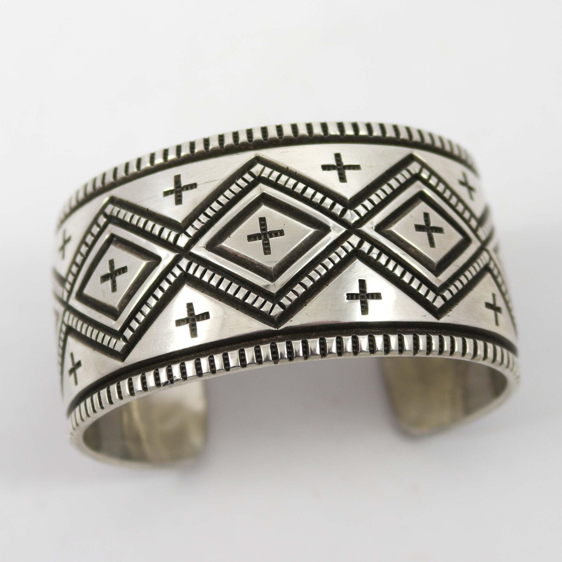Sterling Silver Cuff Bracelet with Hand Stamped Designs including a Diamond Pattern and Four Direction Crosses.