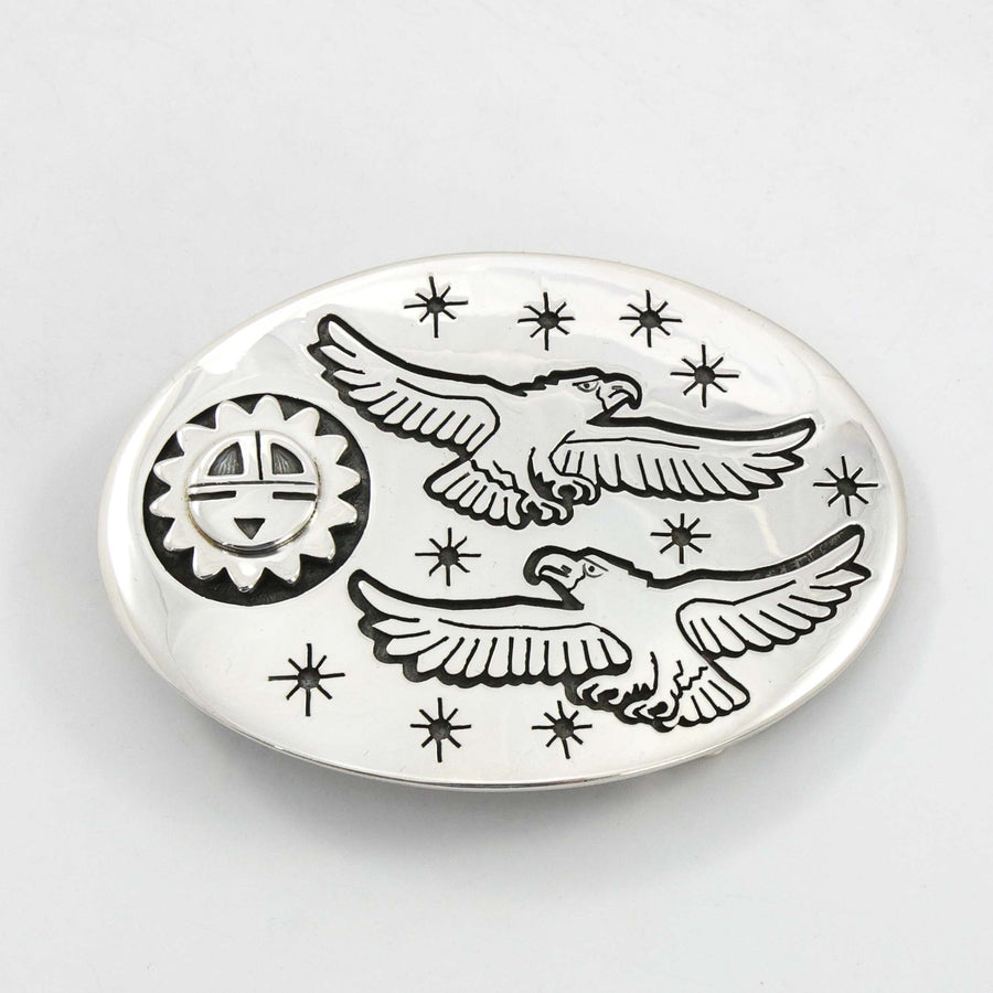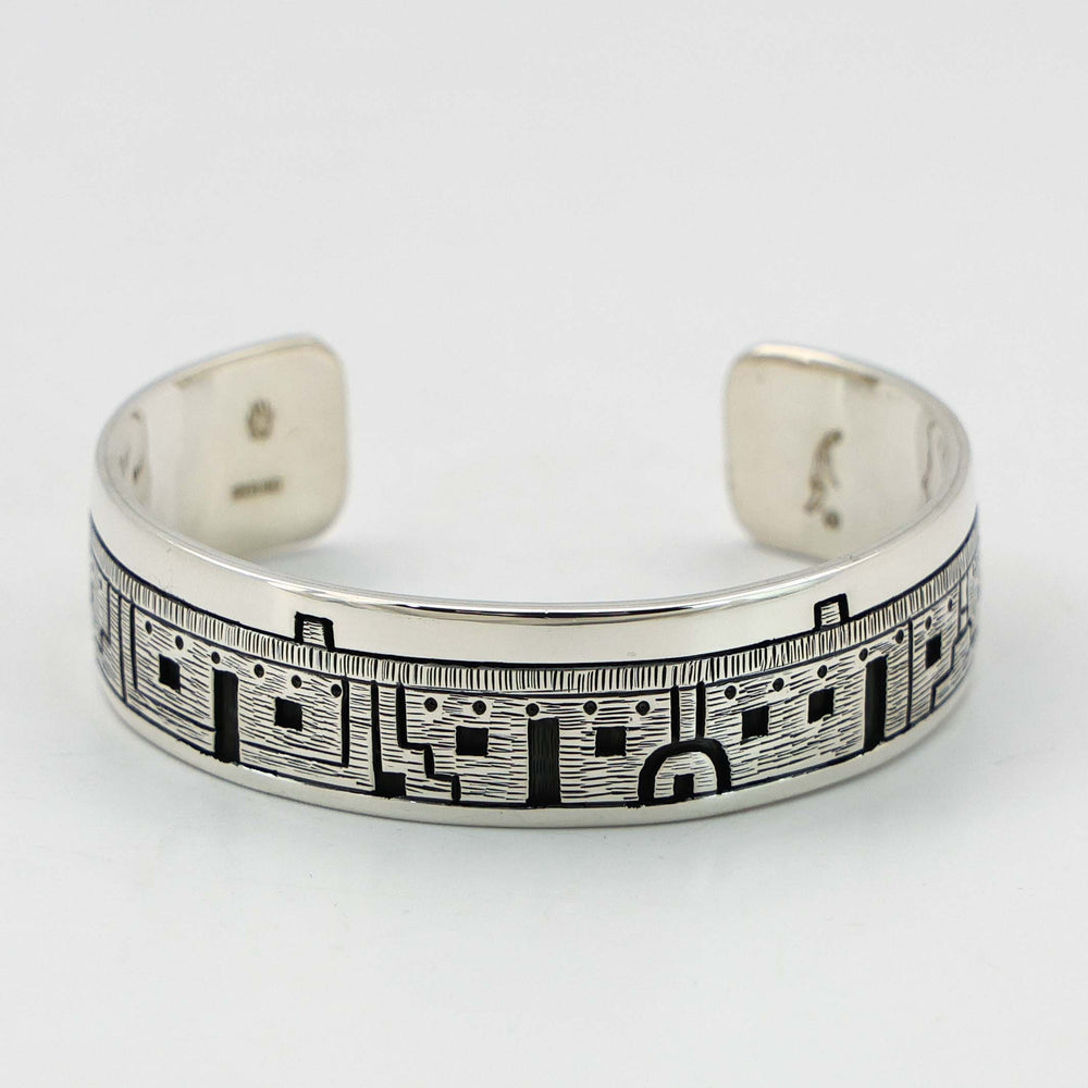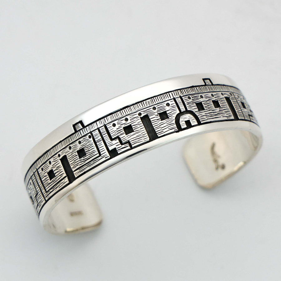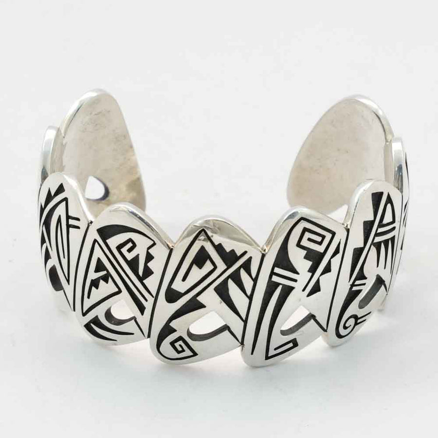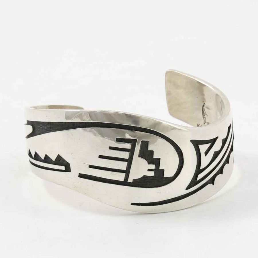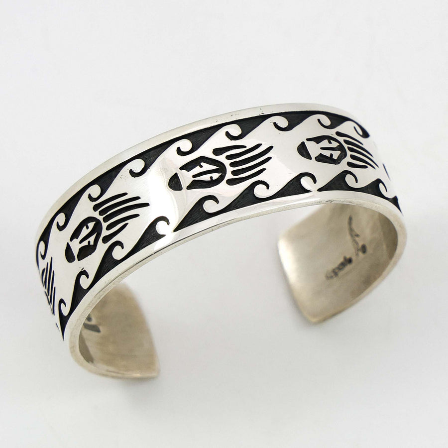 The Hopi are one of the oldest living cultures in documented history; they migrated from the south to Arizona in the 12th century. The Hopi tribe is located in Northeastern Arizona on 2,500 square miles in the middle of the Navajo Nation. Their land, called Hopitutskwa, is made up of 12 villages on three mesas. The Hopi tribe currently has around 20,000 enrolled members. Hopis are known for their colorful and traditional culture, centered around living the Hopi Way as peaceful and humble farmers in reverence of the land and its resources. Kachinas are central to their spirituality and culture. In silversmithing, Hopis are best known for their intricate overlay designs.