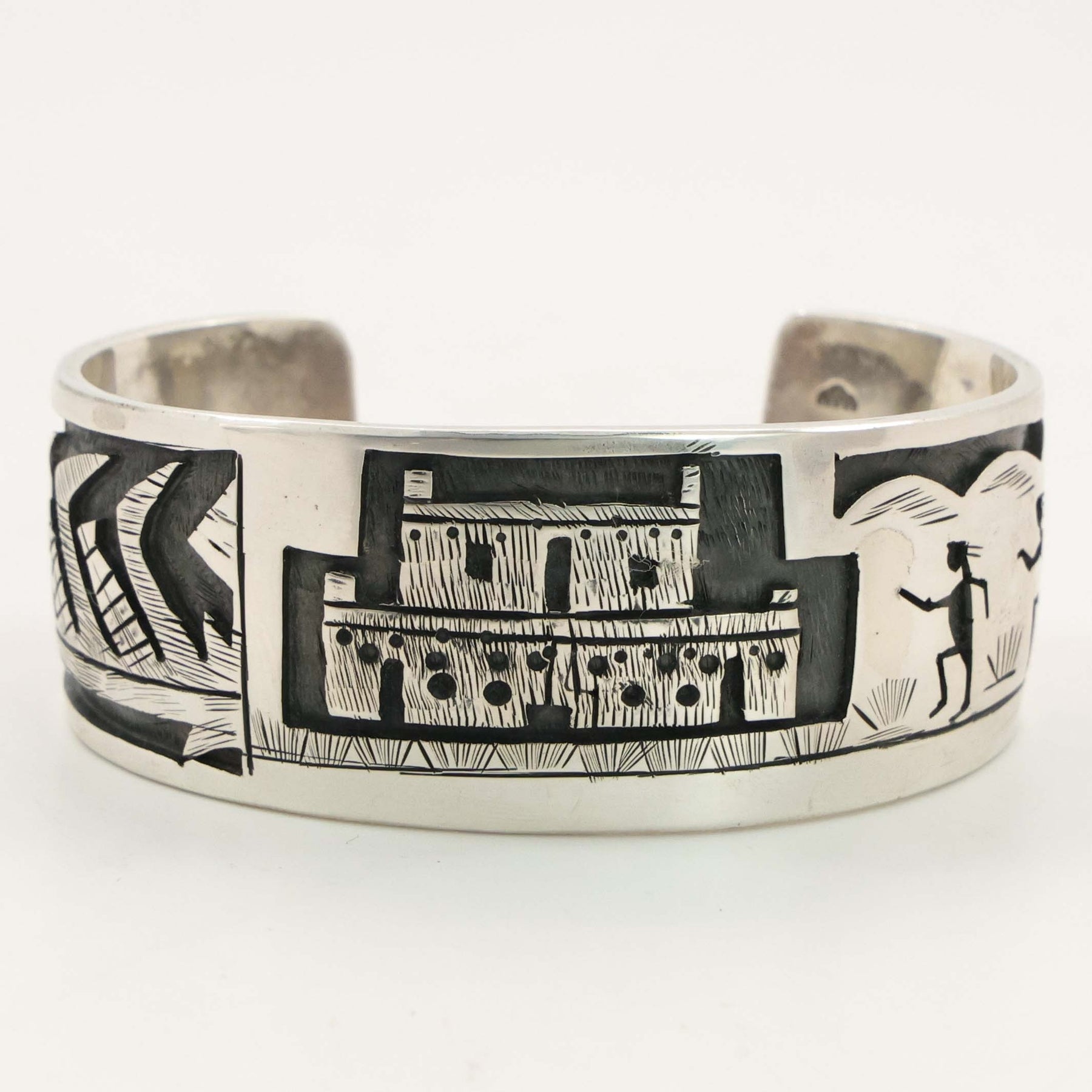 This sterling silver overlay bracelet by Victor Coochwytewa features a detailed Hopi village, cornstalk design, and a group of runners in motion. The imagery reflects traditional Hopi foot races, which are an important part of ceremony and cultural life. Made circa 2005, this piece was completed near the end of Victor’s life and is one of his last pieces. The work reflects his signature precision and symbolic clarity.