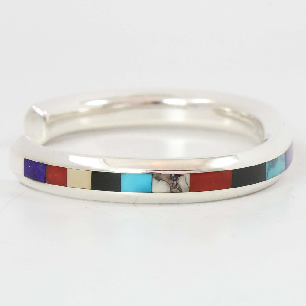 Mosaic Inlay is a type of lapidary where each stone is inlaid directly against the next stone. Cobbled Inlay is a type of Mosaic Inlay. The stones are inlaid against one another; however, they have an uneven, raised appearance- like that of a cobble stone street. Channel Inlay is a style where a silver, or gold, spacer separates each inlaid stone. This creates a different look where the metal creates a ‘grid’ around the stones.
