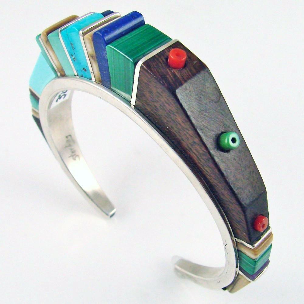 Sterling Silver Cuff Bracelet with High-Rise Cobbled Inlay using Turquoise, Coral, Lapis, Malachite, and Fossilized Mastodon Ivory.