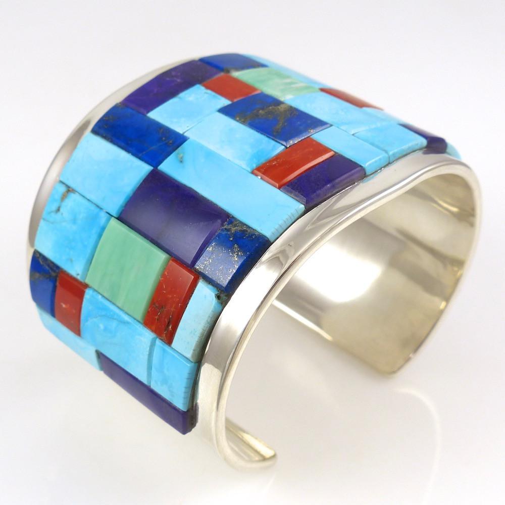 Sterling Silver Cuff Bracelet with Cobble Inlaid Coral, Lapis, Sugilite, Variscite and Natural Kingman Turquoise.