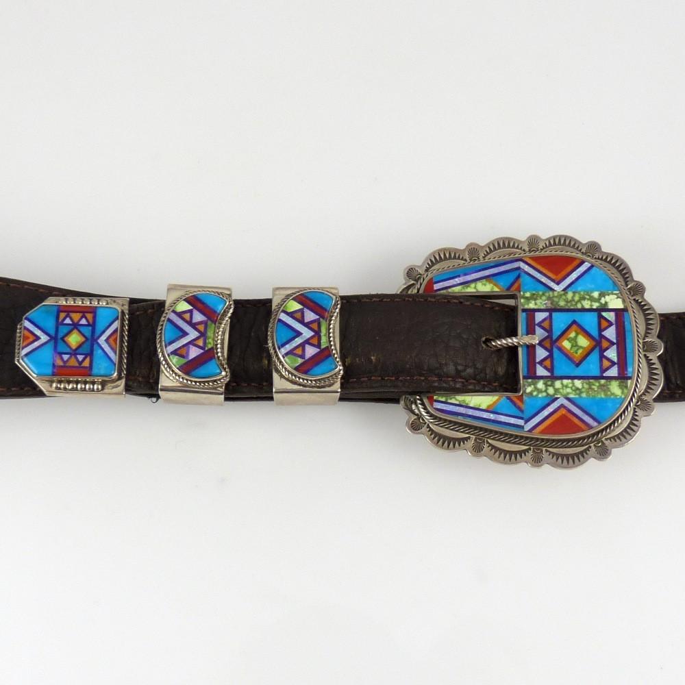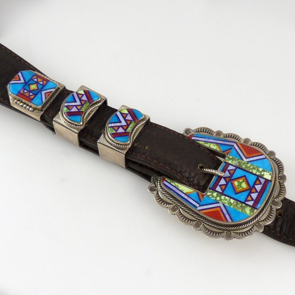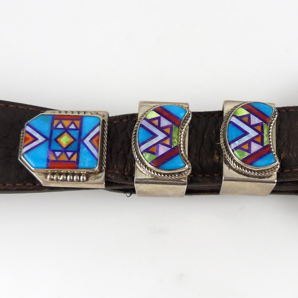 Sterling Silver Ranger Set with Two Keepers and a Belt Tip with Mosaic Inlaid Turquoise, Coral, Spiny Oyster Shell, Lapis, Opal, and Sugilite. This set has over 300 pieces of stone!
