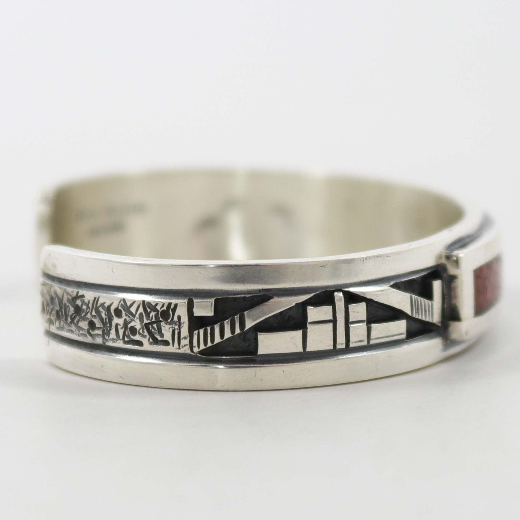 Sterling Silver Cuff Bracelet with Overlaid Designs and Coral Chip Inlay.