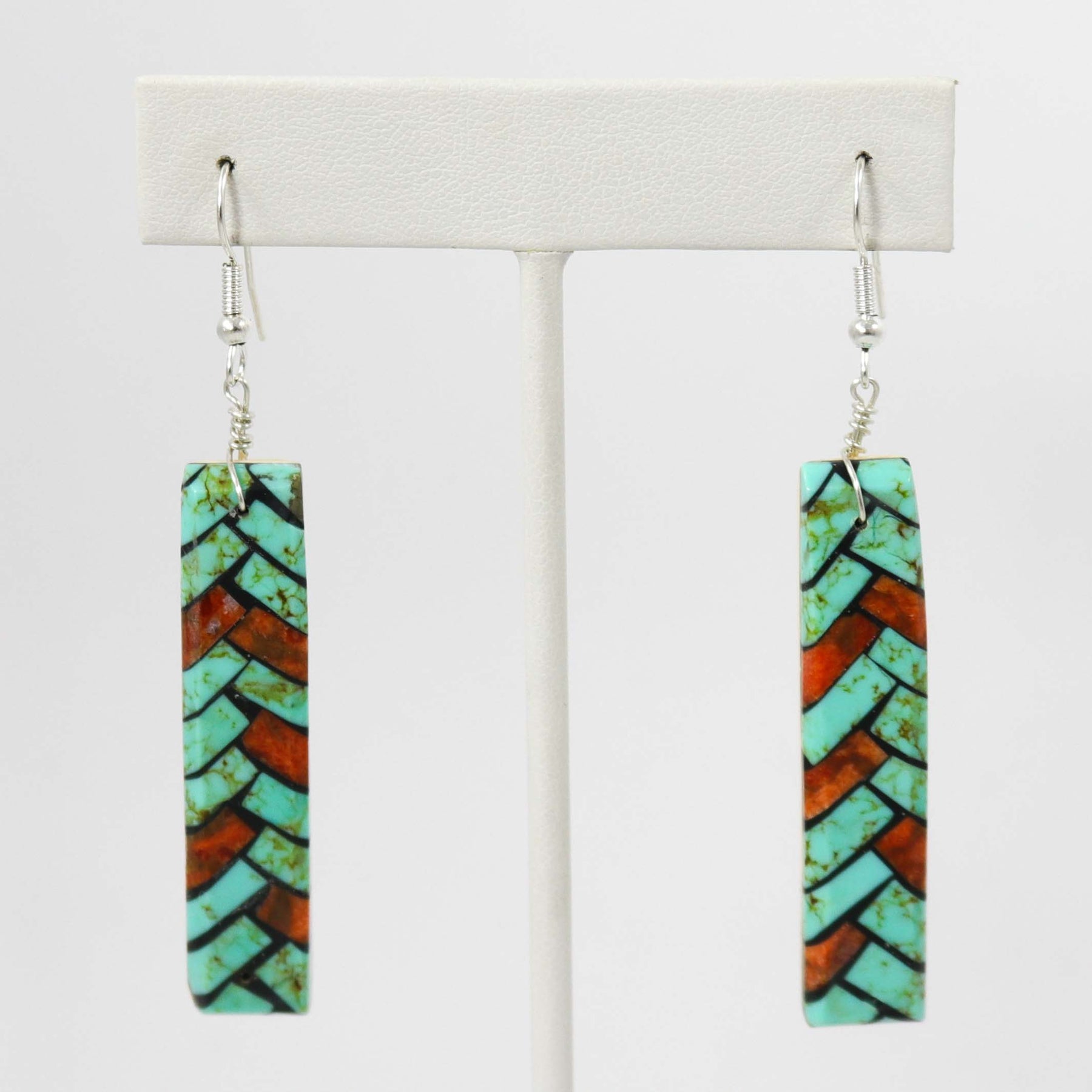 Sterling Silver French Hook Earrings with Inlaid Spiny Oyster Shell and Turquoise, Backed on Shell.