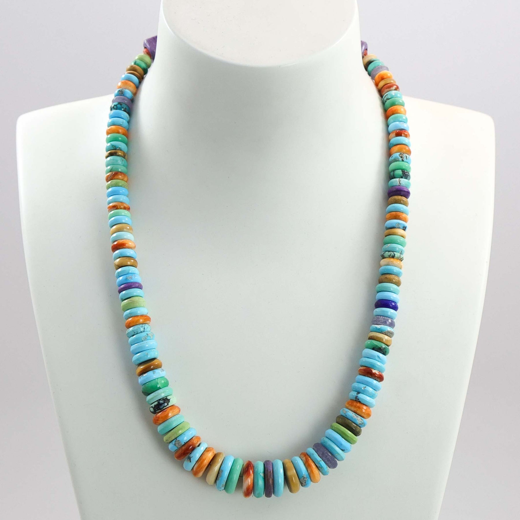 Single Strand Bead “Fiesta” Necklace with Hand-Rolled Beads made from Natural Sleeping Beauty Turquoise from Arizona, Natural Vista Grande Turquoise, Lepidolite, Fossilized Ivory, Lapis, Sugilite, and Spiny Oyster Shell. A sterling silver clasp finishes the necklace.
