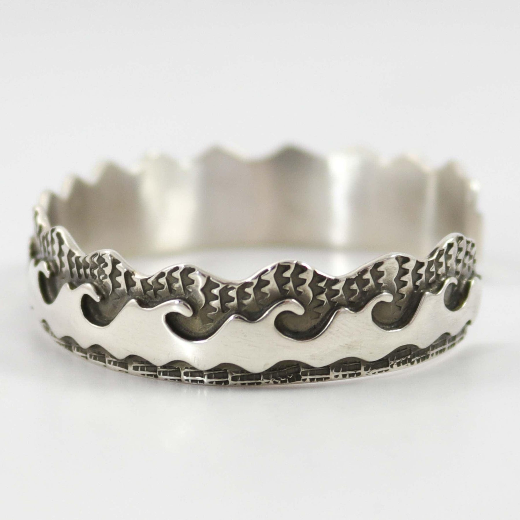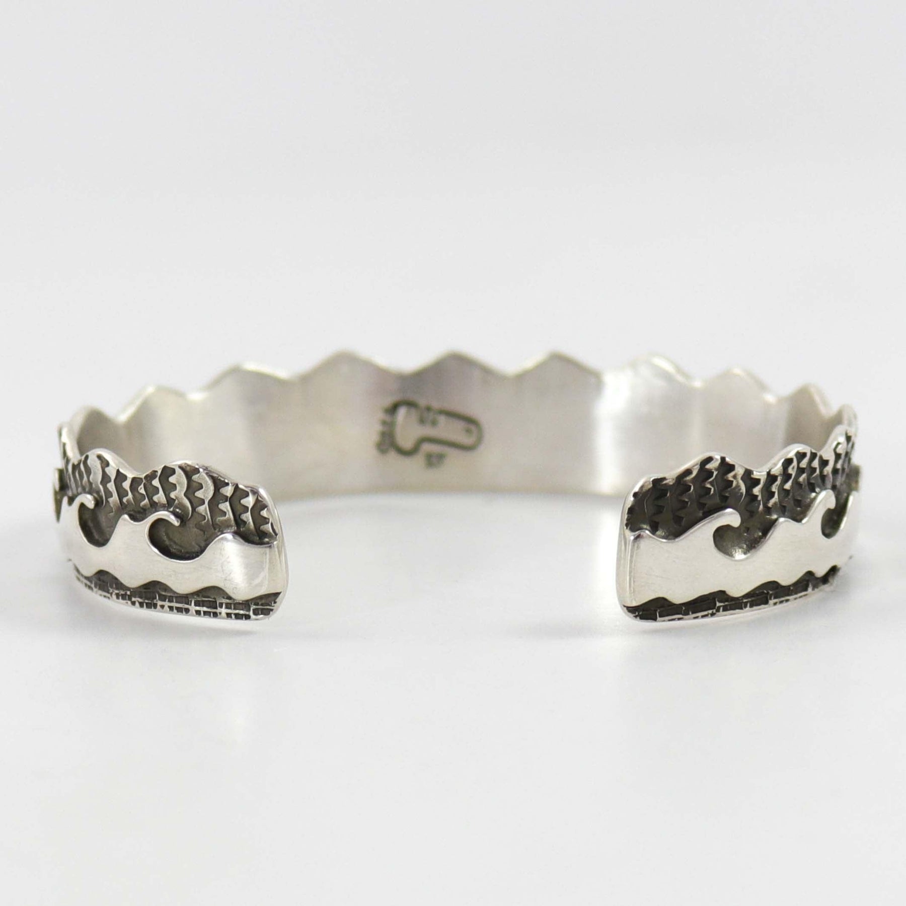 Sterling Silver Cuff Bracelet with an Overlaid “River’s Edge” Design. Jonah is Hopi and Quechan, from the Queetsan tribe. His passion as a Grand Canyon river runner inspires his designs.