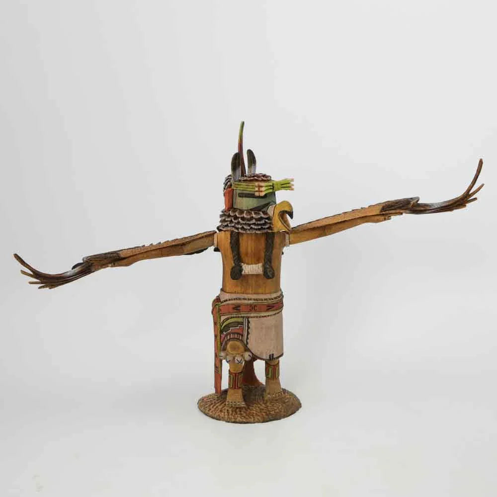 Central to Hopi religion, Kachinas are spirits of nature believed to live on the San Francisco Peaks (Nuva'tukya'ovi) near Flagstaff, Arizona. Hopi men embody the Kachina spirits during ceremonies that take place between Winter Solstice and mid-July. The Hopis believe these spirits enable them to live in harmony with nature, ensuring rain, crops, fertility, and good hunting. The Hopi men embody the spirits of these Kachinas by wearing masks and dancing in the plazas of the villages. The dolls, which are carved replicas of the dancers, are given to the children so that they may learn about their people's traditions. The art of carving Kachina dolls has evolved from the old-style blocklike figures into today's highly detailed, all-wood dolls with realistic form and action. Traditional, or Old-Style, Kachina dolls were simple carvings given to Hopi children to teach them about their culture and the Kachinas that would be visiting during the upcoming ceremony. Over time, Kachina dolls became more and more sophisticated and included bases for the dolls to stand on and showing the Kachina in ā€œactionā€- such as dancing or hunting. All Kachina dolls are carved out of the root of the Cottonwood tree. The Cottonwood tree’s vigorous roots travel far and deep in search of water. There is spiritual importance in this fact, as the Hopis are dry farmers in an arid part of Arizona and the search for water is of critical importance to their culture.
