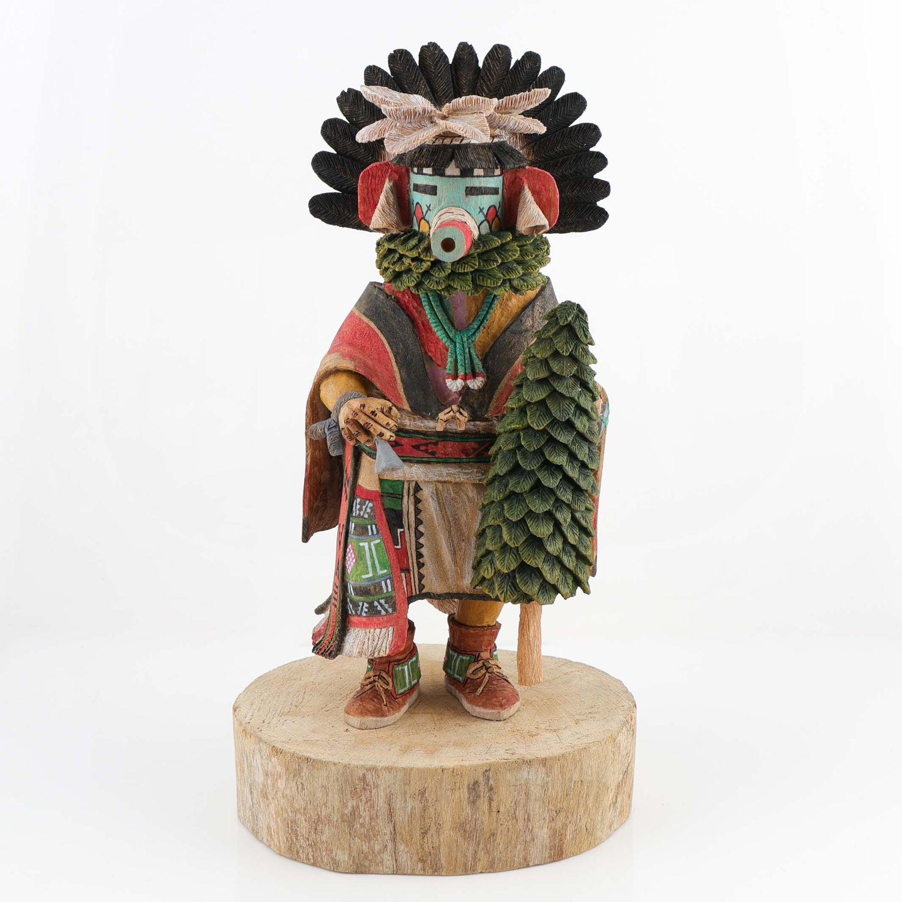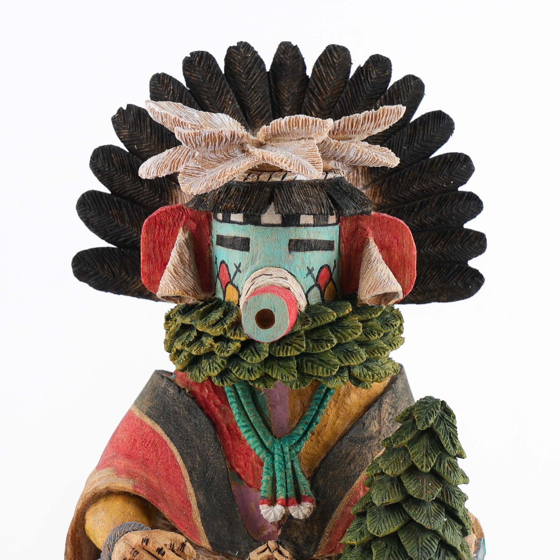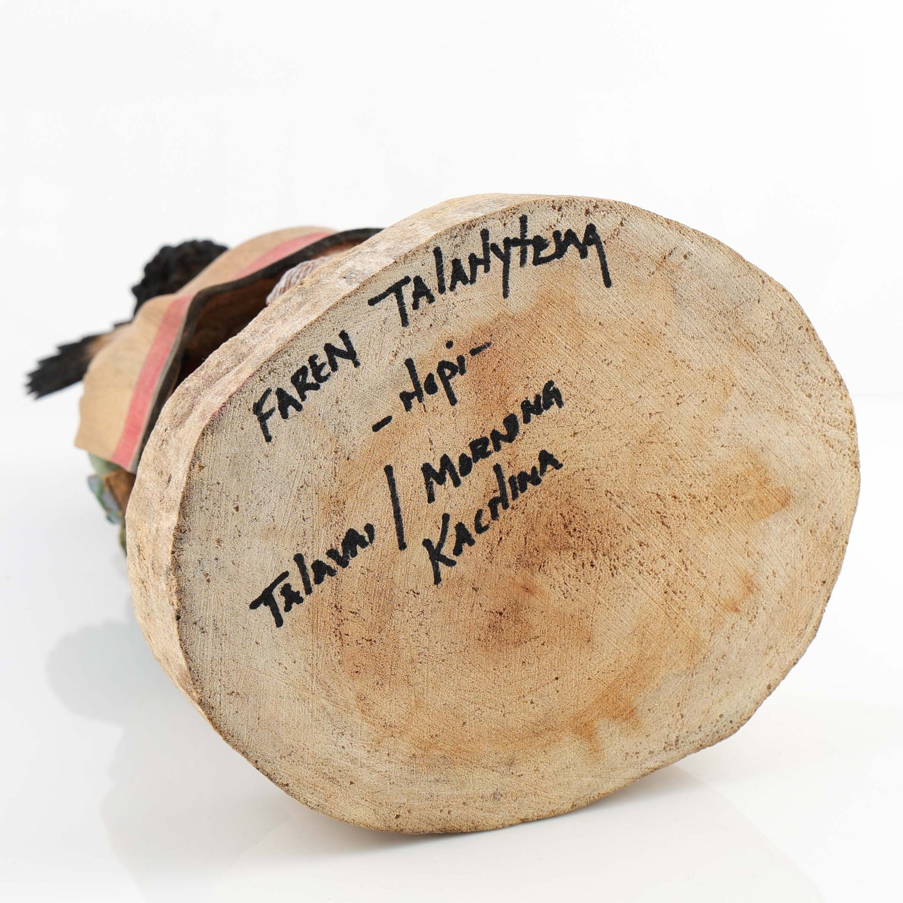Hopi Morning Singer (Talavi) Kachina doll, hand-carved and painted by Faren Talahytewa. Carved from cottonwood root and finished with painted detail, this honors the Kachina spirit who sings the dawn awake. Often appearing at the edge of the mesa during early morning ceremonies, Talavai holds a pine tree from the San Francisco peaks (Nuva'tukya'ovi) in Flagstaff, AZ, a sacred mountain for the Hopi. His role is to awaken the village and call the people to prayer.