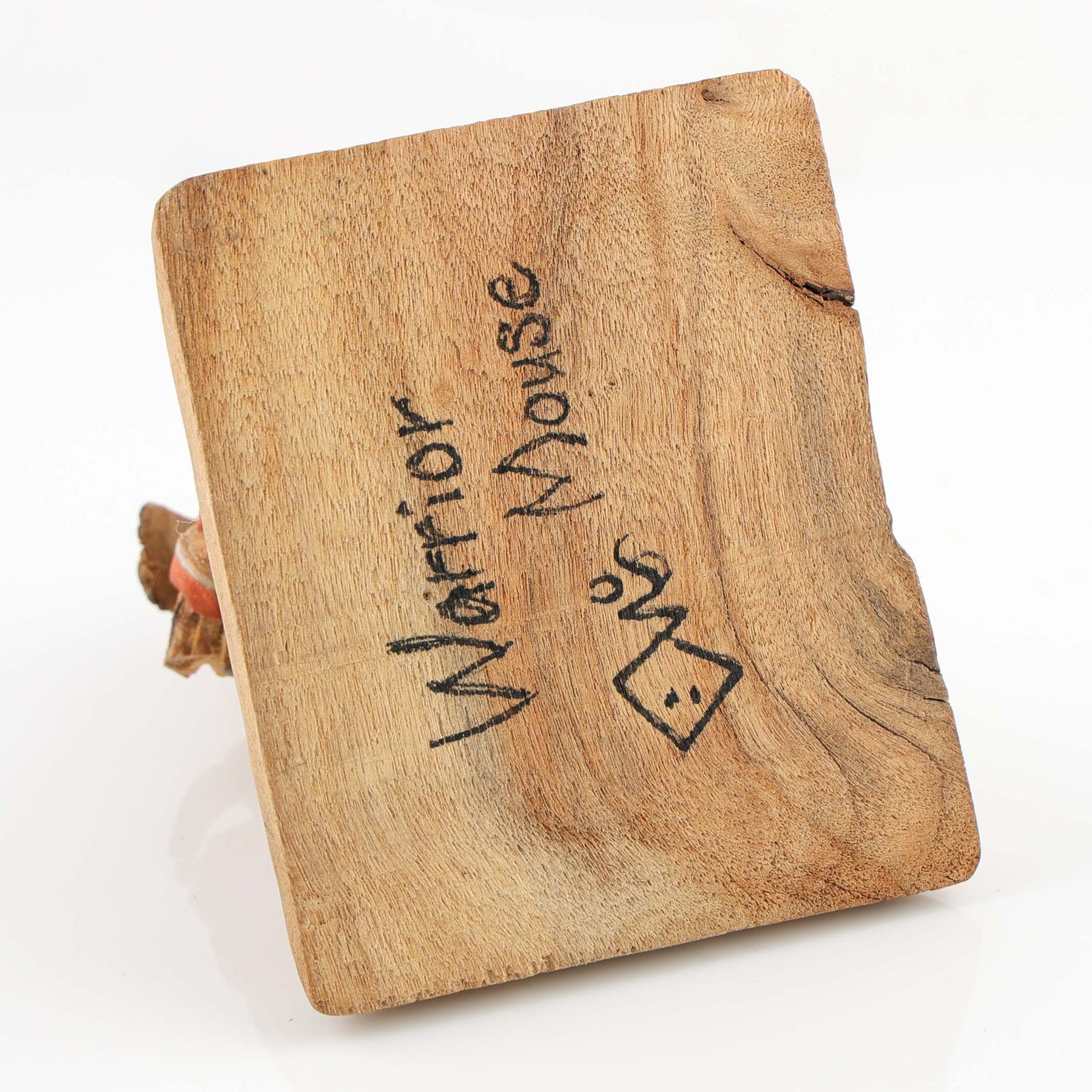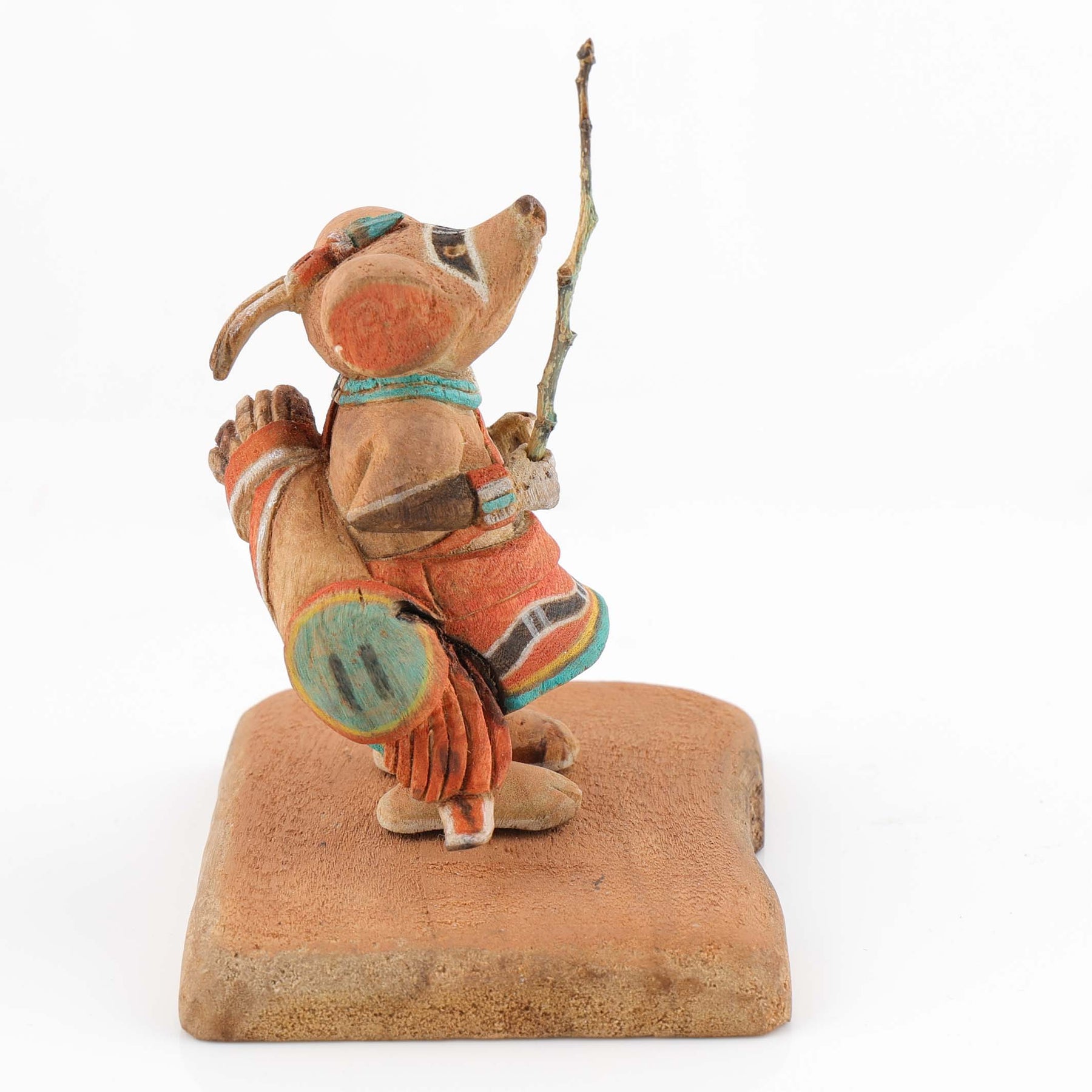 Hand-Carved and Painted Warrior Mouse Kachina Holding a Spear. This Kachina represents cleverness, courage, and tenacity. With detailed mouse features, this figure honors the ability to overcome great challenges despite one’s size.