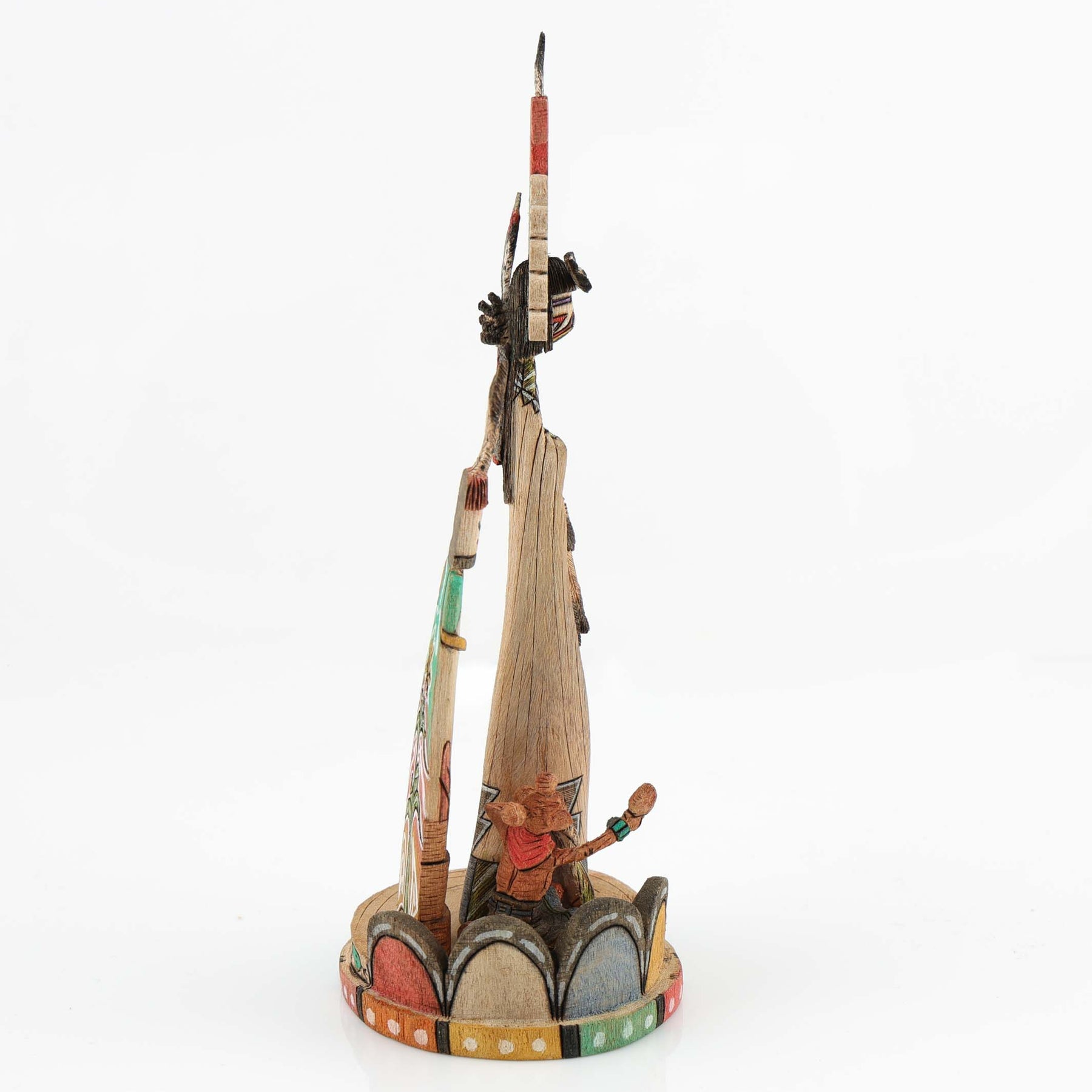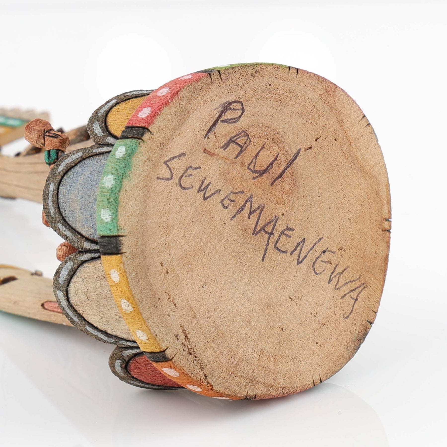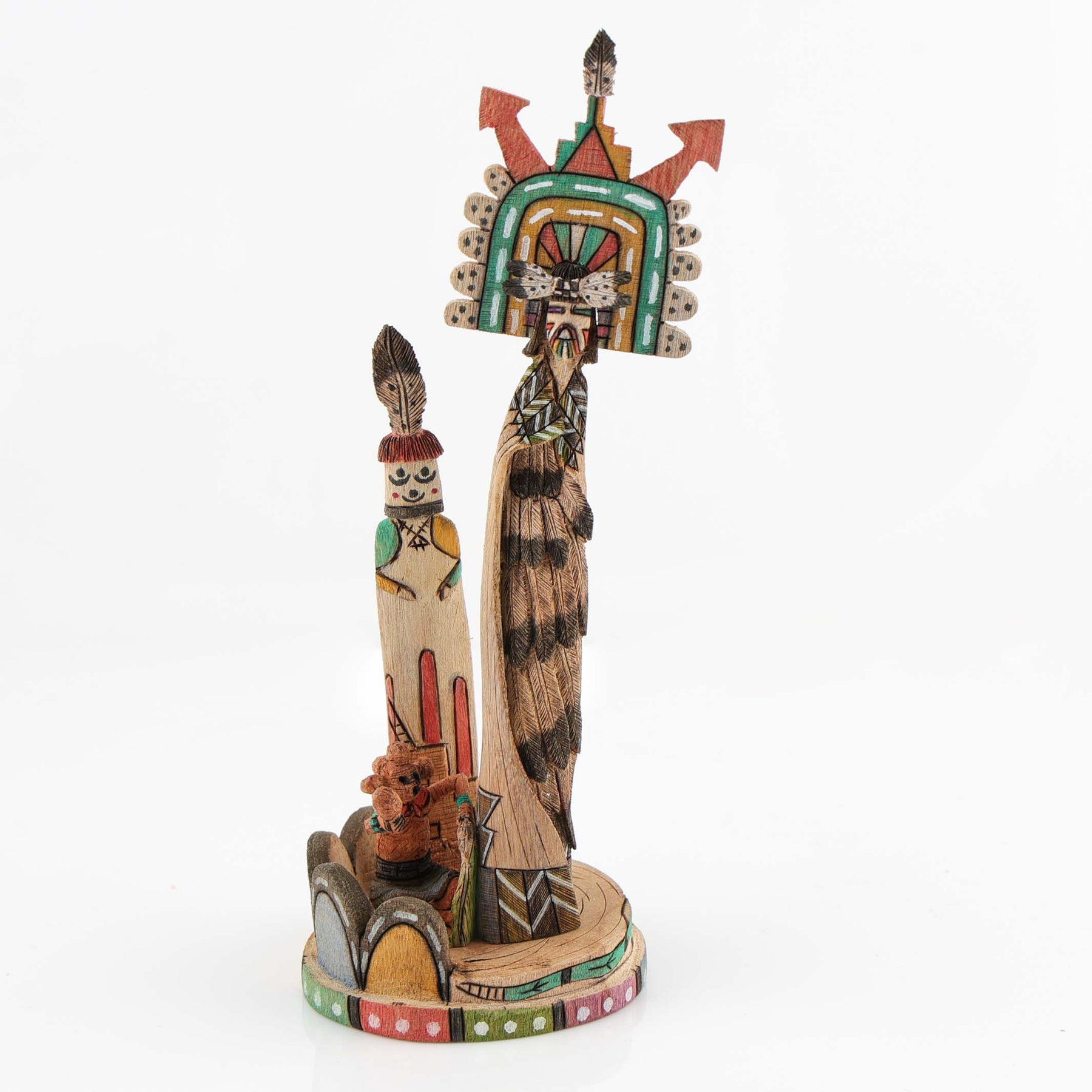 Hopi multi-figure Kachina intricately hand-carved from cottonwood root by Paul Sewemaenewa, featuring Shalako, Mudhead (Koyemsi), and Grandmother (Hahai Wuhti) Kachinas on a single base. Shalako is associated with important ceremonial cycles, Koyemsi are known as clown figures who participate in ritual life, and Hahai Wuhti is a grandmother figure.