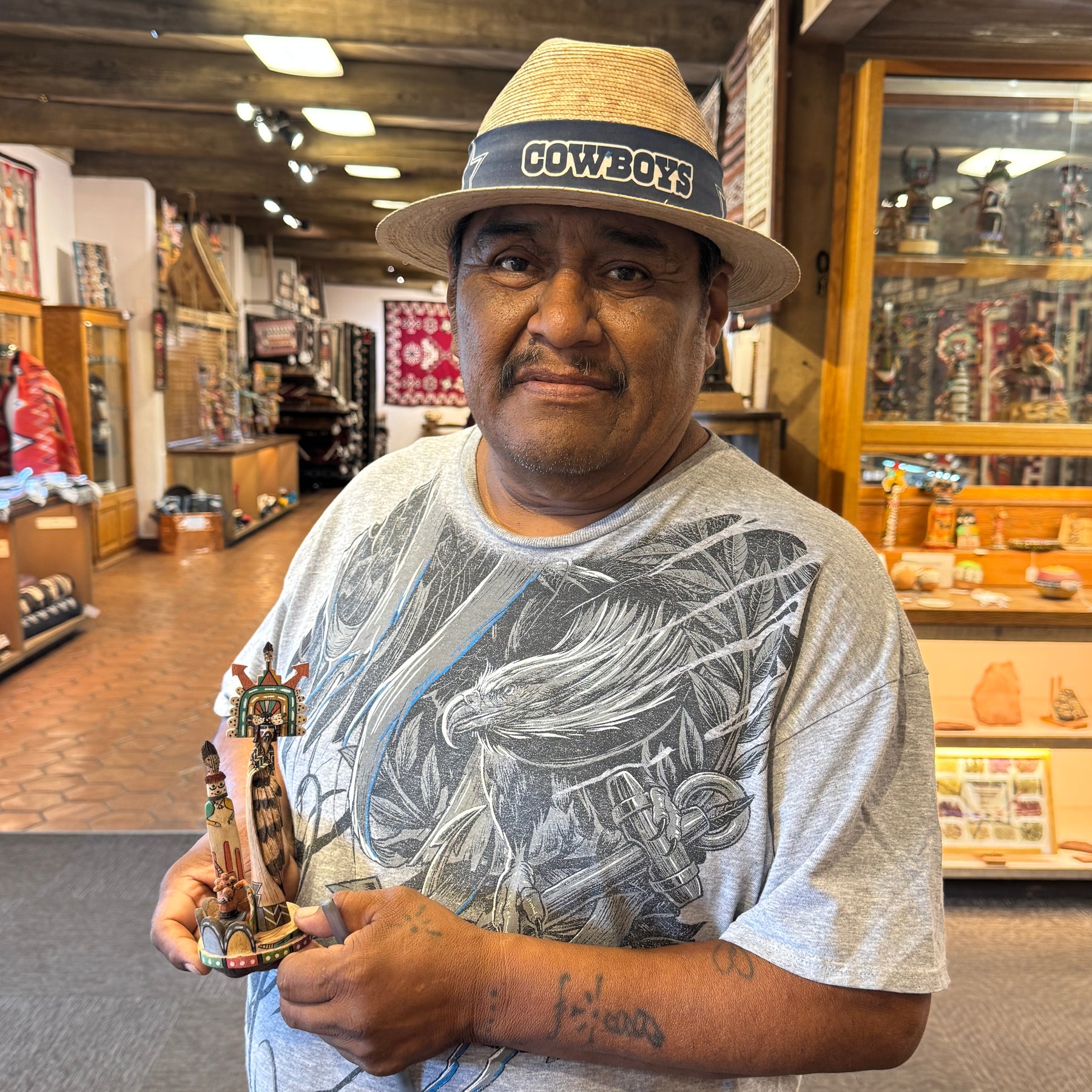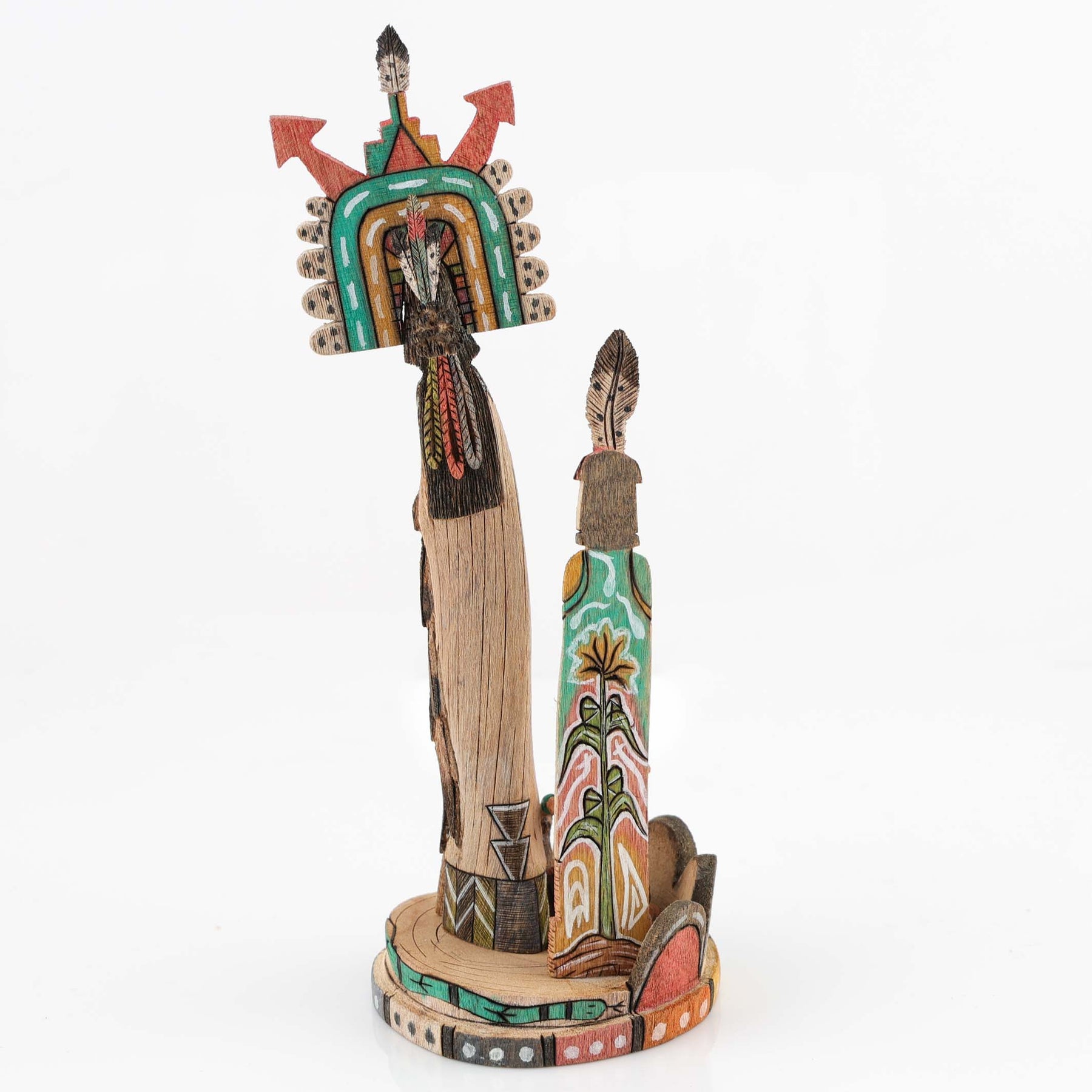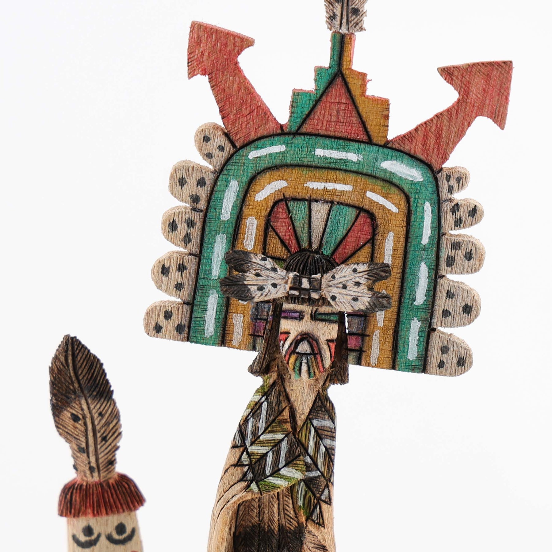 Hopi multi-figure Kachina intricately hand-carved from cottonwood root by Paul Sewemaenewa, featuring Shalako, Mudhead (Koyemsi), and Grandmother (Hahai Wuhti) Kachinas on a single base. Shalako is associated with important ceremonial cycles, Koyemsi are known as clown figures who participate in ritual life, and Hahai Wuhti is a grandmother figure.