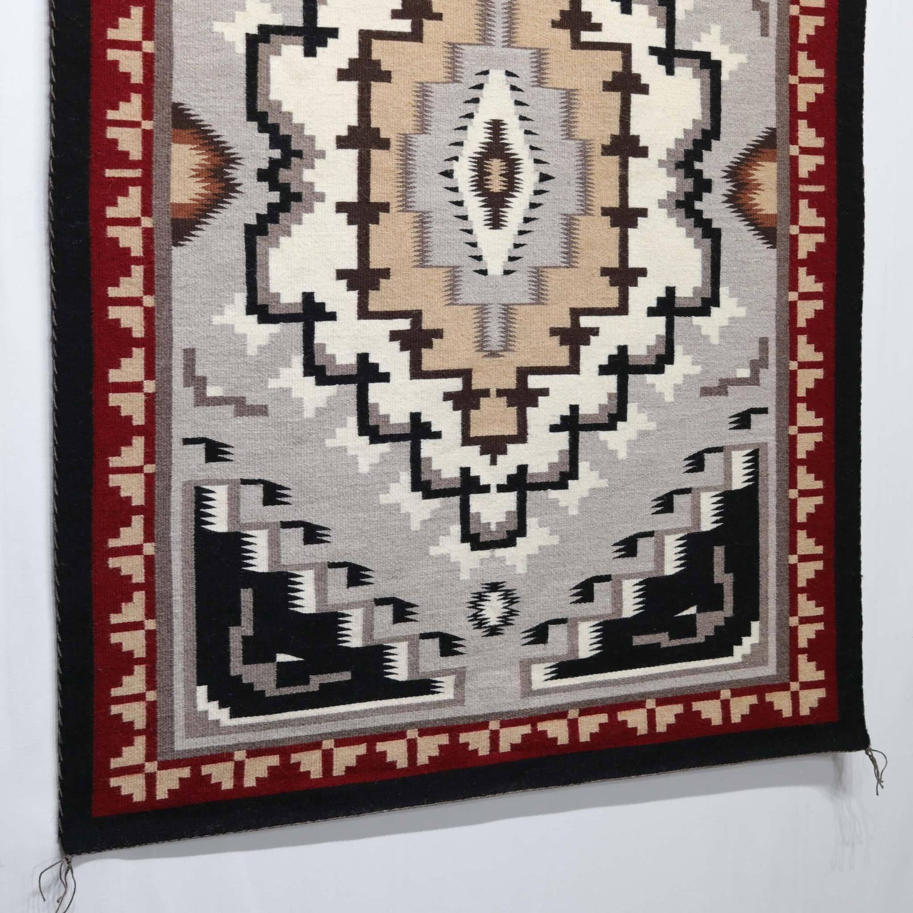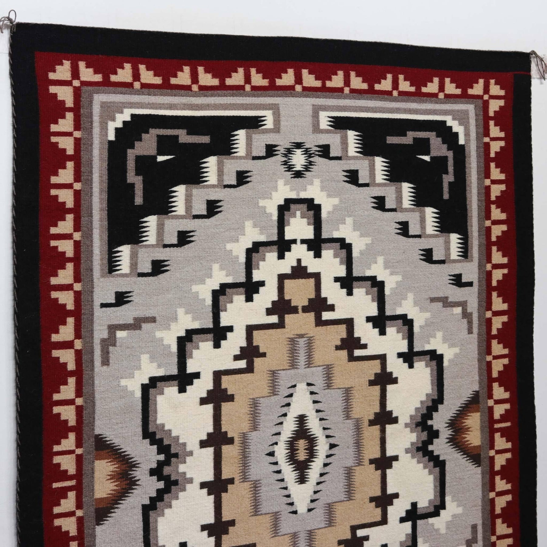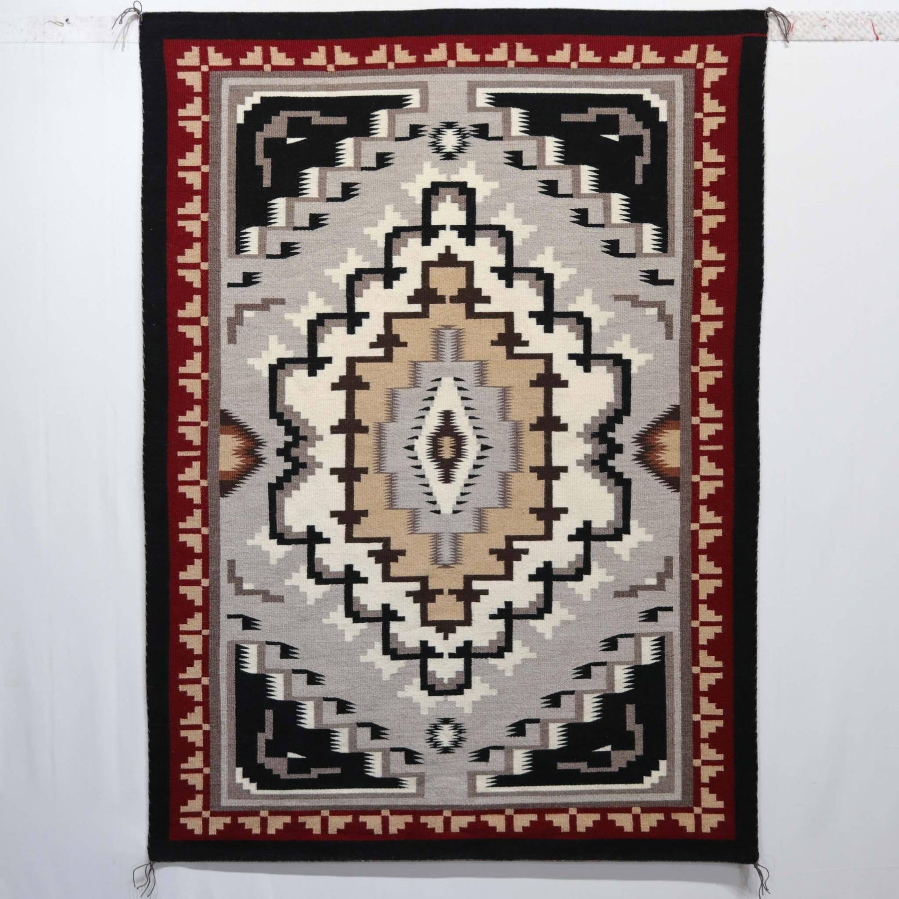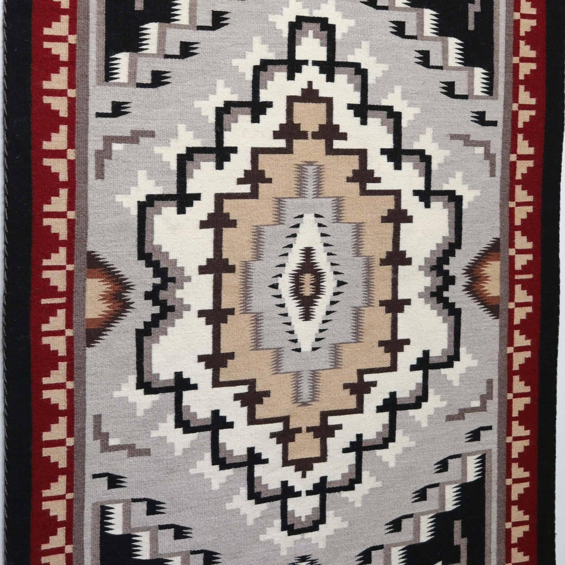 Handwoven Klagetoh Navajo Weaving With A Grey Background and a Red Border.