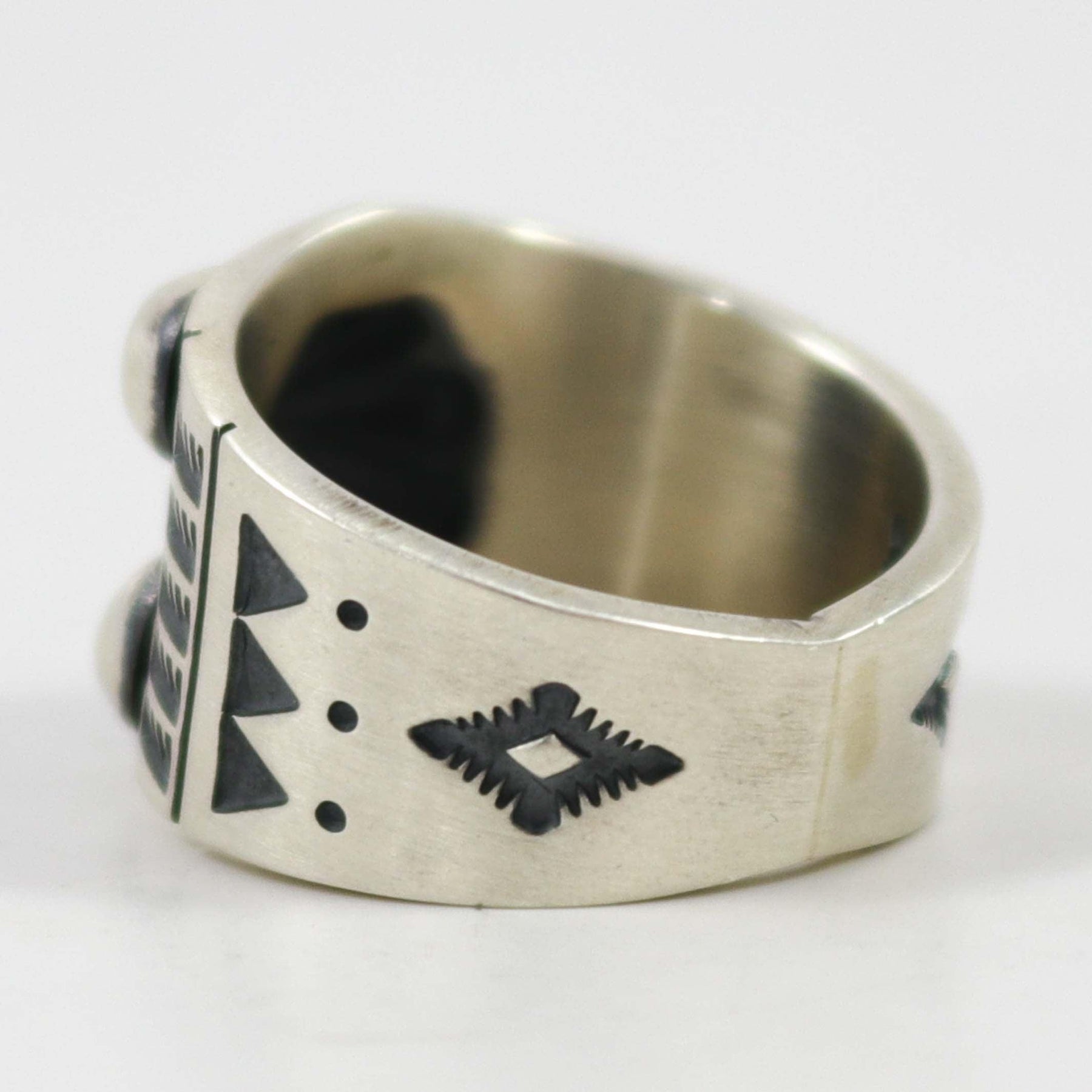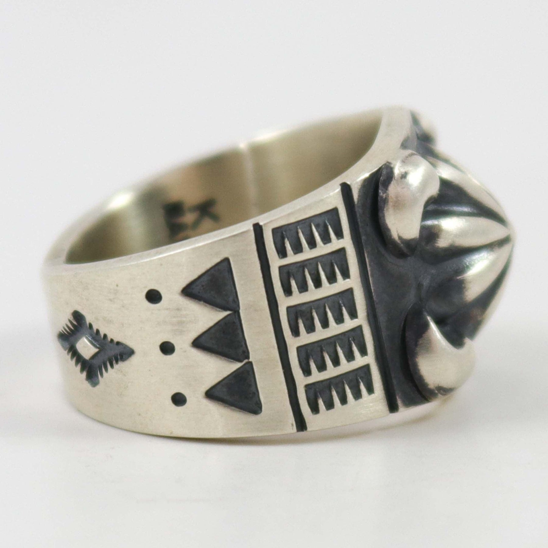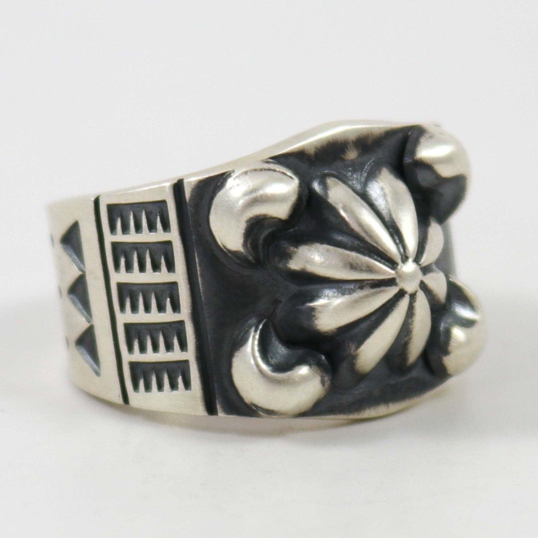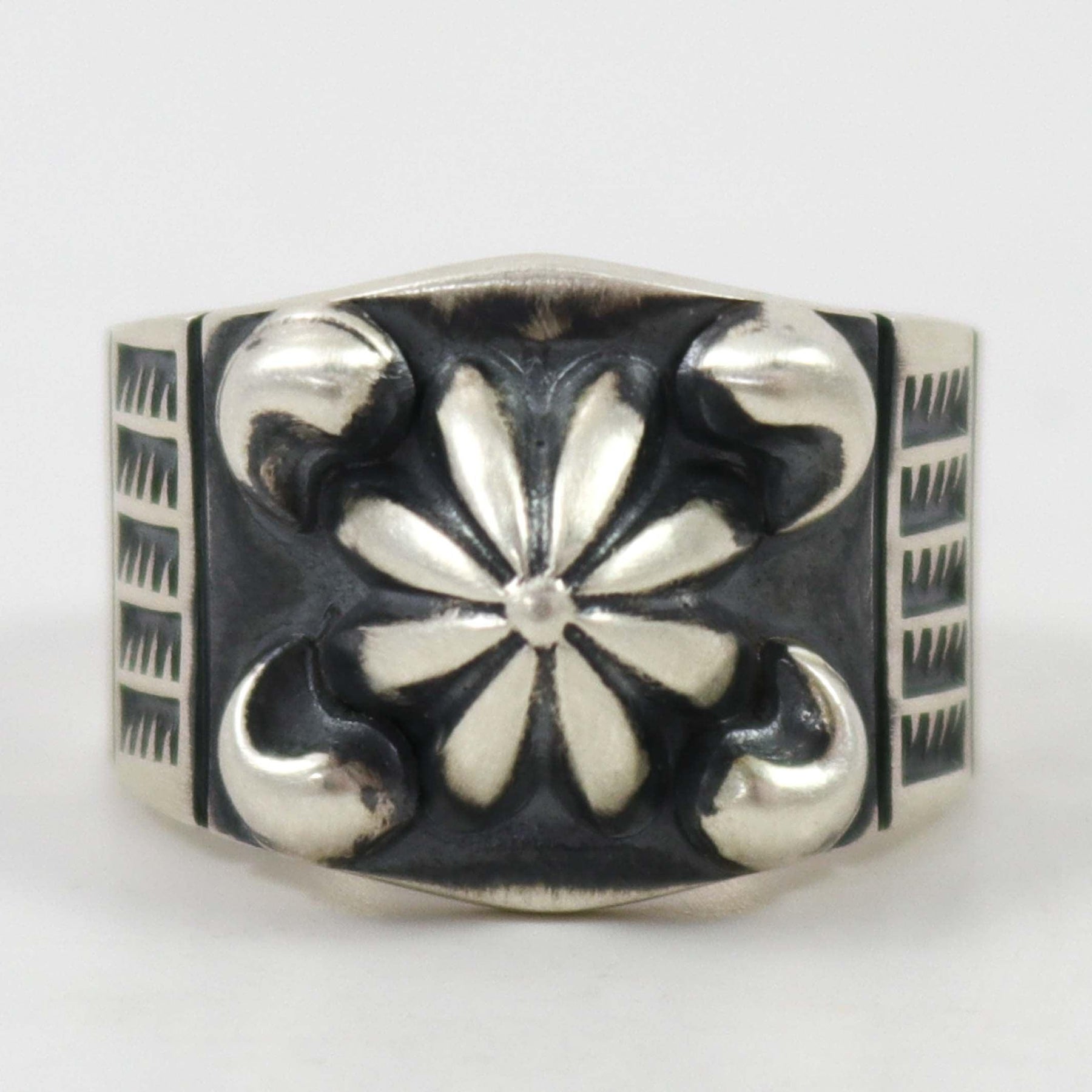 Sterling Silver Ring with Hand Stamped Designs and Repousse (Bump Out) Design in the Center.