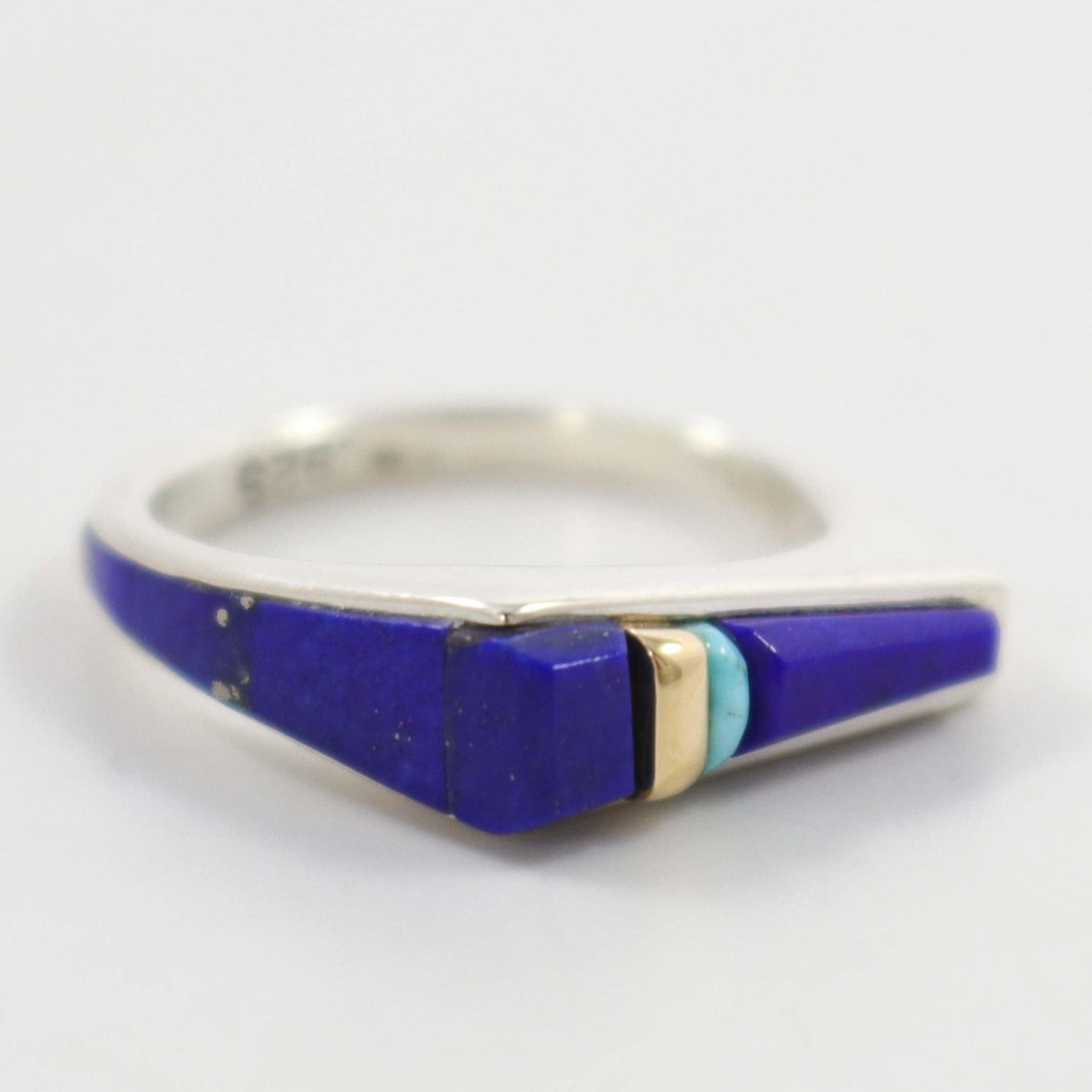 Sterling Silver and 14k Gold Ring with Inlaid Lapis and Natural Sleeping Beauty Turquoise from Arizona.