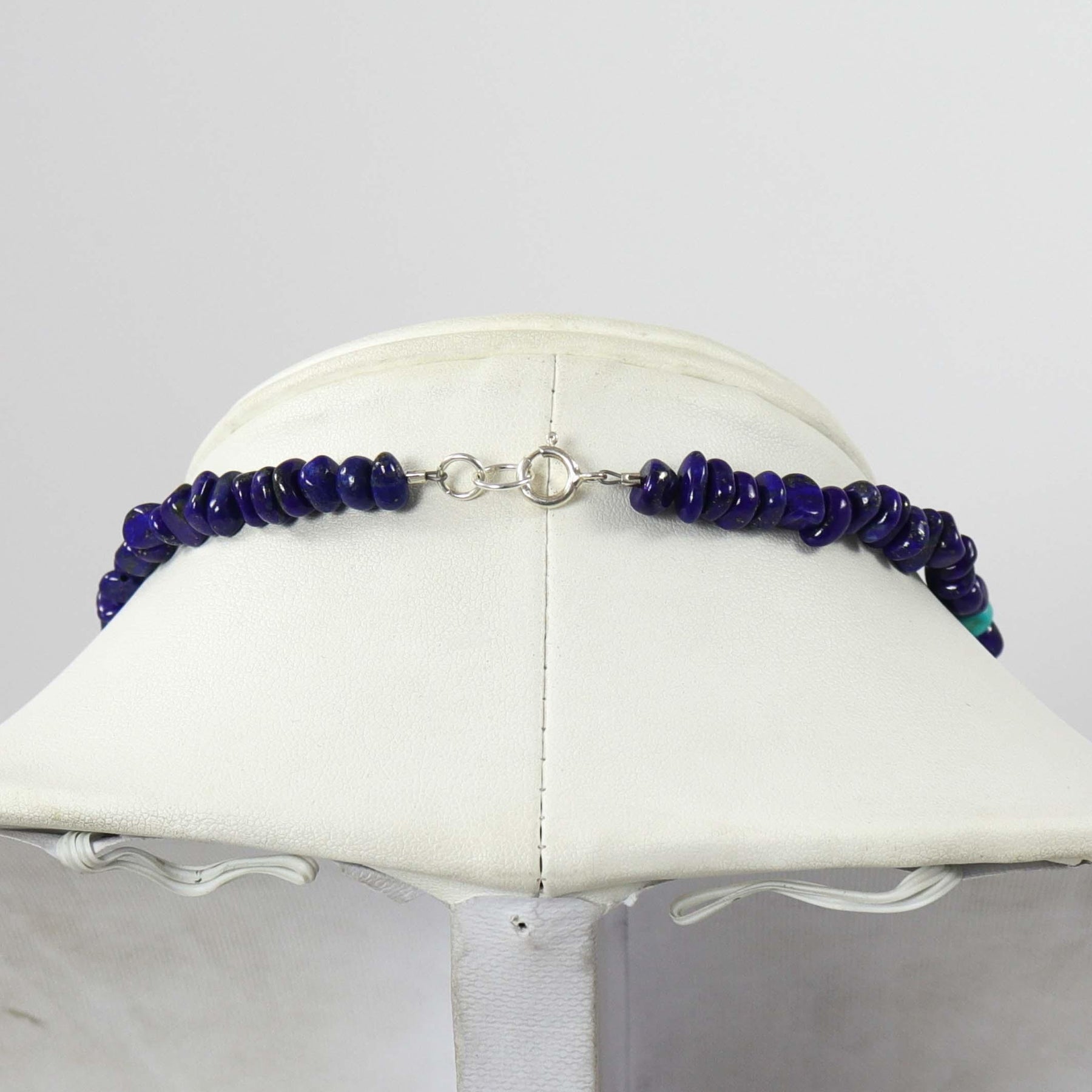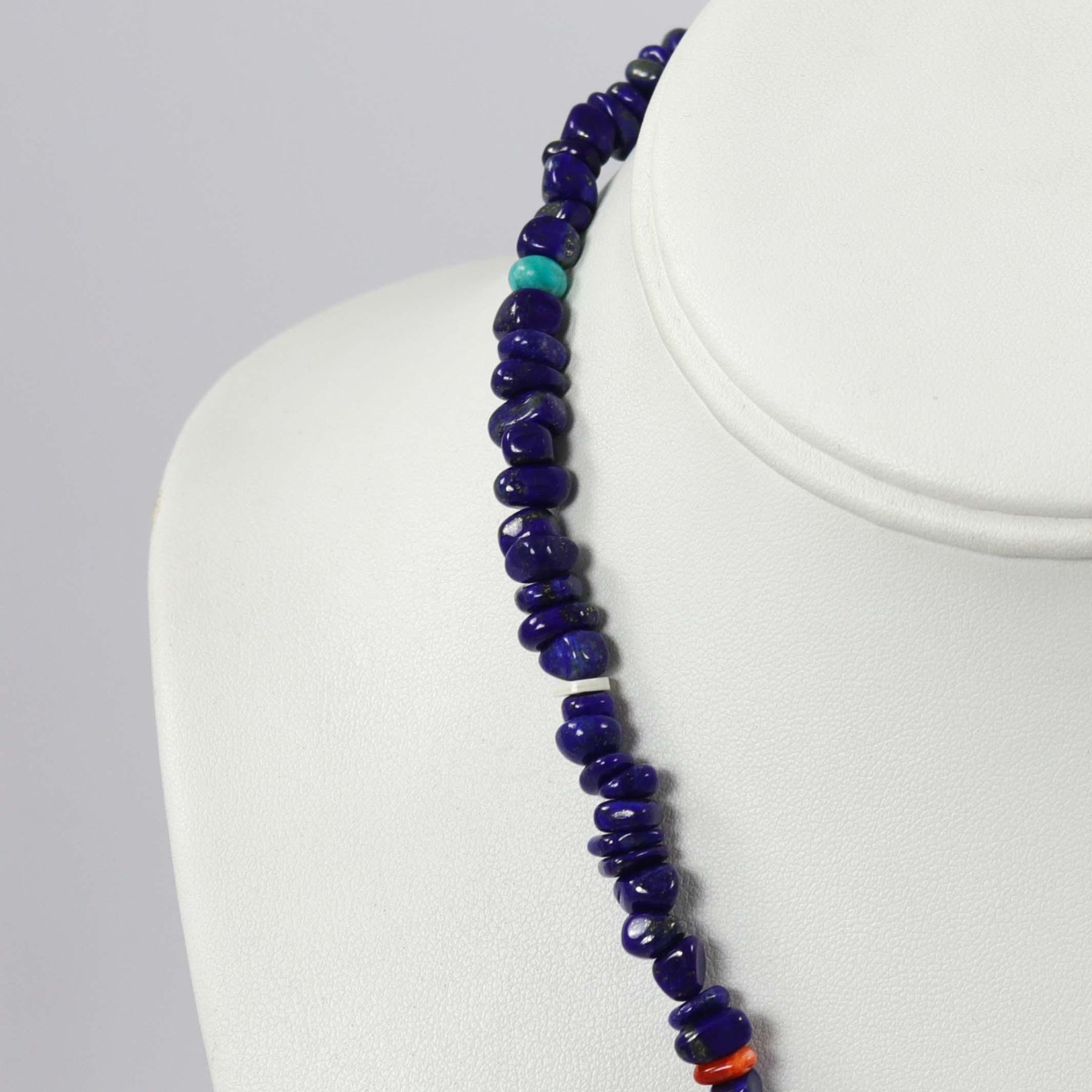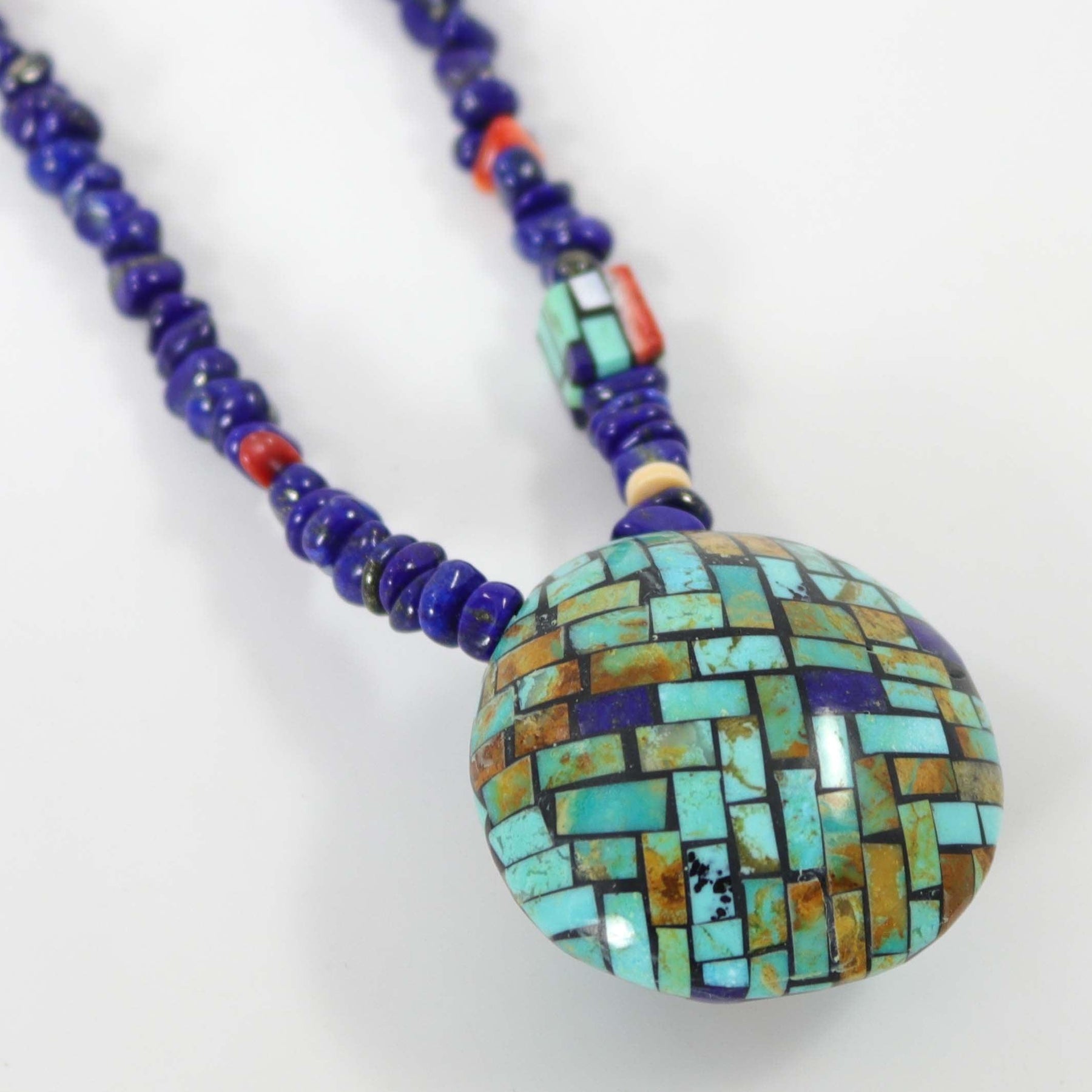 Single Strand Lapis Bead Necklace with a Reversible Inlaid Shell Pendant using Turquoise, Lapis, Mother of Pearl Shell, Melon Shell and Spiny Oyster Shell.
