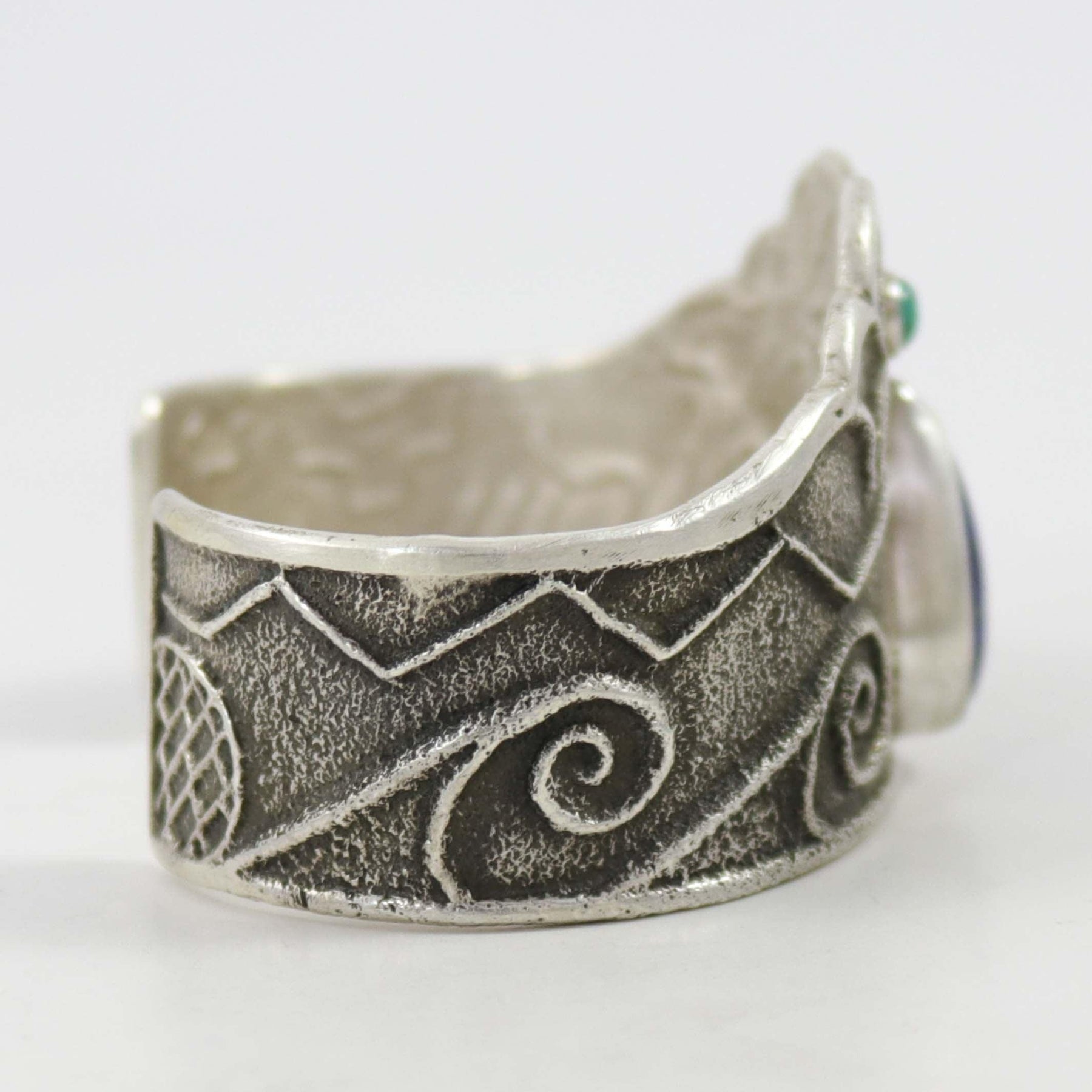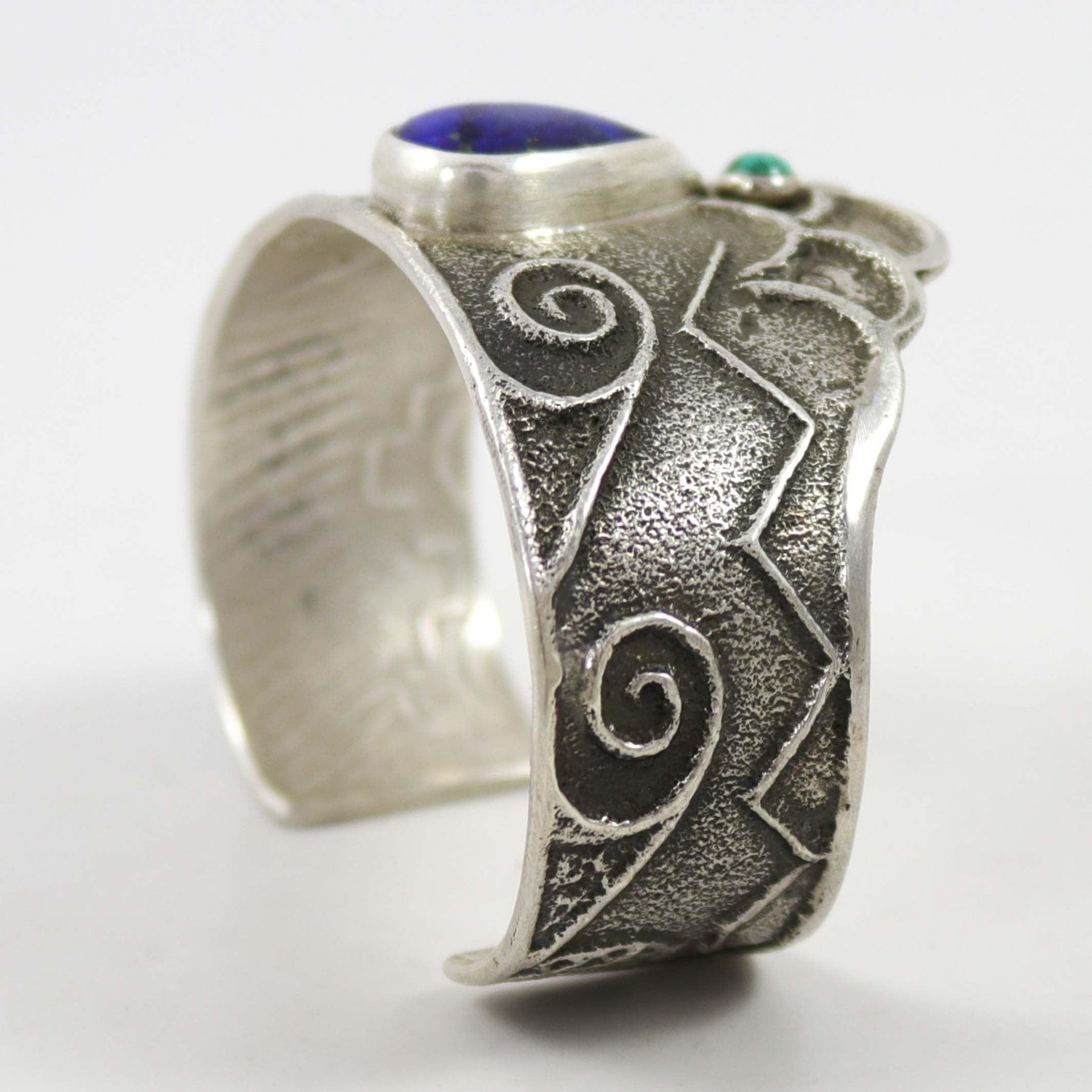 Tufa Cast Sterling Silver Cuff Bracelet with Rain Cloud Design and set with Lapis and Natural Kingman Turquoise from Arizona. Matthew Lovato is the oldest grandson of acclaimed Santo Domingo artist, Anthony Lovato.