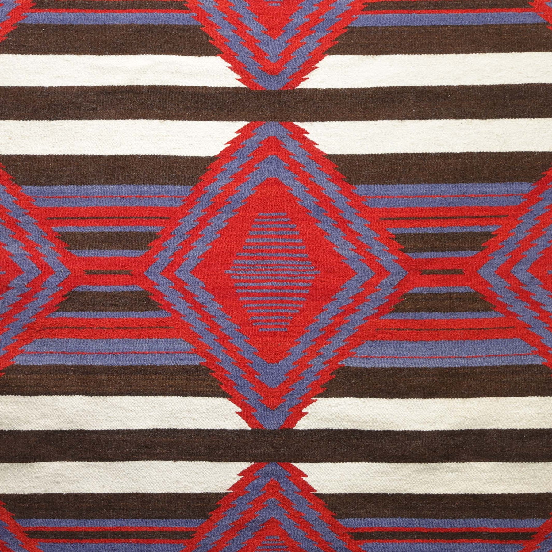 This striking revival of a classic Third Phase Chief's Blanket was woven in the 1980s by renowned Navajo artist Mae Jim, sister of the celebrated weaver Sadie Curtis. The design faithfully recreates the iconic Third Phase Chief Blanket pattern: bold stepped diamonds in vibrant red outlined in indigo and black, centered on a cream ground with wide horizontal bands of brown, cream, and dark blue at top and bottom.