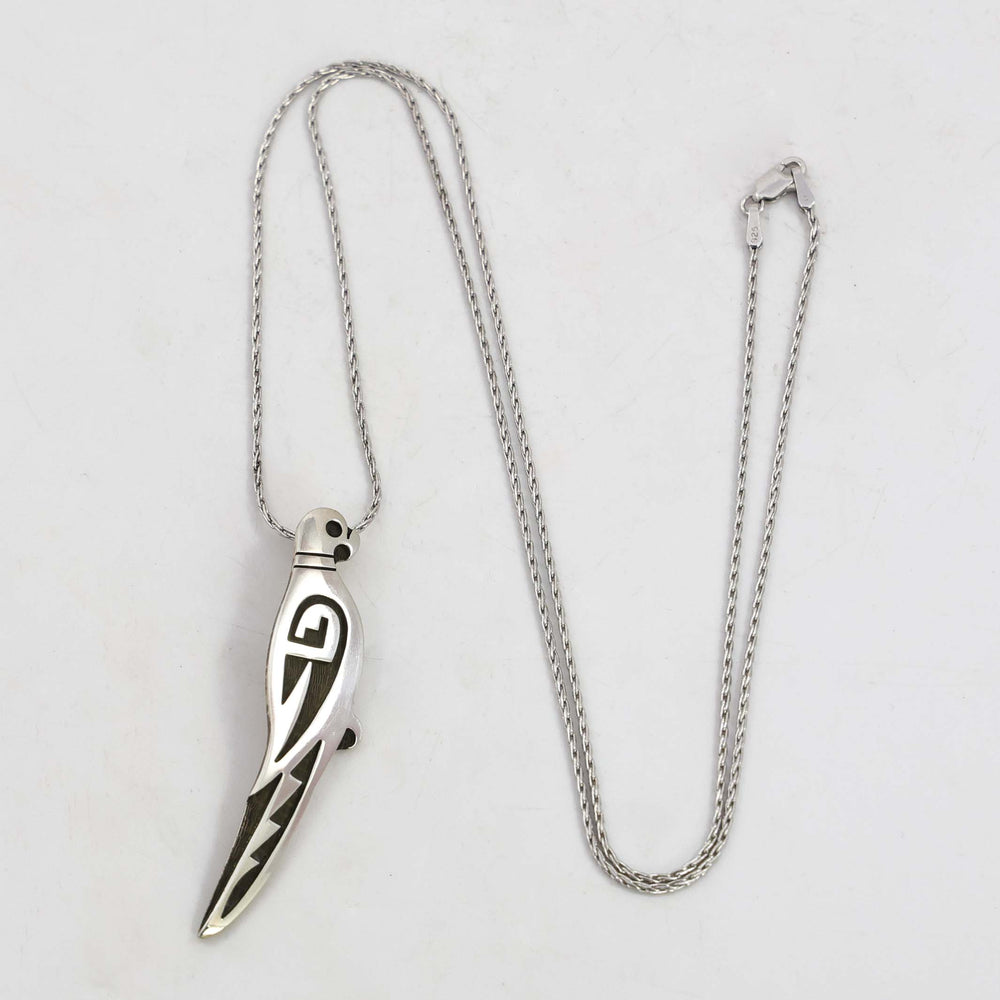 Sterling Silver Parrot Pendant with Hopi Overlaid Cloud and Rain Symbols on a 20” sterling silver braided chain.