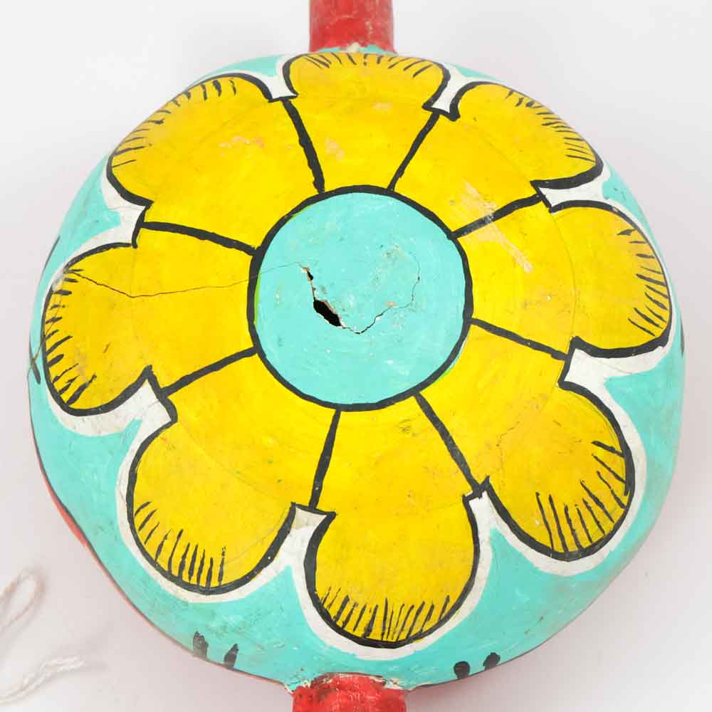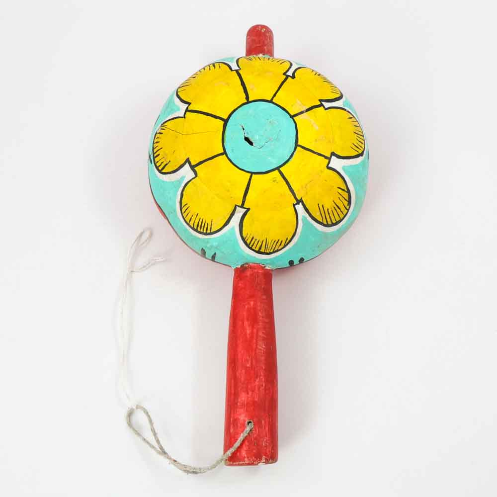 1960s Hopi Gourd Rattle with hand-painted designs and a string for hanging or wall display. This vintage rattle was traditionally used in Hopi Kachina dances and shows signs of age and ceremonial use. This rattle has some repaired cracks in the gourd and the price is reduced.