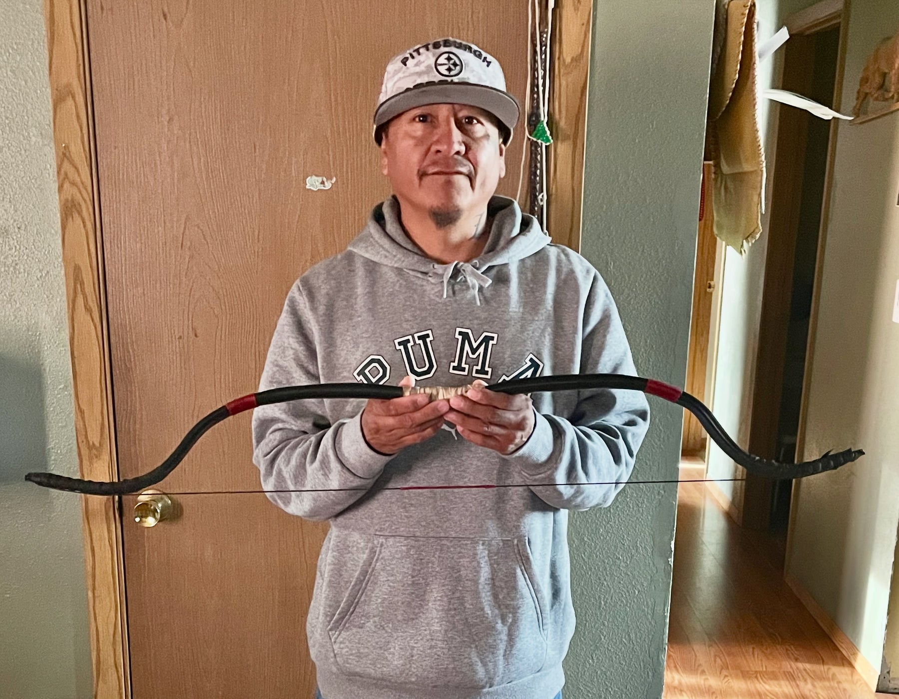 Handmade Contemporary Navajo Bow by Artist Roy Lester Jr. Created from shaped PVC, Roy Lester Jr.'s bows are designed to be weather-resistant and capable of hunting large game. This particular bow is intended as a decorative art piece only.