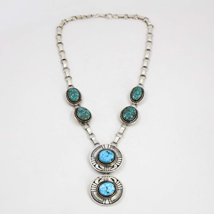The Navajo (Diné) Nation covers over 27,000 square miles in Arizona, New Mexico, and Utah. It is the second largest Indigenous tribe in the United States with over 300,000 tribal members. The Diné have been rooted in the Southwest for over a thousand years. They are an Athabascan people, having ancient ancestors who originally migrated over the Bering Strait from Asia. Silversmithing and rug weaving are extremely important traditions to Navajo culture. The Navajos were the first tribe in the Southwest to learn silversmithing techniques in the late 1800s. Squash Blossom Necklaces and Concha Belts are the most iconic forms Navajo silversmithing. Navajo artistry blends both traditional techniques and modern influences, showcasing the unique heritage and creativity of the Diné.