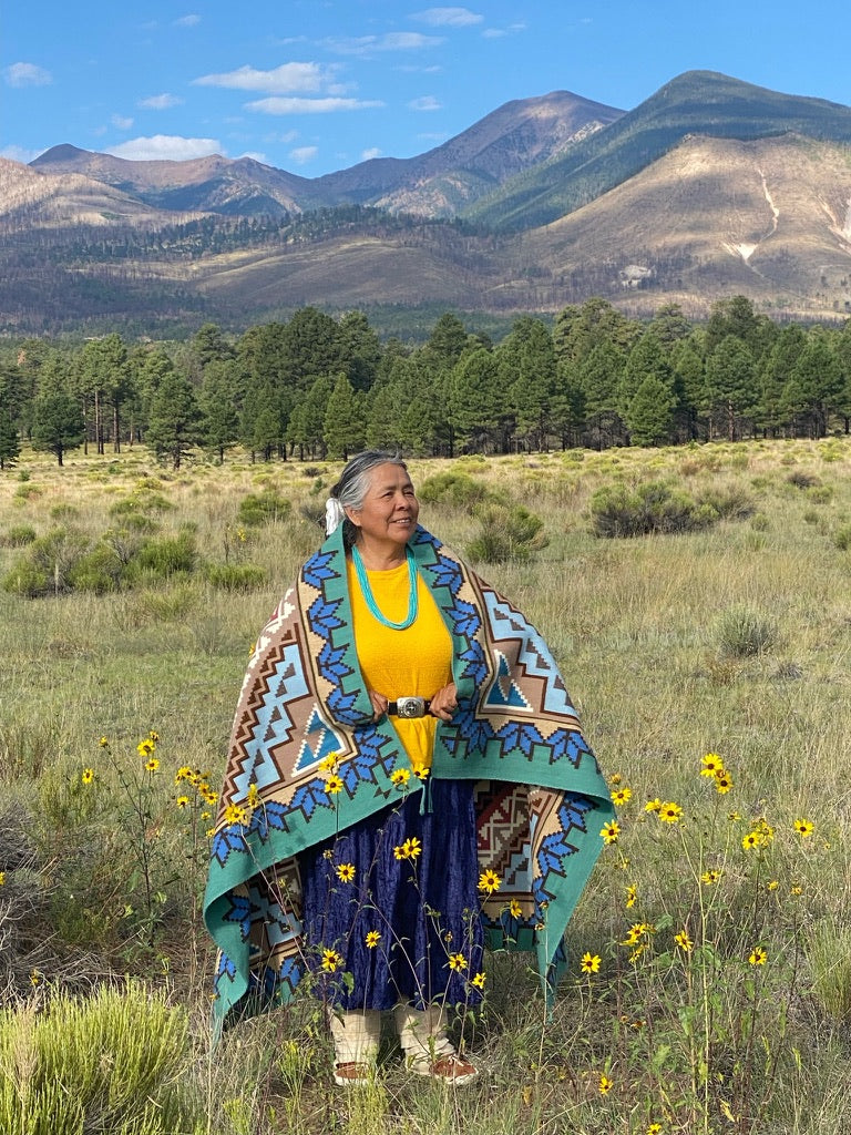 Handwoven Navajo Burntwater Weaving with a Detailed Double Diamond Design using Bright Earth Tones. Woven by Brenda Joshevama, she and her daughter, Amanda, are photographed with the weaving near one of the 4 sacred mountains of the Diné, Dookʼoʼoosłííd (San Francisco Peaks), in Flagstaff, Arizona.