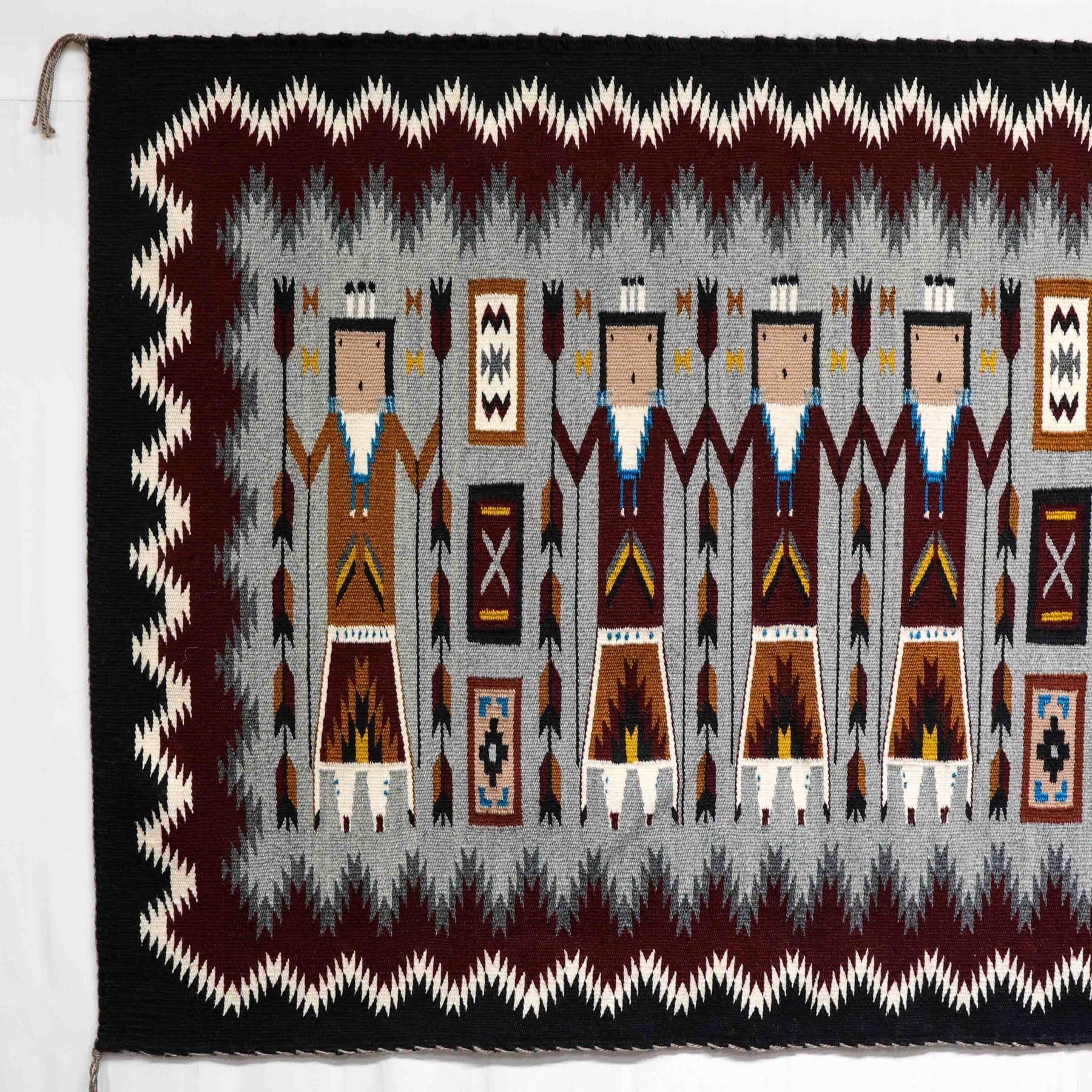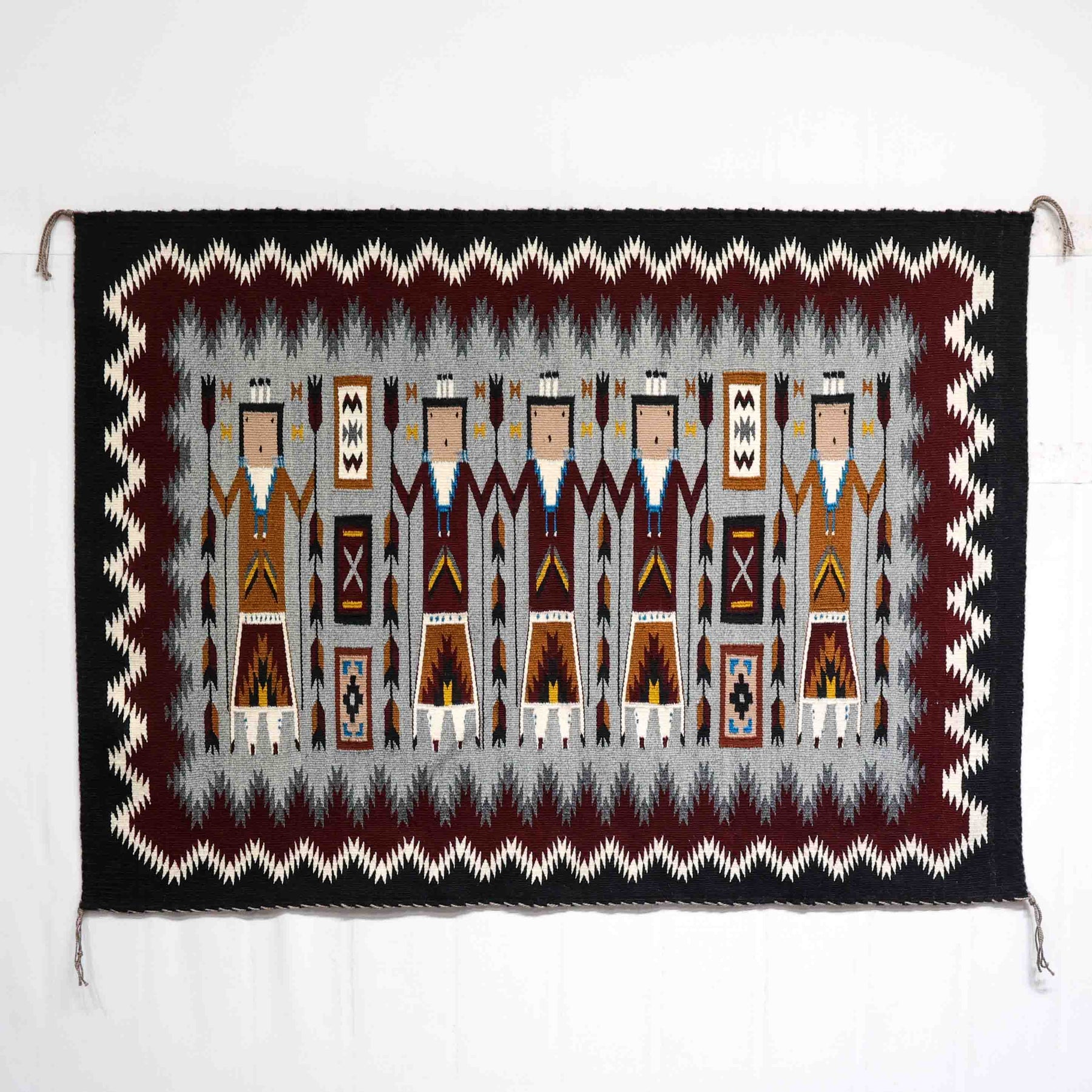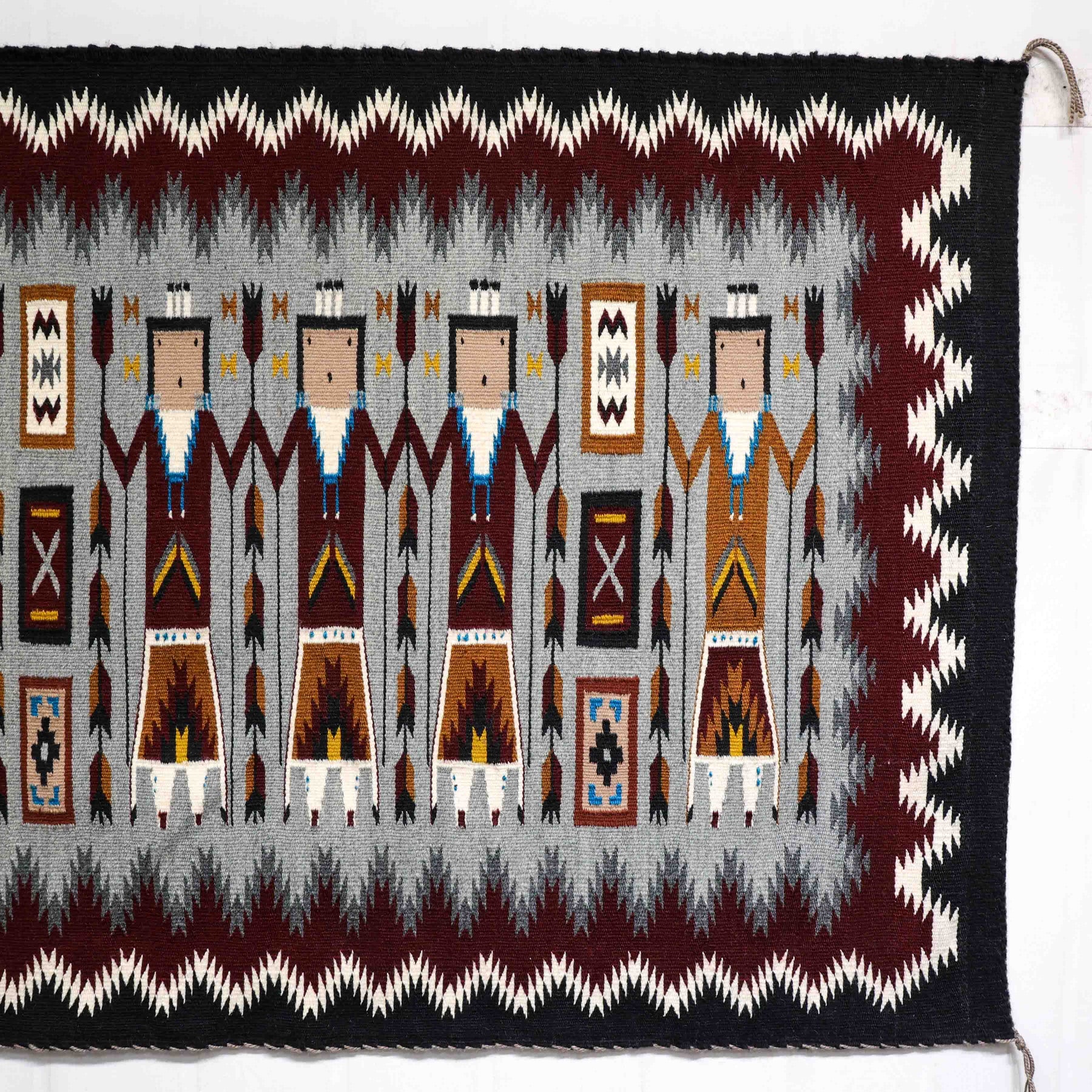 Handwoven Navajo Yei weaving by Kathryn Begay featuring a row of stylized Yei figures framed by a bold serrated border in black, burgundy, gray, and ivory. The composition is richly detailed, with repeating figures representing healing spirits, feather elements, and geometric accents. The larger scale and balanced layout give this piece a striking visual presence well suited for wall display.