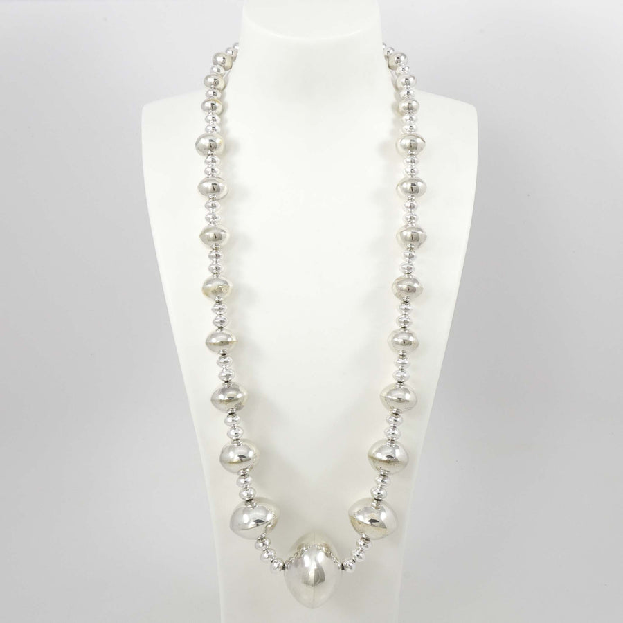 Early Southwest Native American necklaces consisted of hand rolled beads strung together and tied around the neck. Turquoise and shell were the most common materials used in necklaces. A traditional style of these beads is called heishi, from the Santo Domingo (Kewa) word for "shell." These heishi beads are rolled against a stone wheel, and the sides of the beads lie flat against each other. The introduction of silversmithing and silver bead making led to the creation of the Squash Blossom Necklace, the most iconic of Navajo (Diné) necklaces. "Navajo Pearls" are another popular type of necklace, which feature handmade all-silver beads.