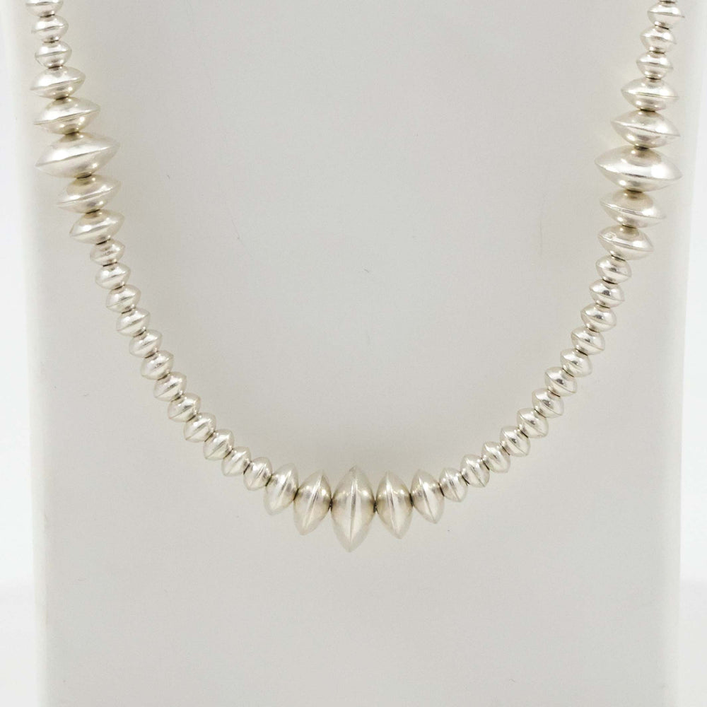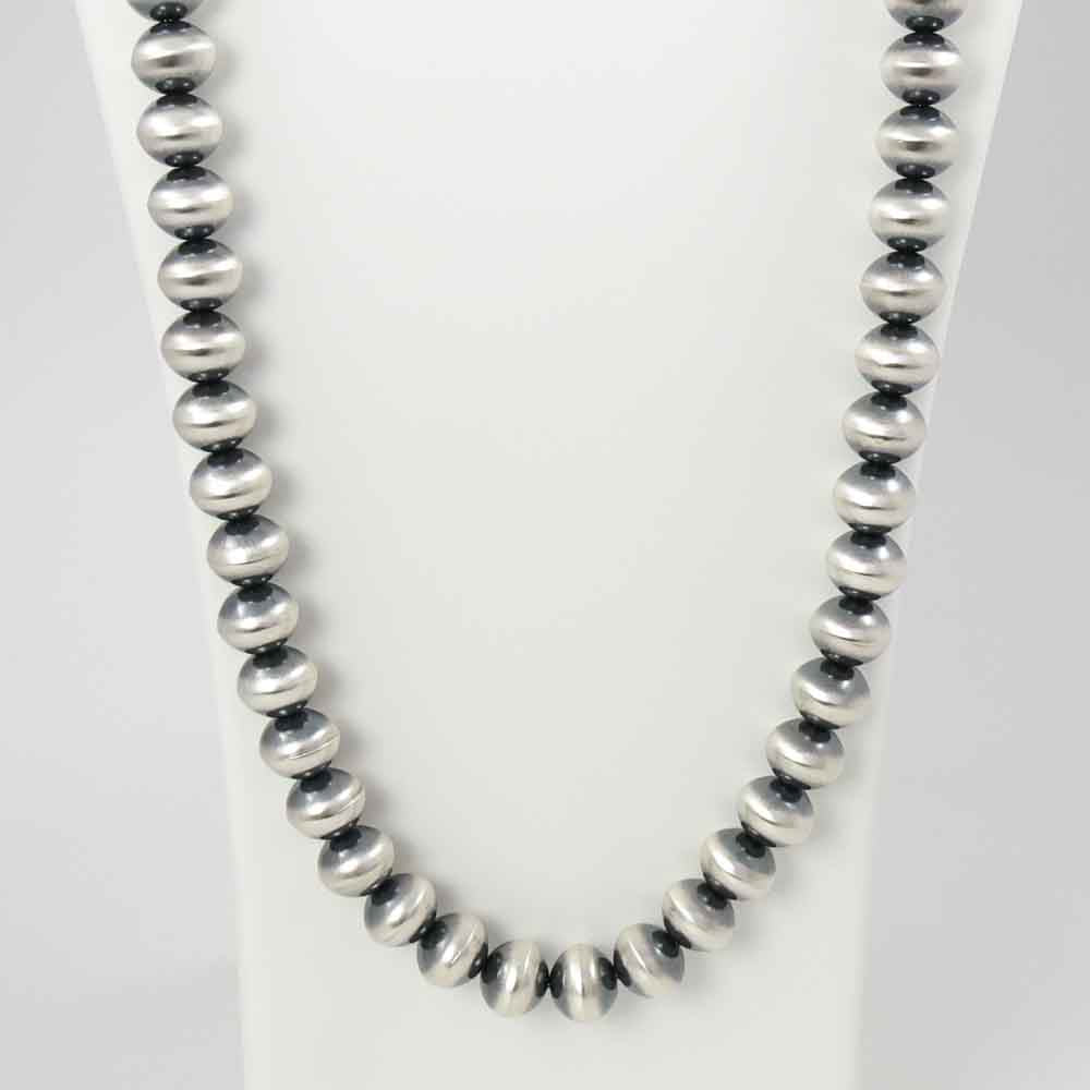 Early Southwest Native American necklaces consisted of hand rolled beads strung together and tied around the neck. Turquoise and shell were the most common materials used in necklaces. A traditional style of these beads is called heishi, from the Santo Domingo (Kewa) word for "shell." These heishi beads are rolled against a stone wheel, and the sides of the beads lie flat against each other. The introduction of silversmithing and silver bead making led to the creation of the Squash Blossom Necklace, the most iconic of Navajo (Diné) necklaces. "Navajo Pearls" are another popular type of necklace, which feature handmade all-silver beads.