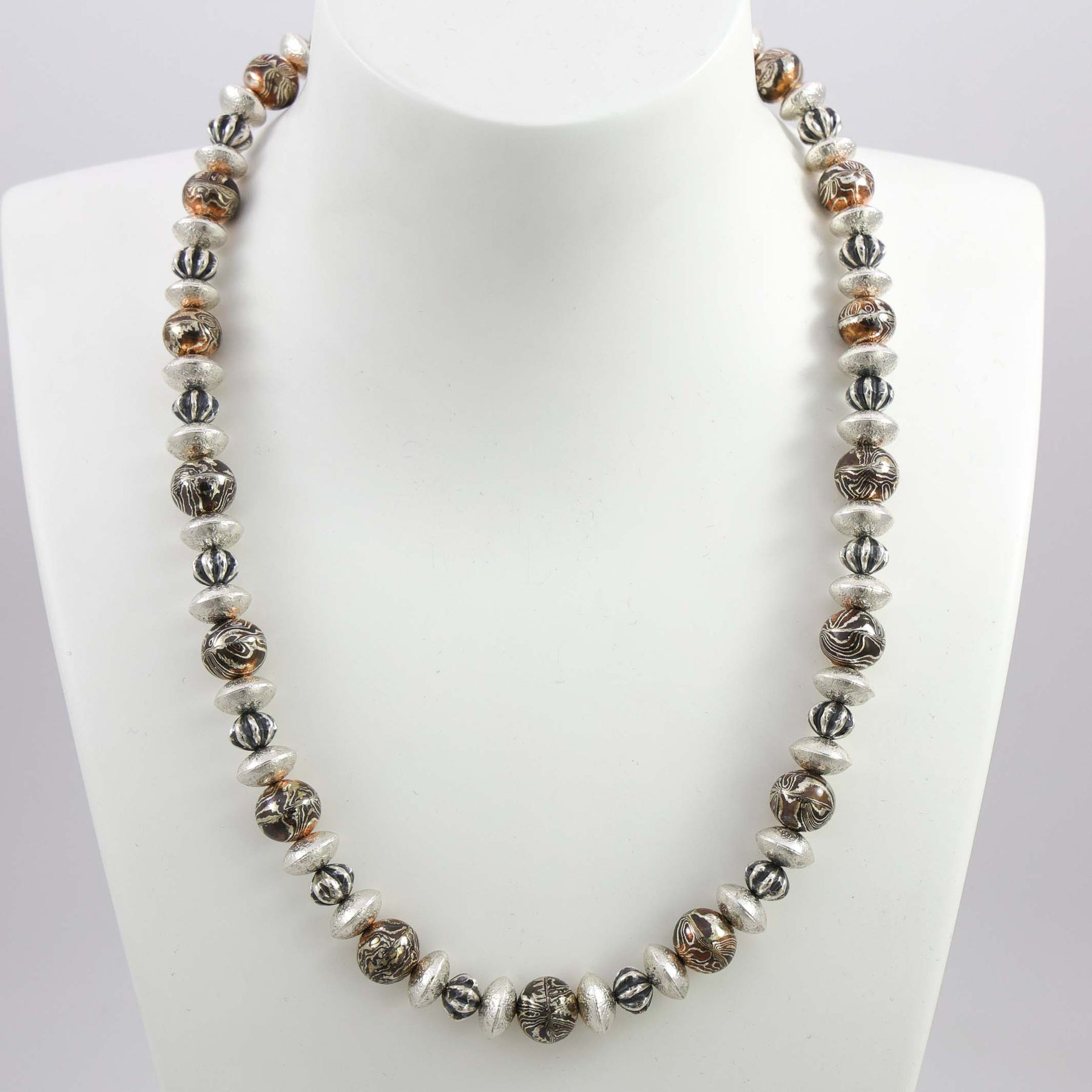 Single Strand Navajo Pearl Necklace with Handmade Sterling Silver Textured Beads, Mokume Beads, and Fluted Beads. Mokume is a metalworking process where multiple metals are combined under high temperatures to create beautiful patterns.