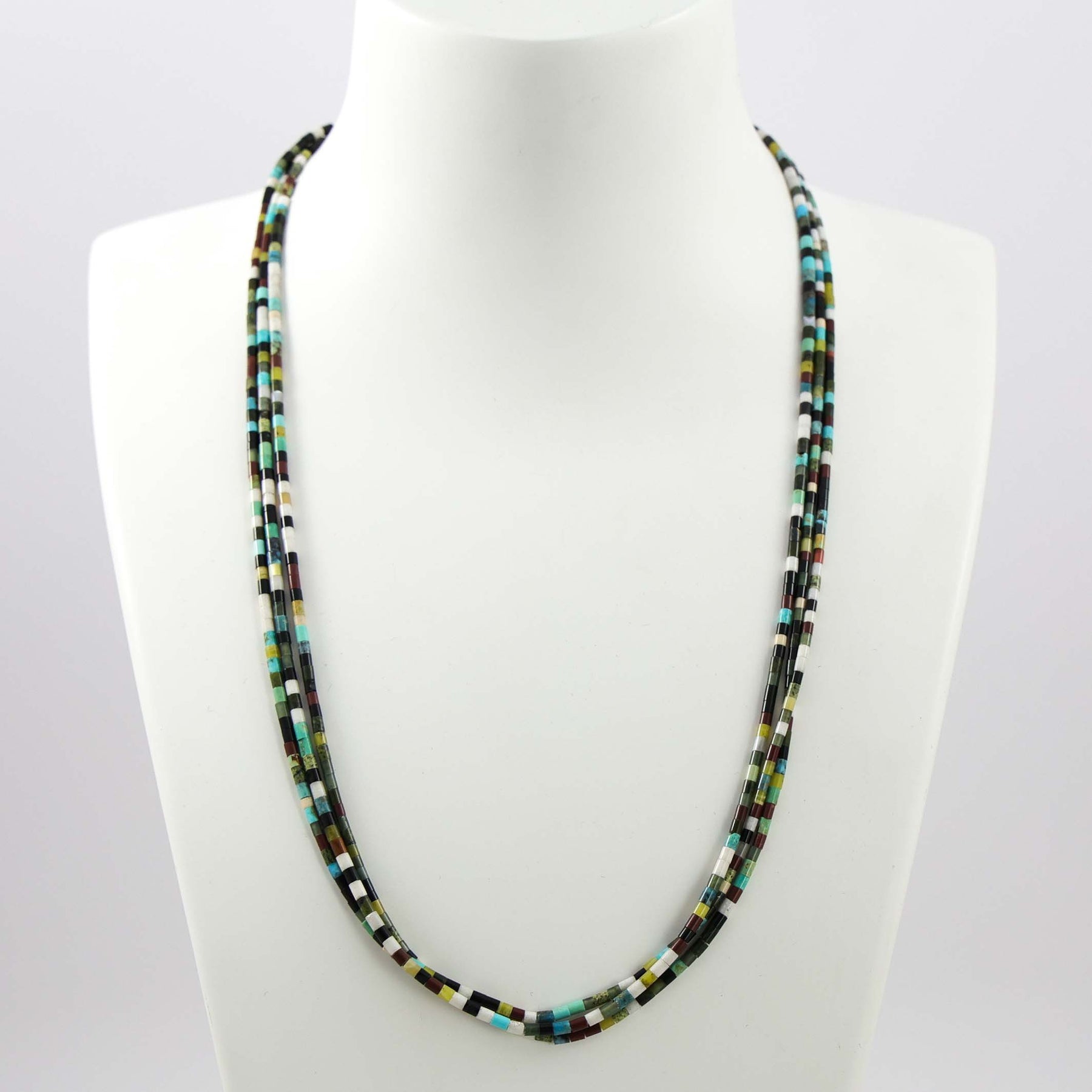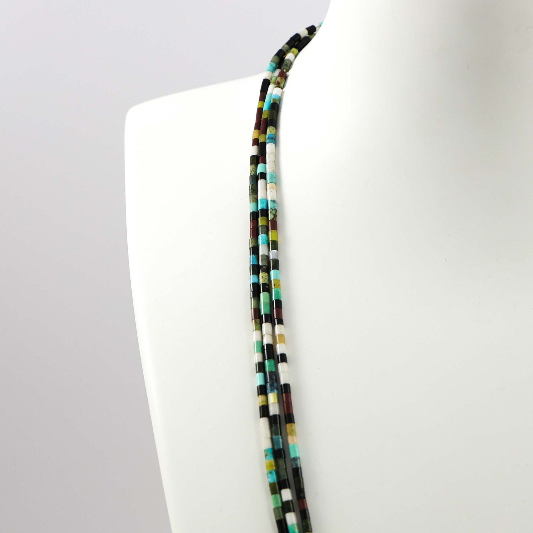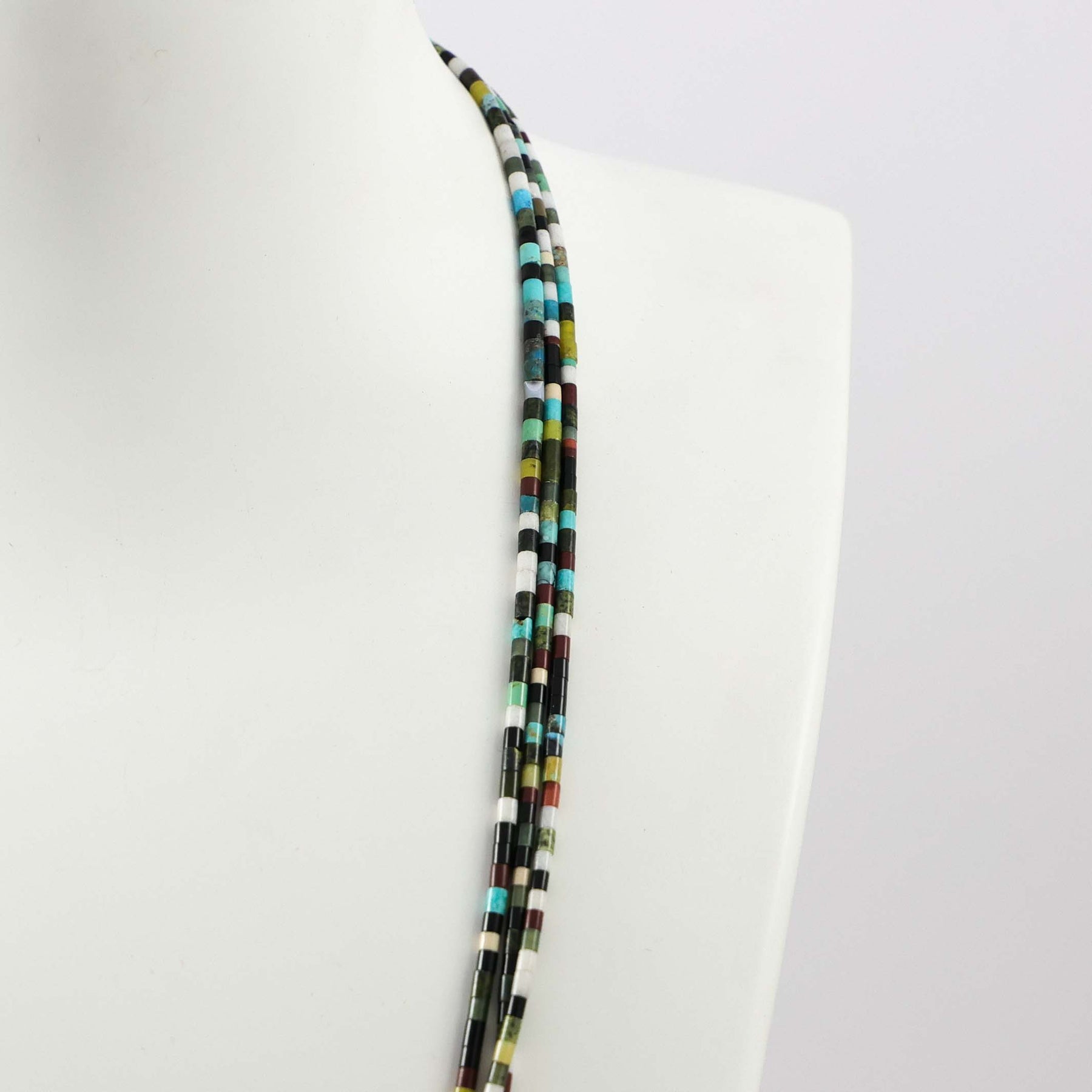 Three Strand Heishi Necklace with Hand-Rolled Kingman Turquoise, Serpentine, Jet, Pipestone, and White Marble Beads and Hand-Drawn Sterling Silver Beads and Clasp.