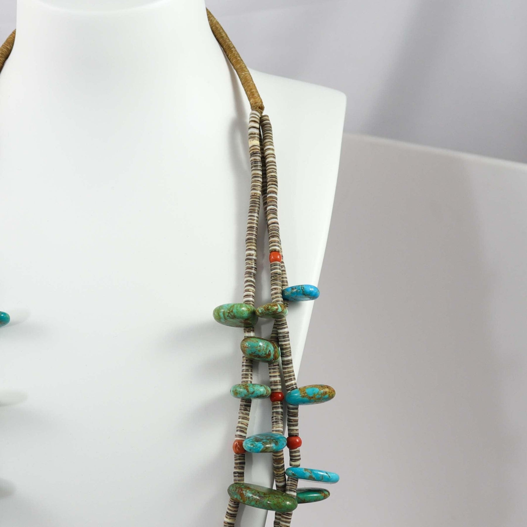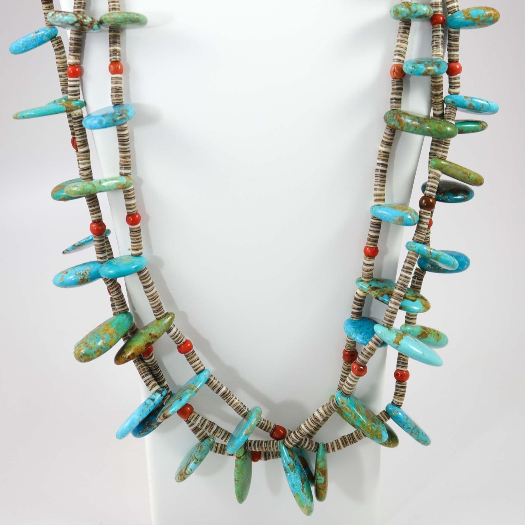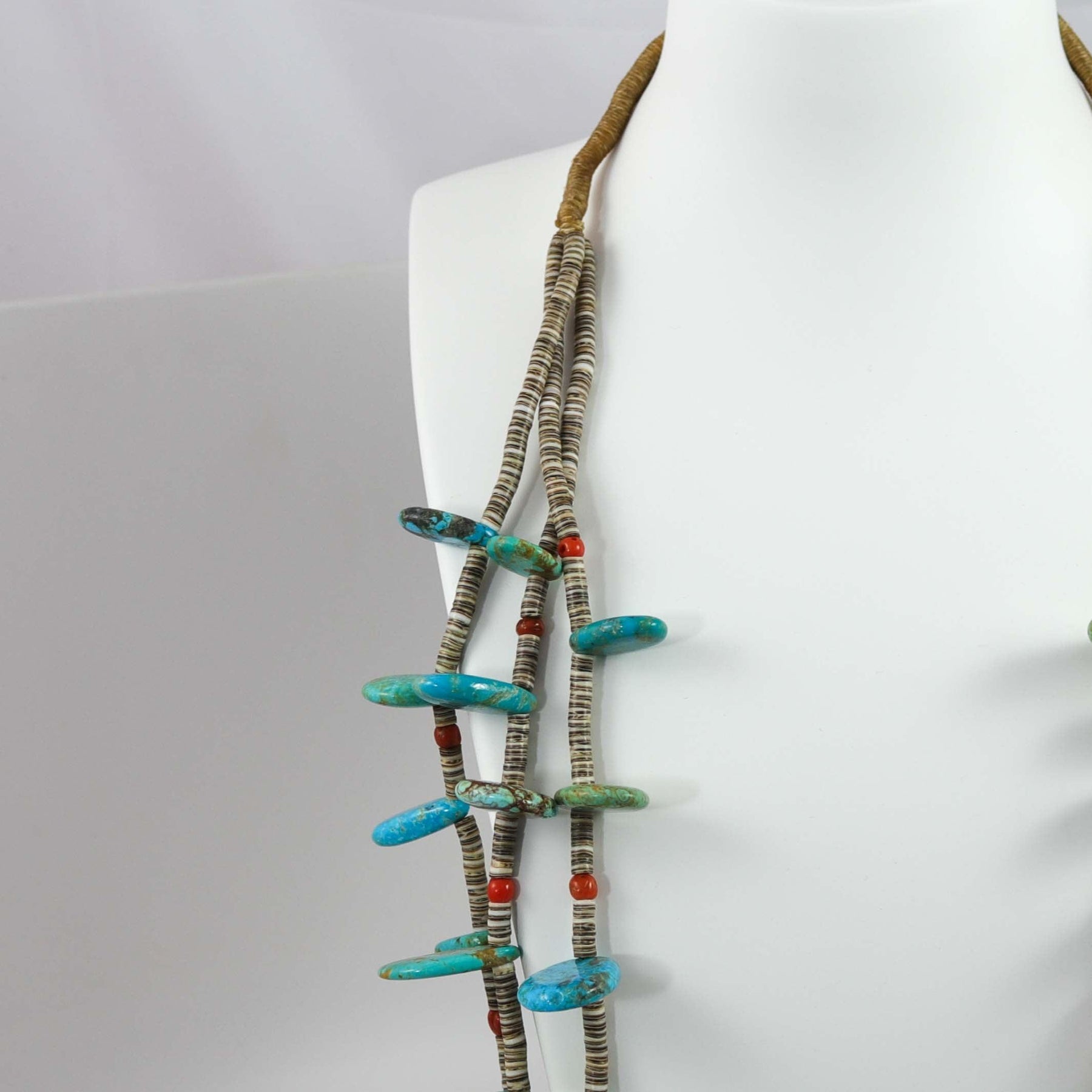 Three Strand Bead Necklace with Hand Rolled Shell Heishi Beads, Stabilized Turquoise Tabs, and Mediterranean Coral Beads. This necklace also features a traditional wrapped backing.