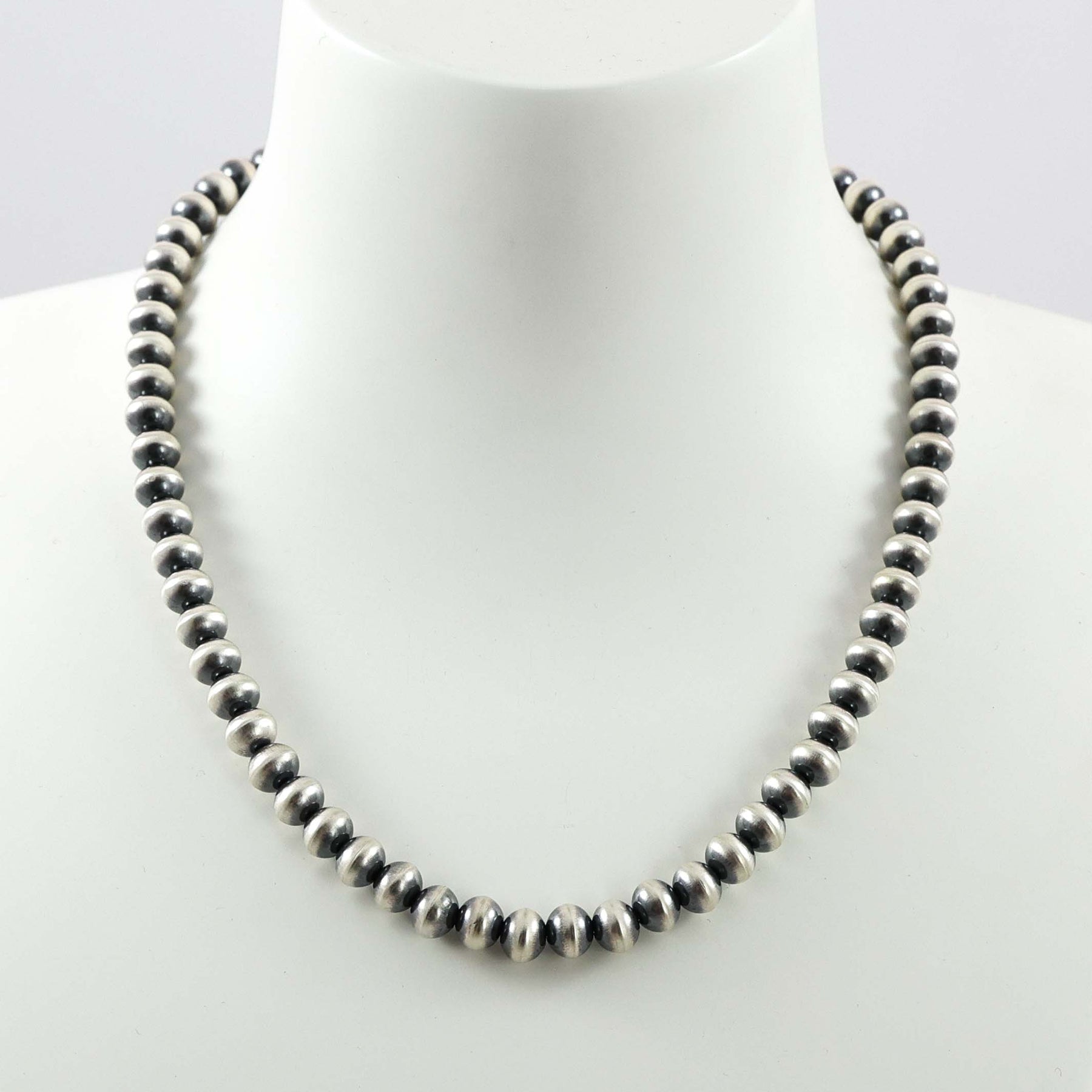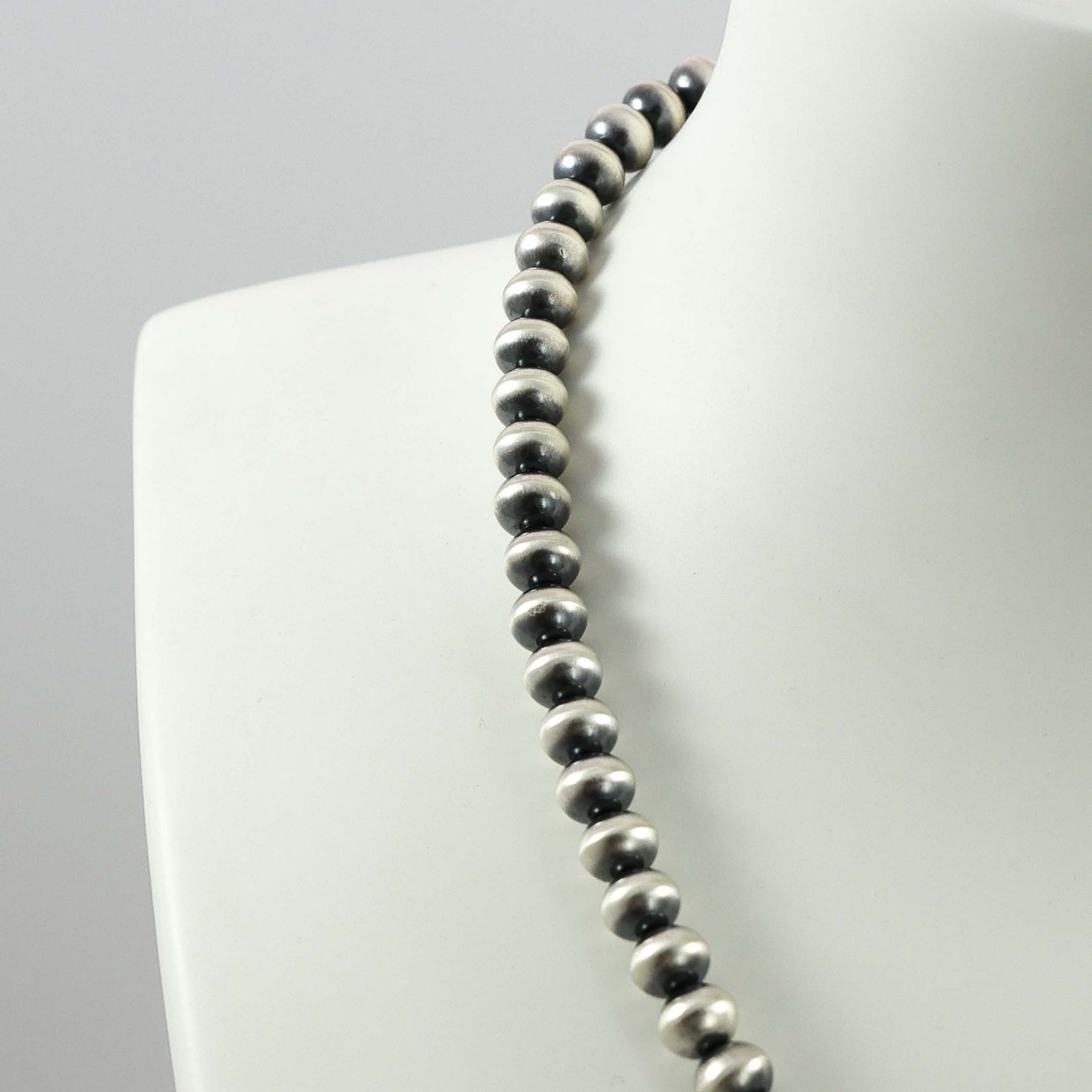 Sterling Silver Navajo Pearl Necklace with Handmade Beads in an Oxidized Finish.