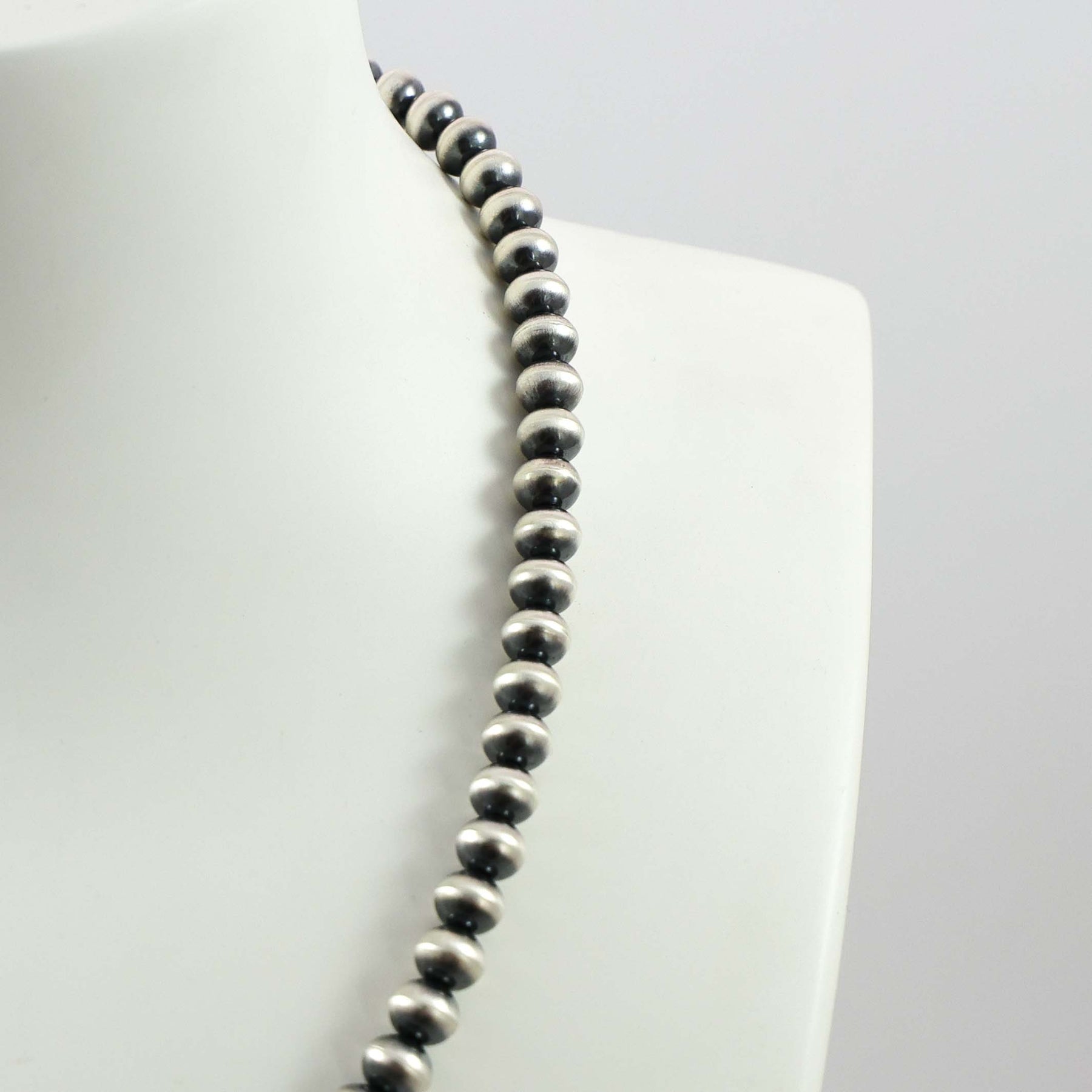 Sterling Silver Navajo Pearl Necklace with Handmade Beads in an Oxidized Finish.