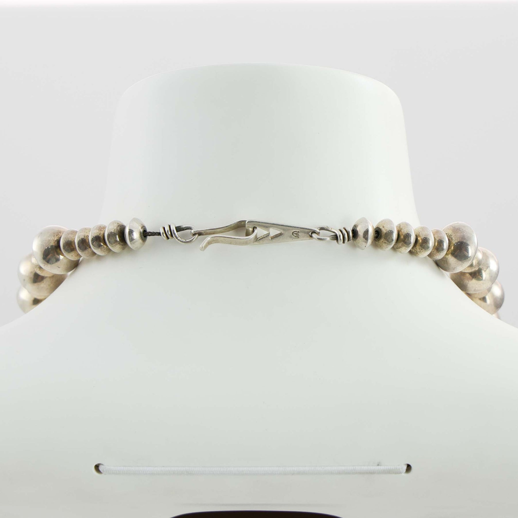 Sterling Silver Navajo Pearl Necklace with Alternating Handmade Beads. This necklace was crafted by award-winning silversmith, Al Joe, in the 2010s.