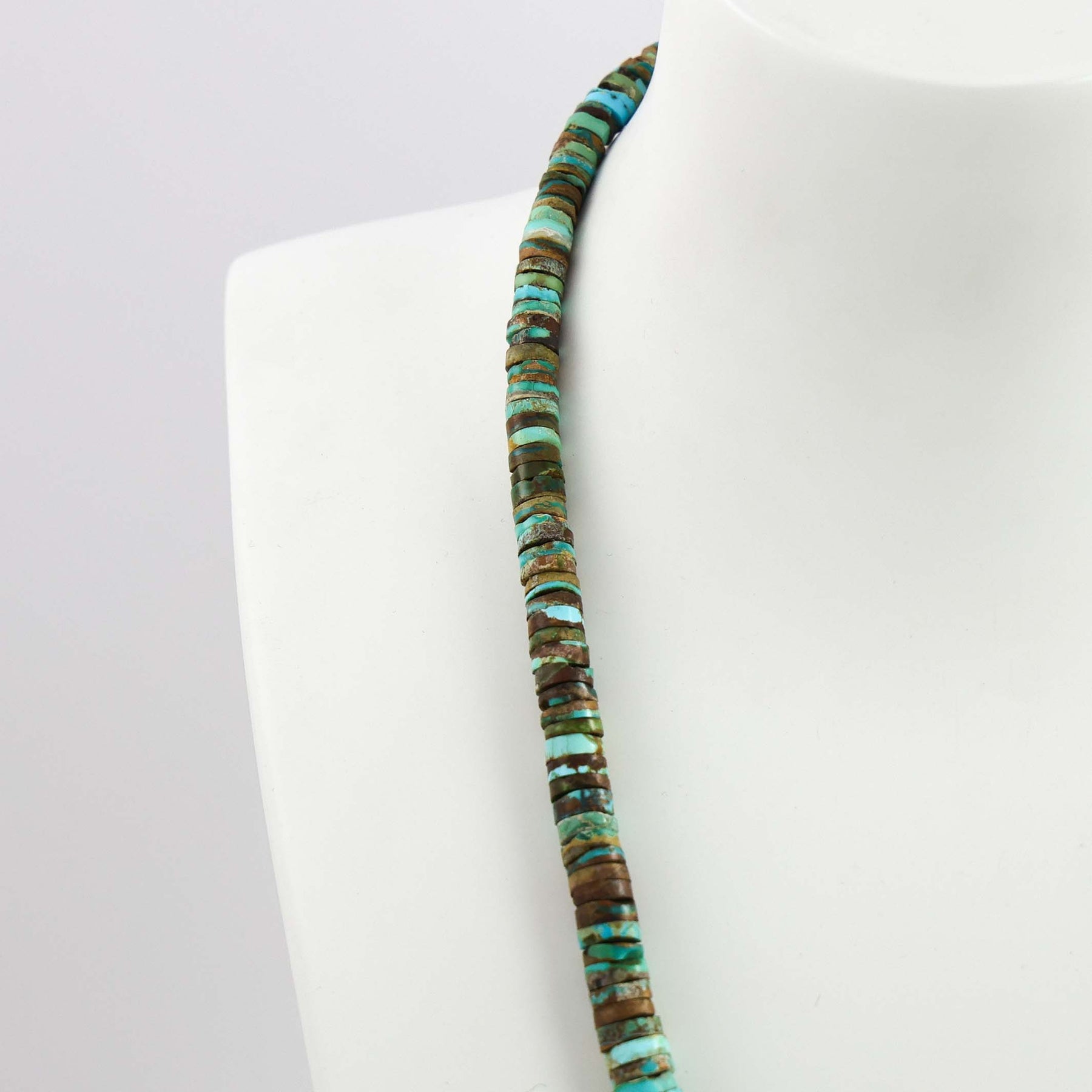 Single Strand Necklace with Hand-Rolled Natural Royston Turquoise Heishi Beads and a Sterling Silver Clasp.