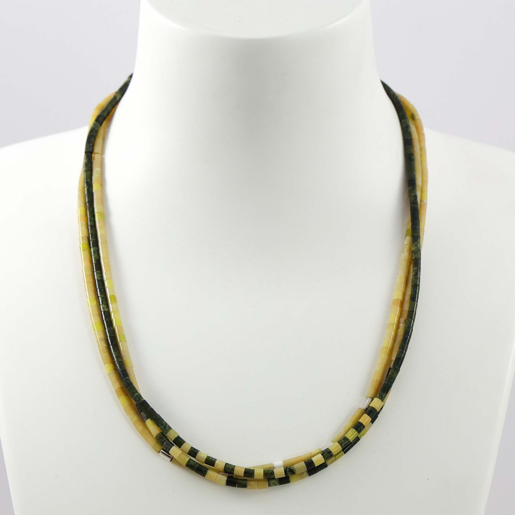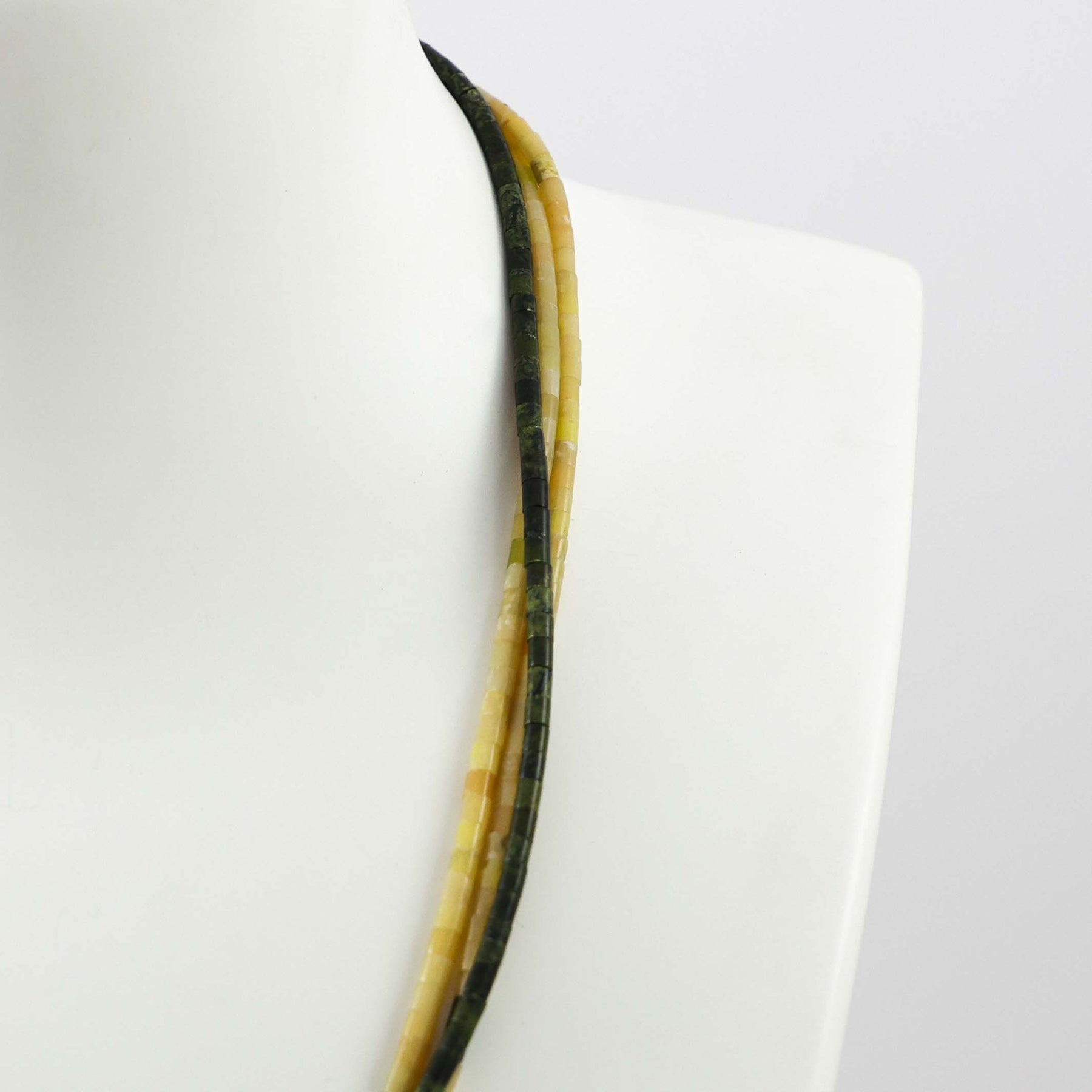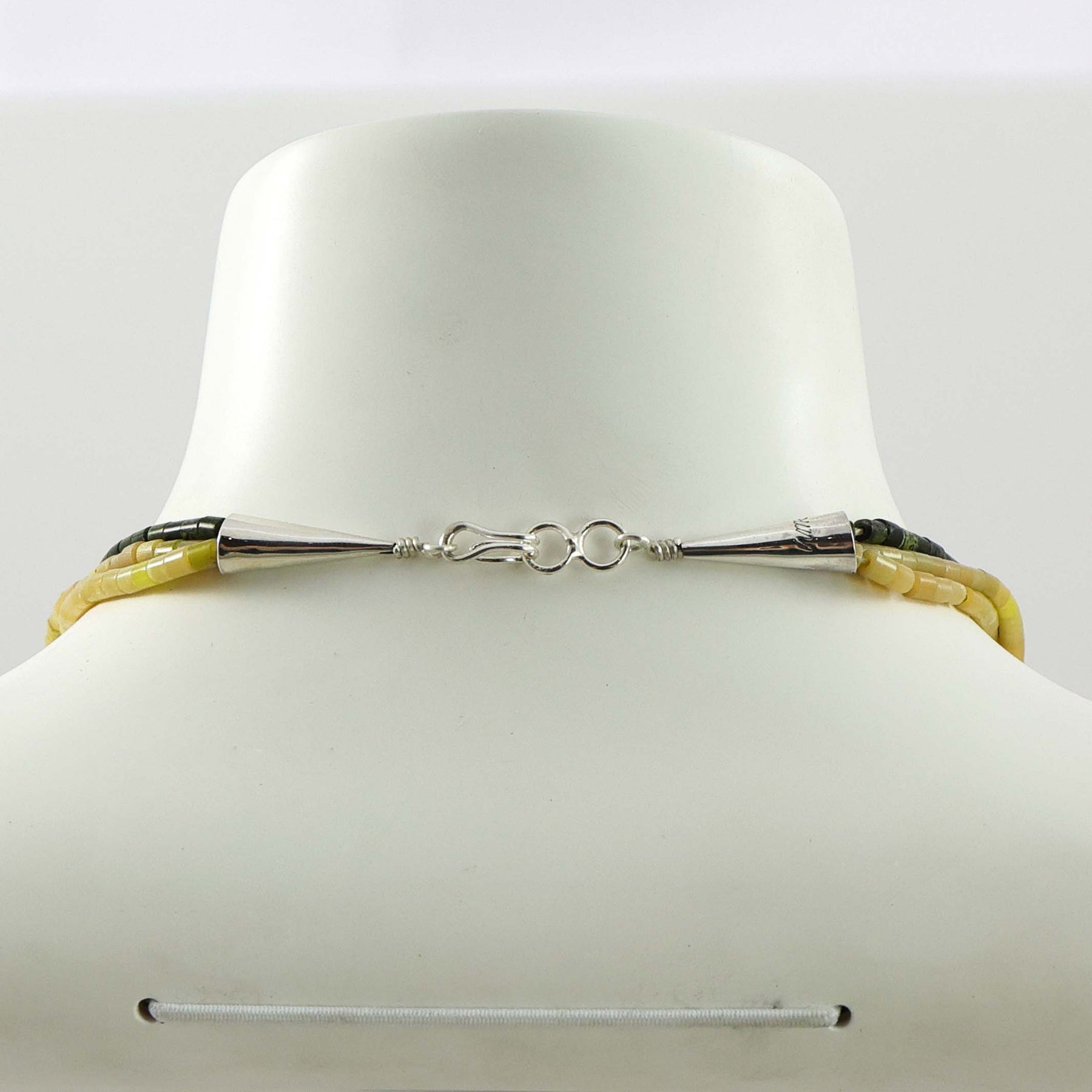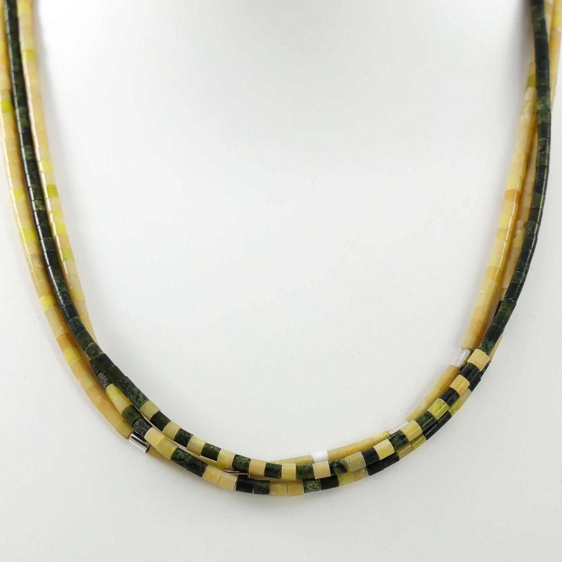 Three Strand Heishi Necklace with Hand-Rolled Serpentine Beads and Hand-Drawn Sterling Silver Beads and Clasp.