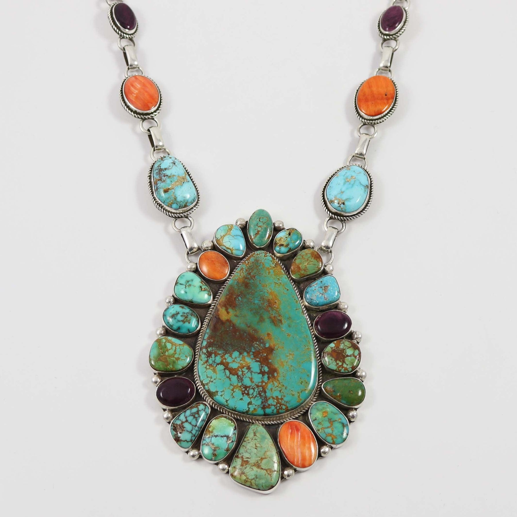 Single Strand Sterling Silver Link Necklace set with Spiny Oyster Shell and Natural Turquoise from the Royston and Kingman Mines.