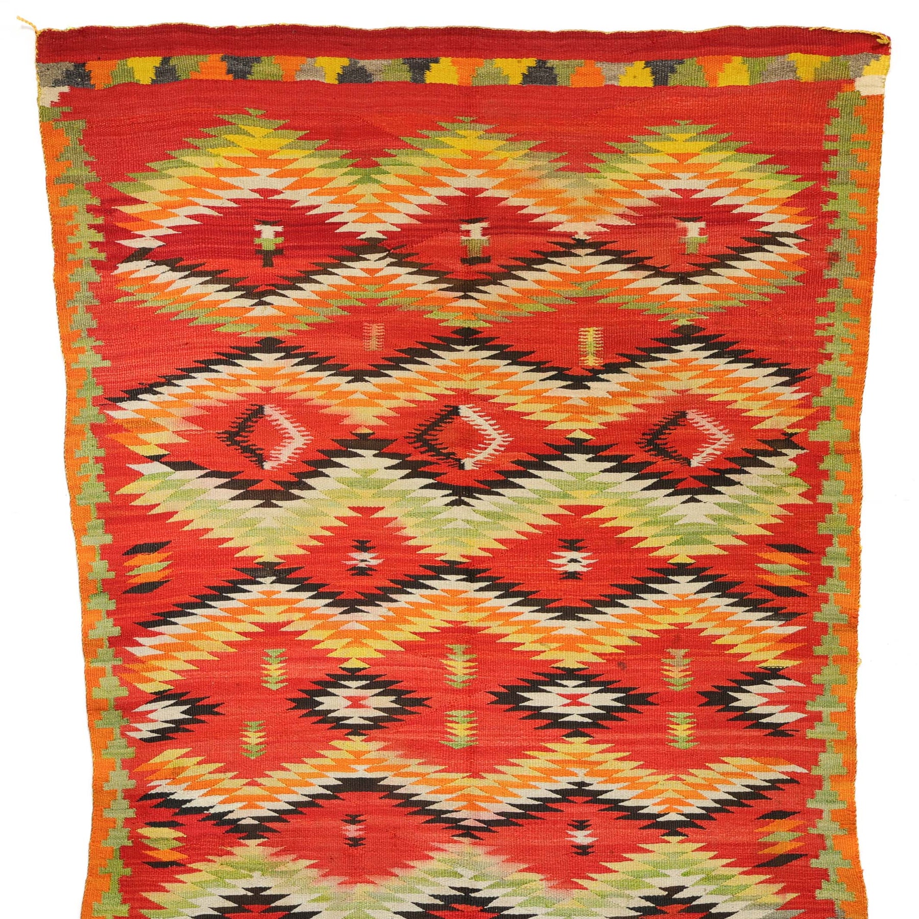 Navajo weavings were originally made as blankets, but during the late 1800s, the arrival of inexpensive machine-woven blankets reduced demand for hand-woven ones. As traders introduced these pieces to tourists for use as rugs and wall hangings, weaving shifted in purpose. The “transitional period” was a time when Navajo weavers were transitioning from weaving blankets to rugs.
