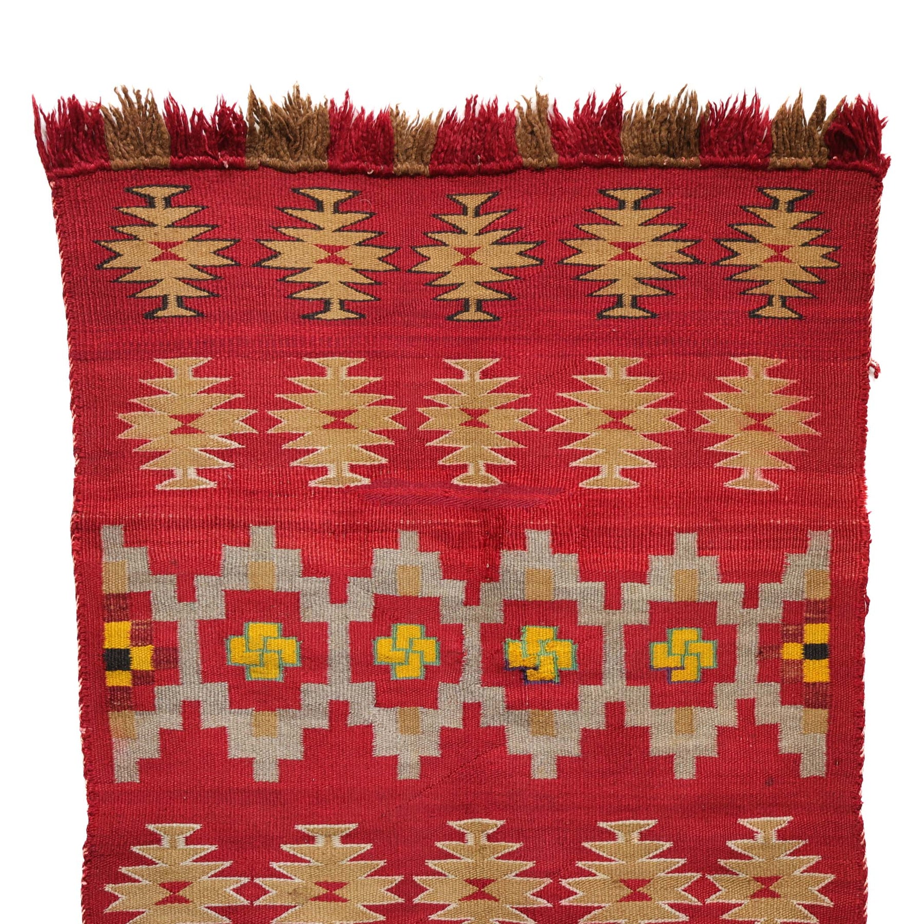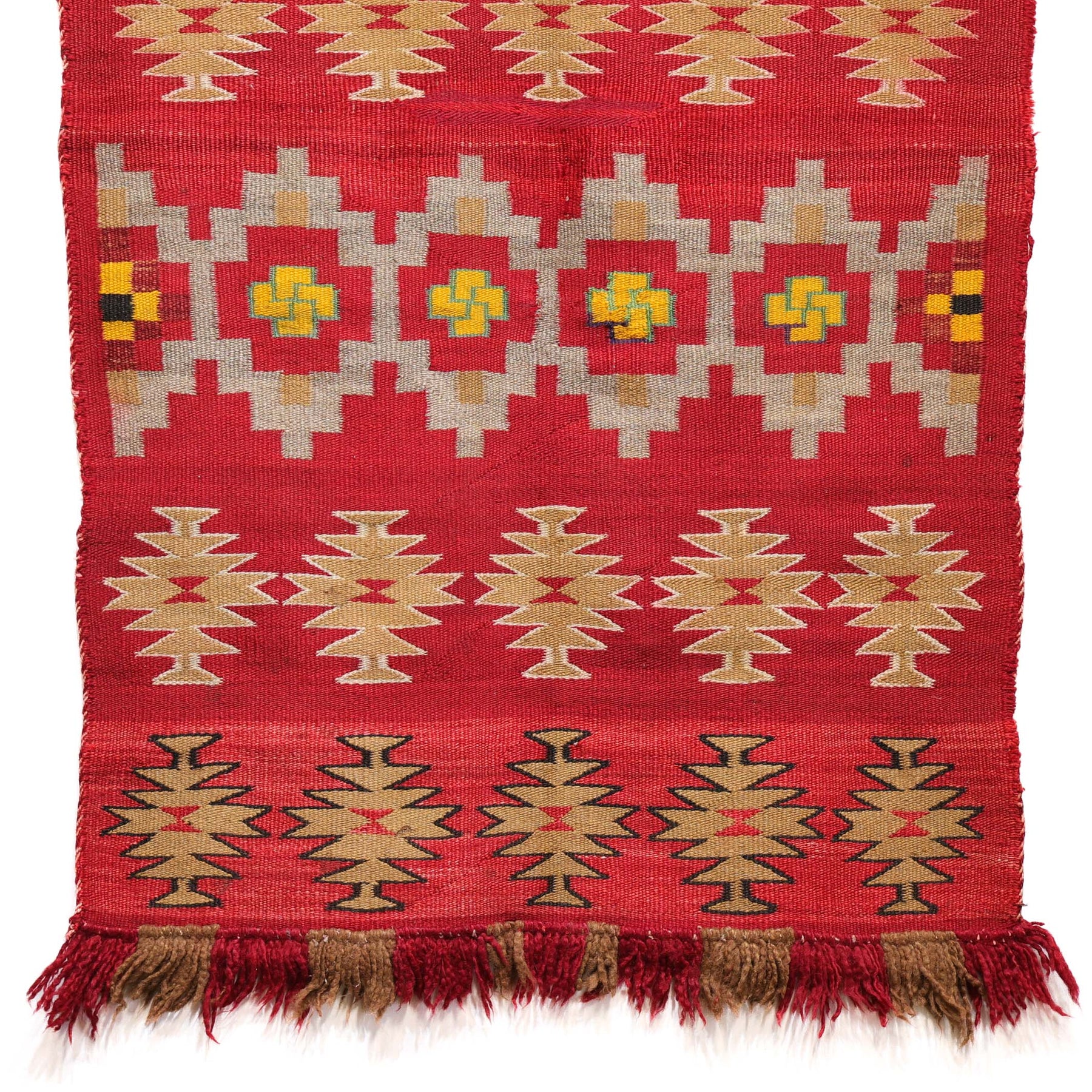 1910 Handwoven Navajo Double Saddle Blanket with Hand-Carded and Spun Wool, Fringe, and Whirling Log Design Elements. This weaving has some slight fading but is in great overall condition.