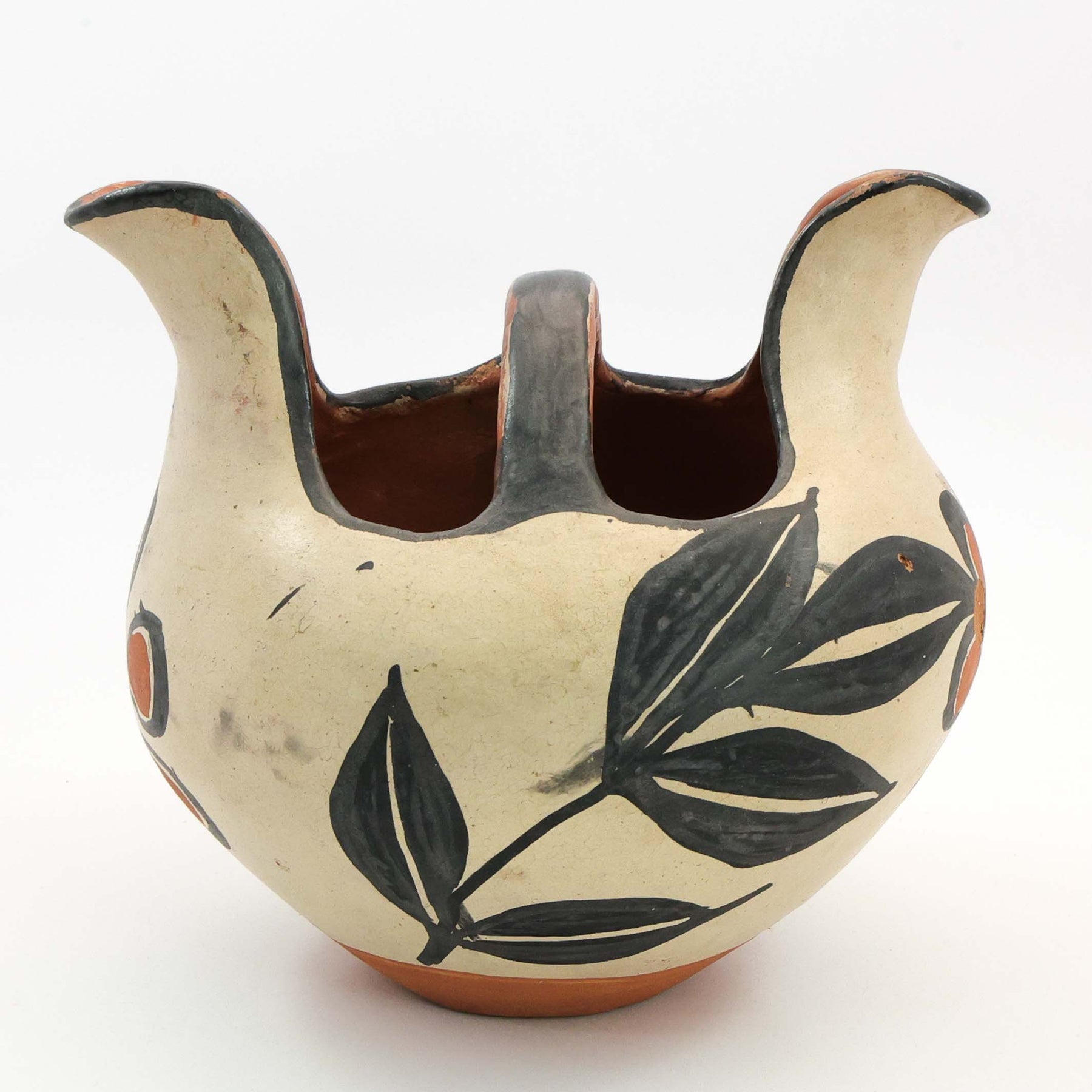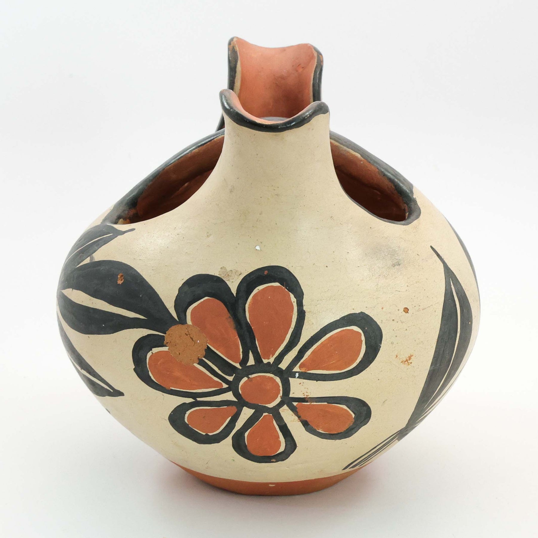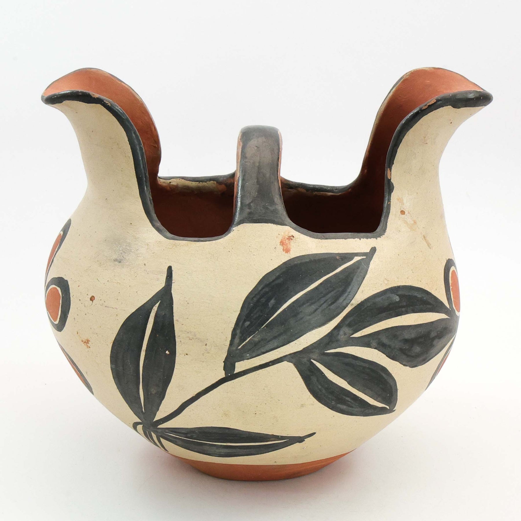 1930s Santo Domingo (Kewa) pottery canteen with two spouts and a central carrying bridge, hand-coiled from natural clay and painted with traditional mineral pigments. The body features classic Santo Domingo floral and leaf motifs in black and brick-red against a cream slip, with visible wear consistent with age including some chips on the surface (see photos). A well-formed early 20th-century example showing the bold, expressive design work characteristic of the period.