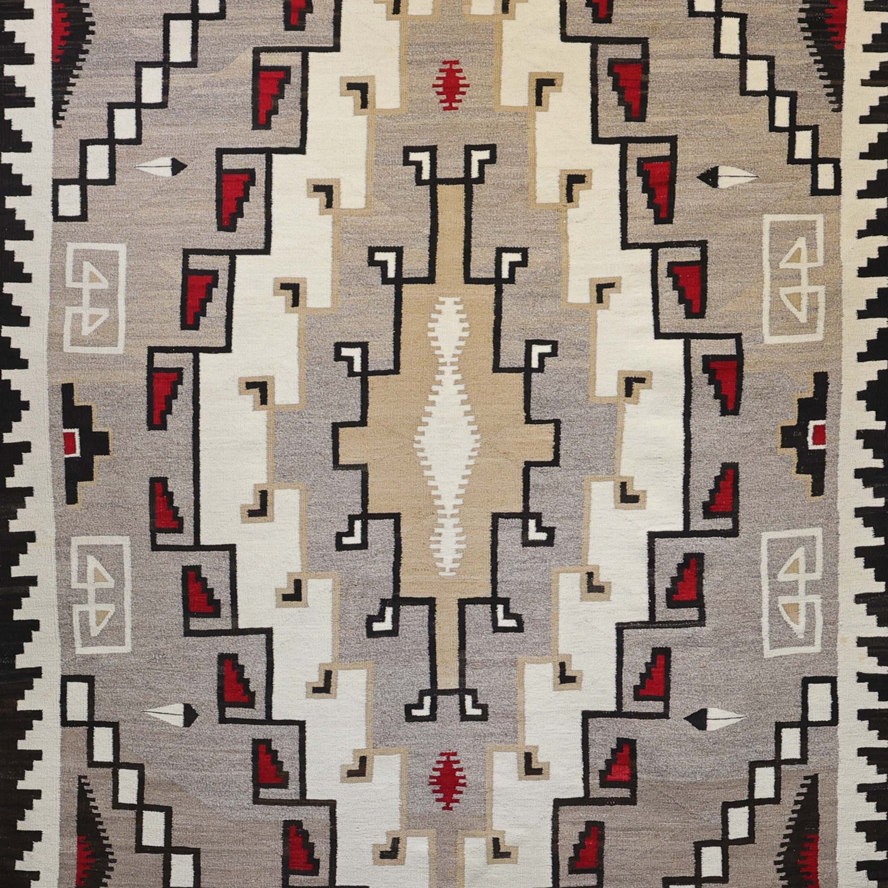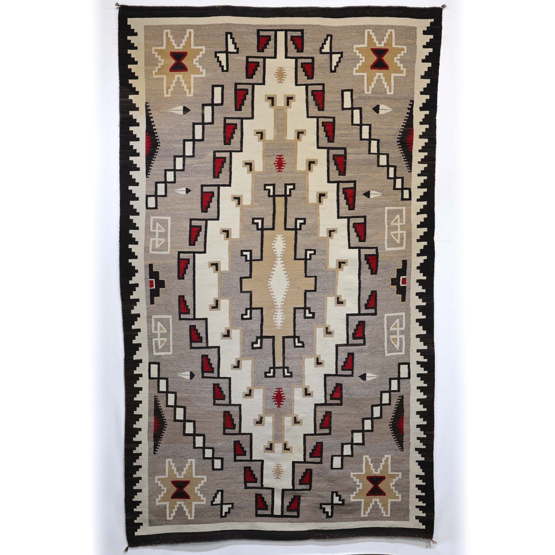 1940s Handwoven Navajo Klagetoh Weaving using Hand-Carded and Spun Wool with Natural Undyed Colors and Red Accents. The design features a large central diamond motif with vallero stars in each corner and charming details throughout.