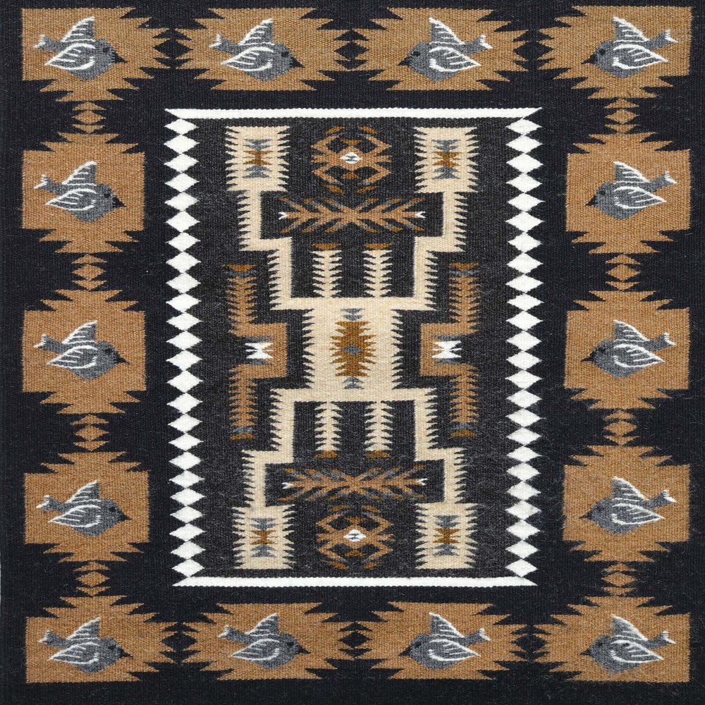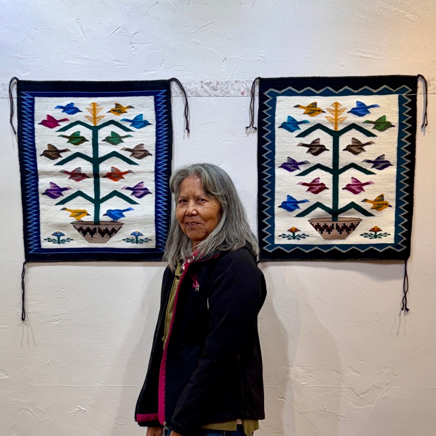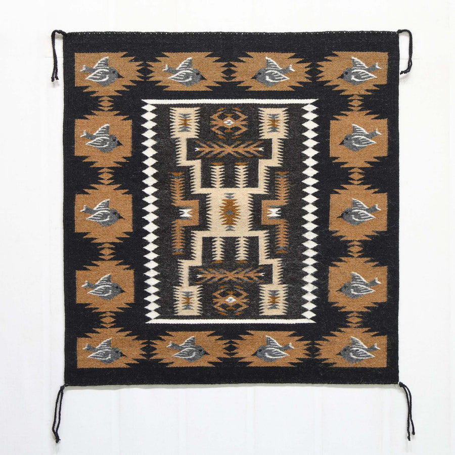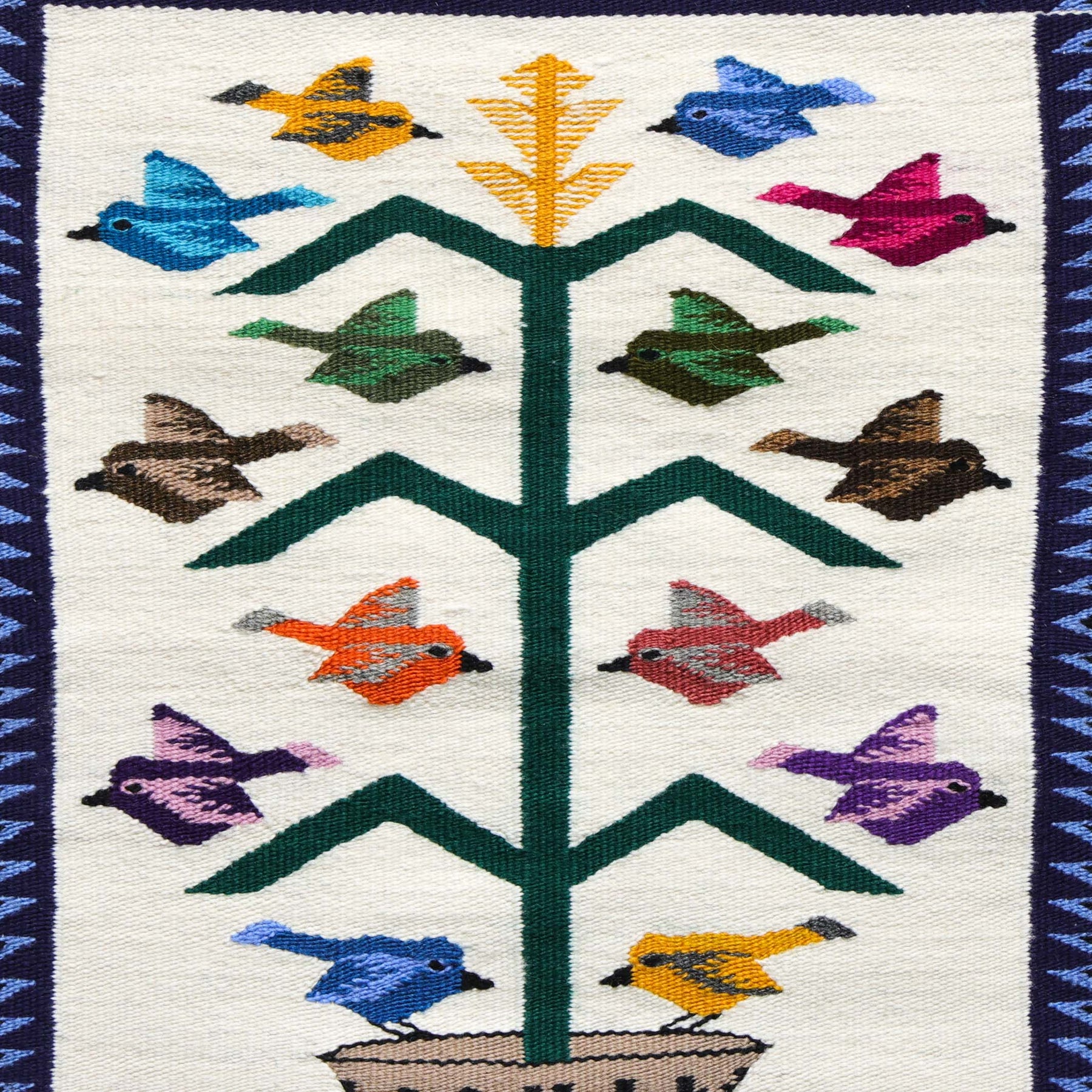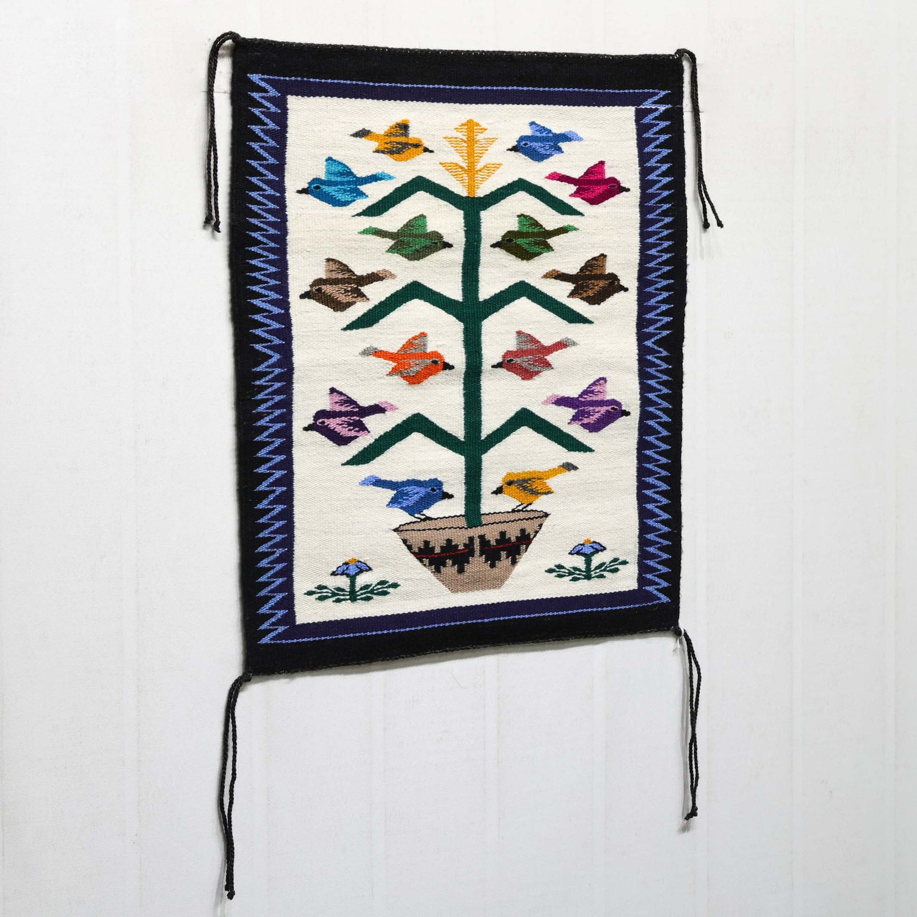 This Bird Pictorial (Tree of Life) by Navajo artist Belinda Slim depicts a central cornstalk rising from a traditional wedding basket, surrounded by colorful birds in flight. The bright birds - woven in yellow, blue, green, purple, red, pink, and brown - stand out against a clean white background, framed by a black border with zigzag accents.