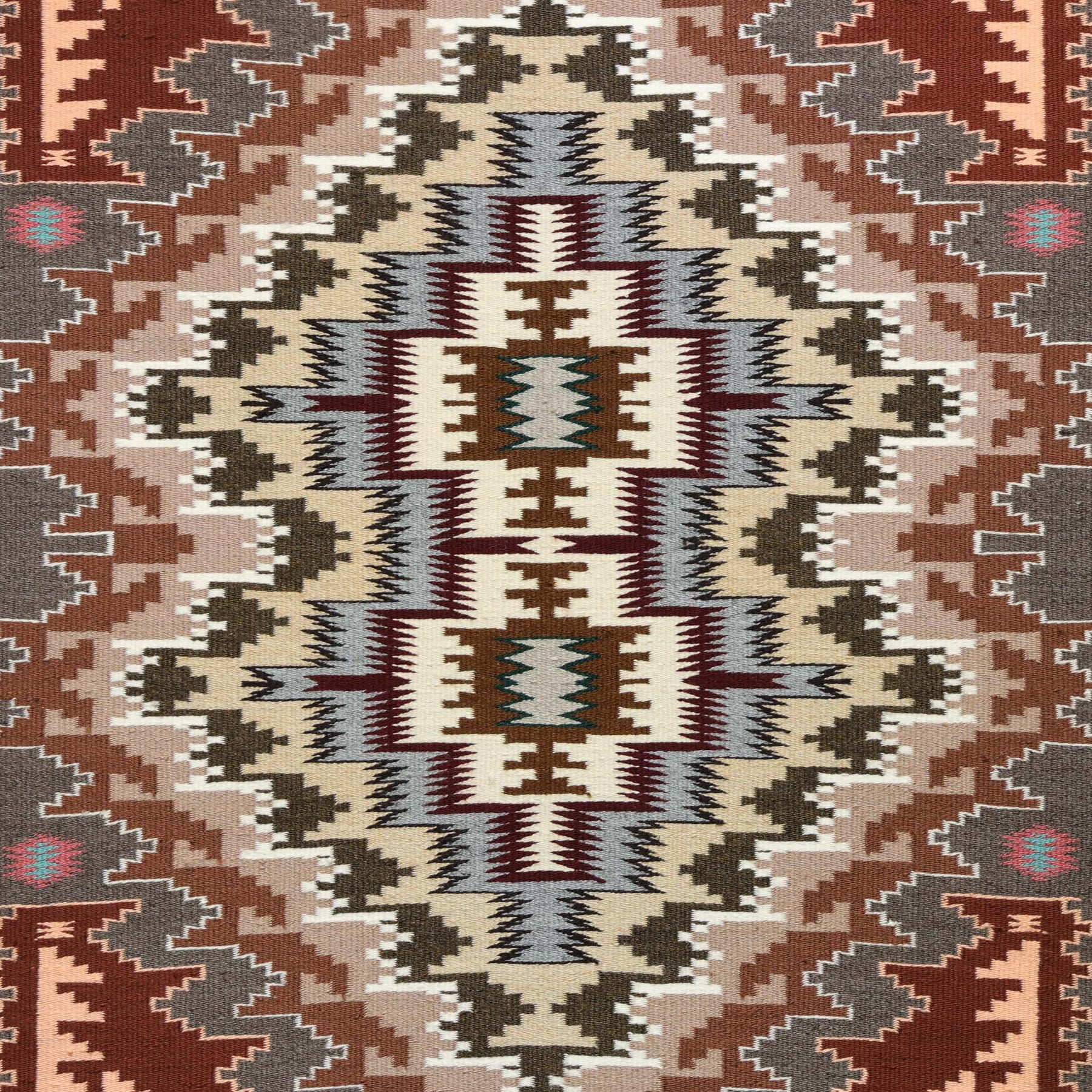 A dramatic central diamond medallion radiates outward through serrated zigzags, stepped terraces, and feathered edges, accented by subtle floral motifs in turquoise and pink.