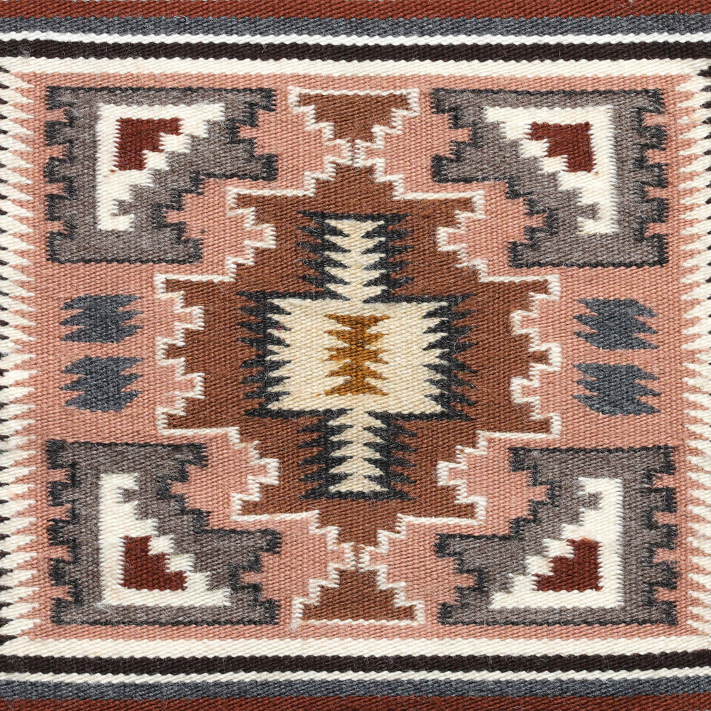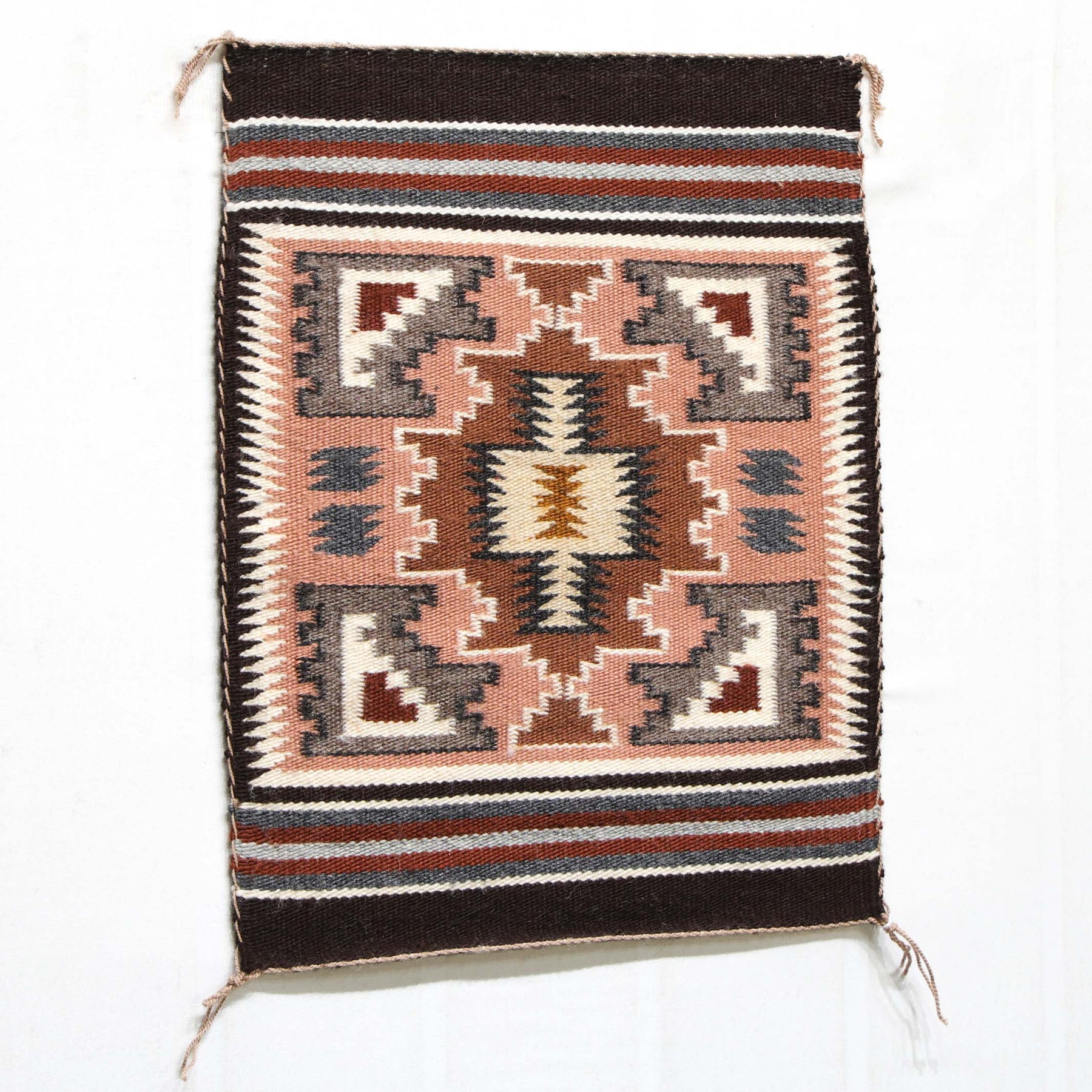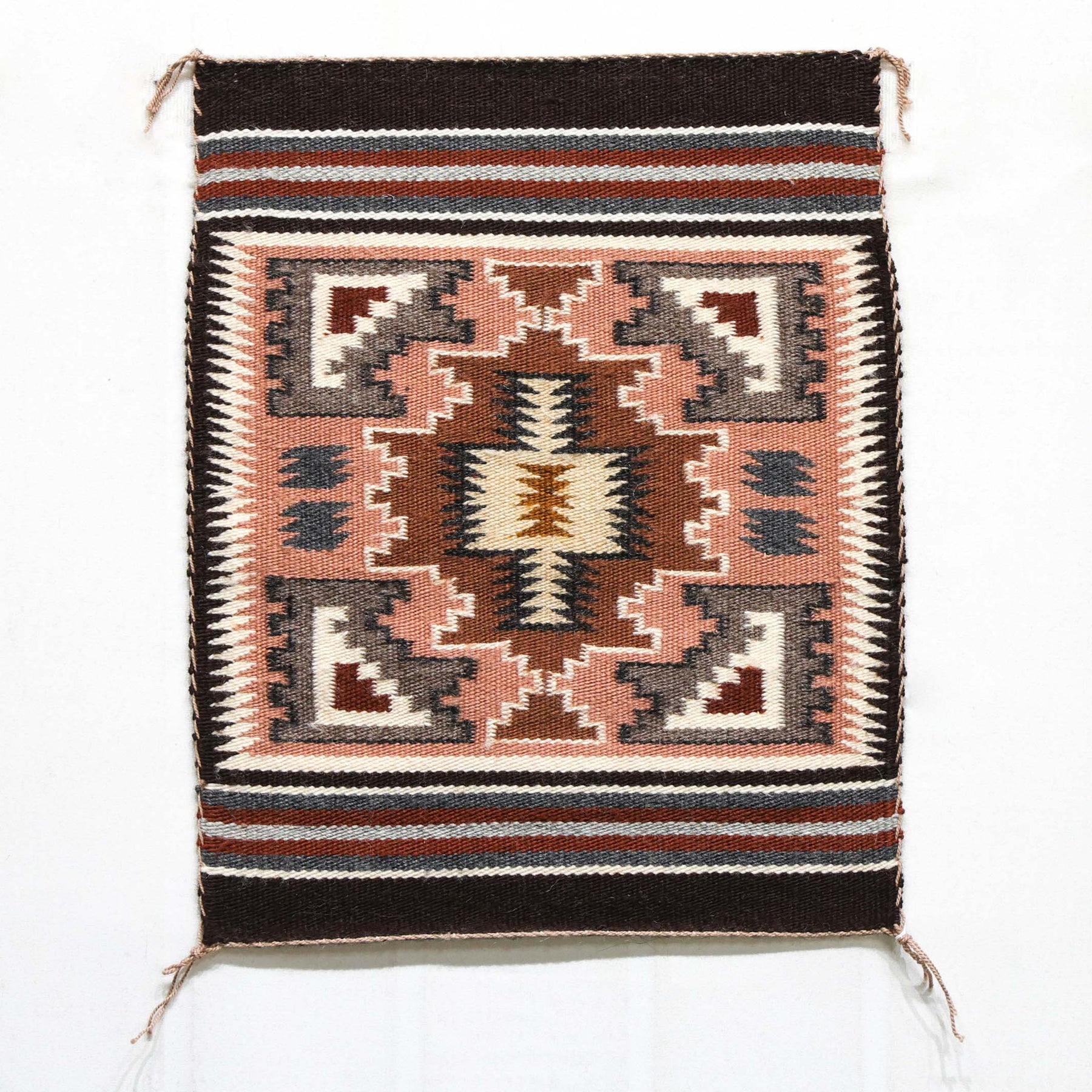 This small Burntwater style weaving by skilled Navajo artist Roselyn Begay features a bold central medallion featuring stepped terraces, serrated zigzags, and hooked motifs radiates outward on a warm terracotta ground, framed by striped borders in black, gray, rust, and cream.
